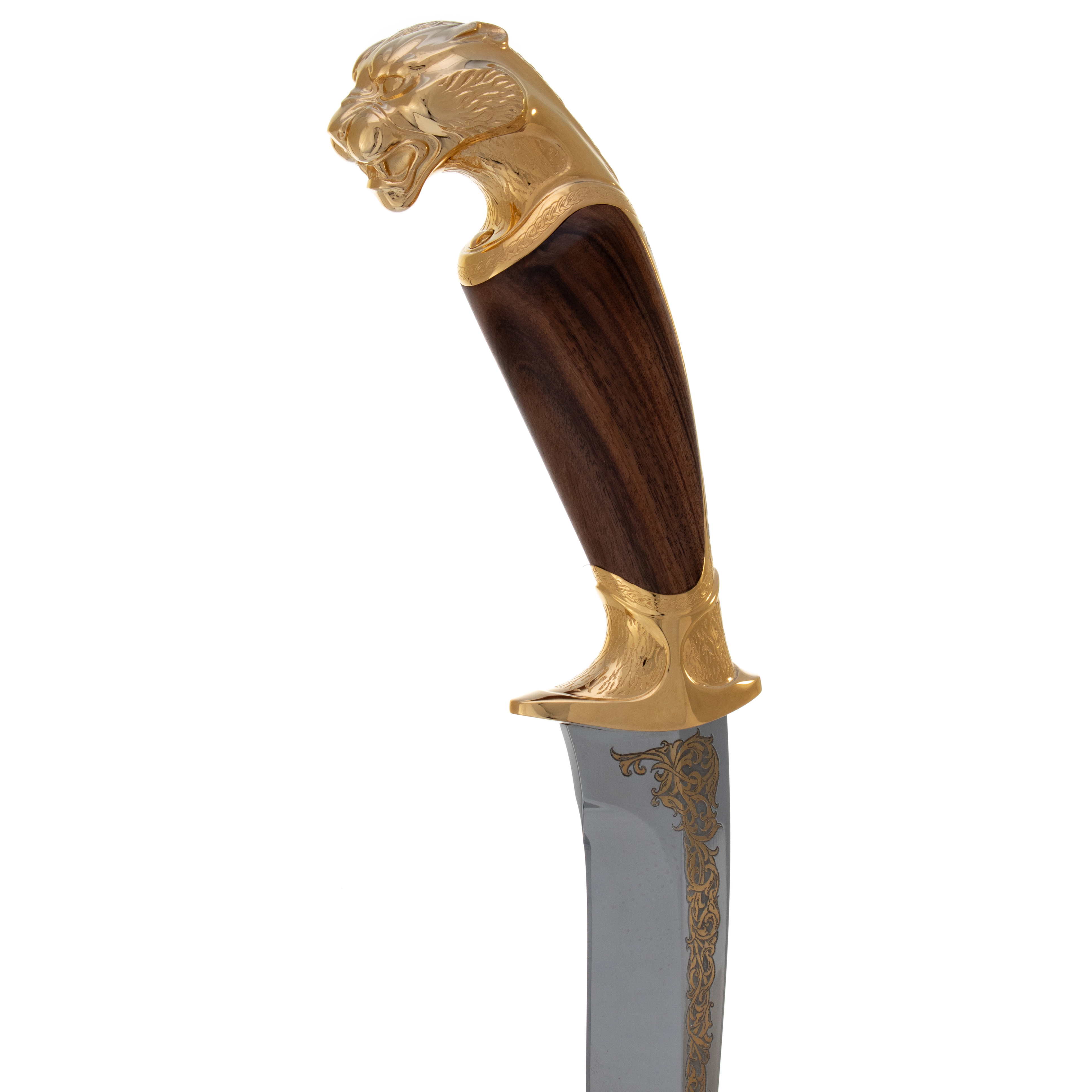 The Bebut is made in accordance with all the parameters of the main weapon of the Russian gunners. The wide curved blade is decorated with 999 gold with multi-stage engraving and blackening on silver. The exclusive pattern was etched in the oven, which made it more expressive and voluminous. The handle is made of birch cap, a special underground growth of birch. This wood is especially appreciated by decorators due to its bizarre natural pattern, which has no analogues in the world. The hilt is crowned by the head of a lioness with a predatory grin, covered with a golden veil.