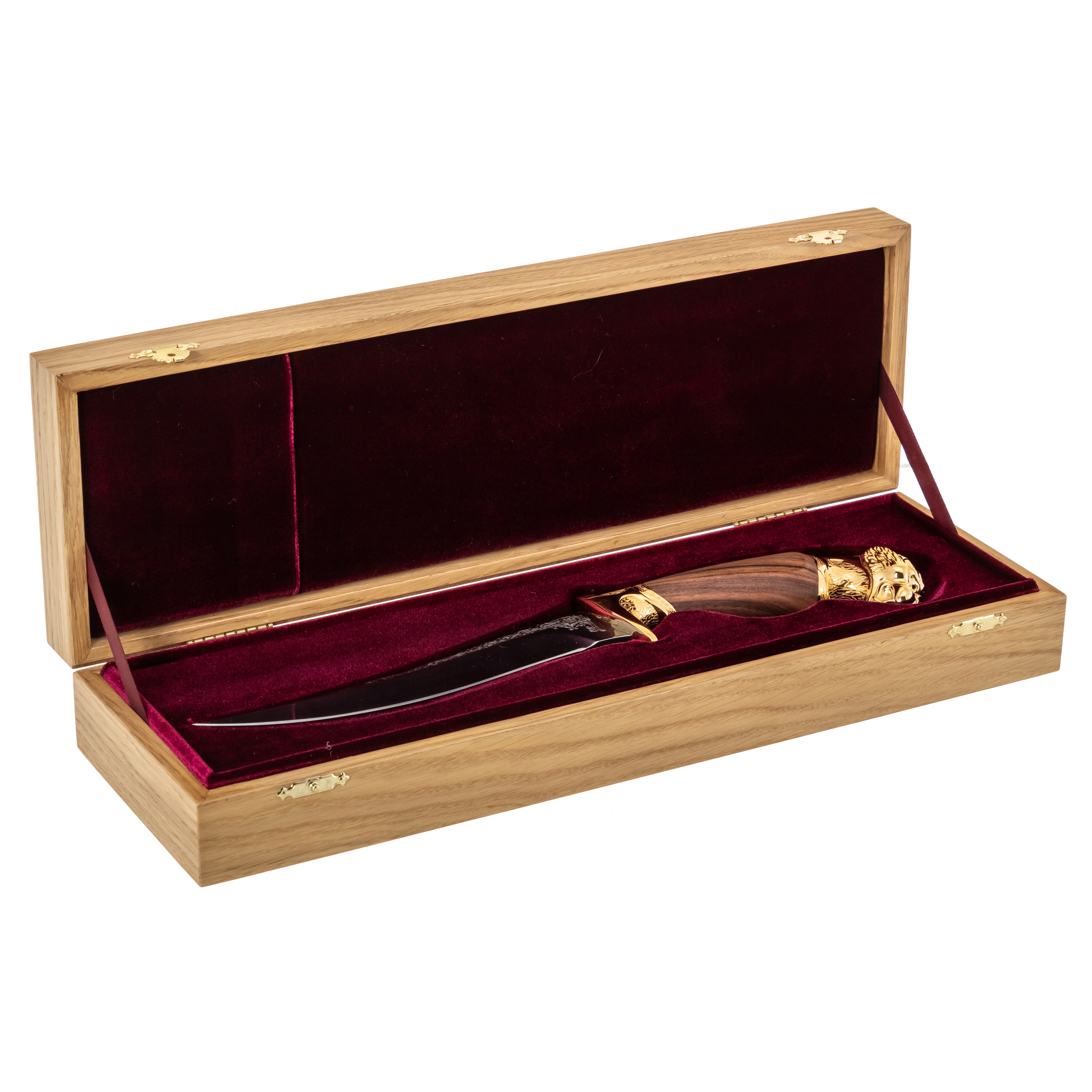 The dagger-bebut “Lord” from the masters of Zlatoust is an incredibly beautiful decorative handmade weapon. It will become an indispensable gift for connoisseurs of exclusive items, collectors, aesthetes, who are not deprived of brutality and fortitude. The powerful blade and hilt with a gold-plated lioness's head are admired for the fine work of gunsmiths.