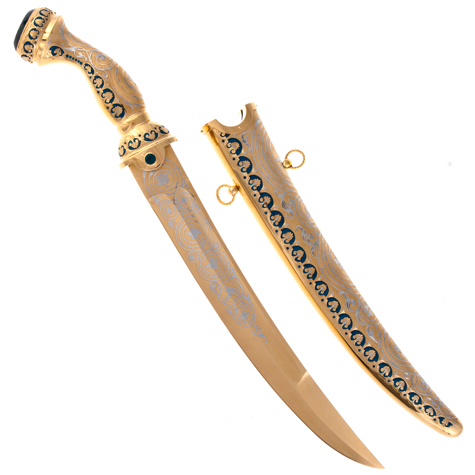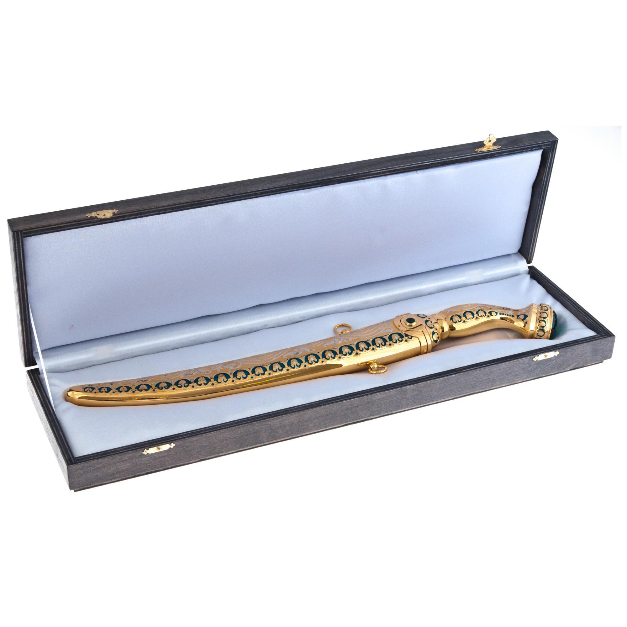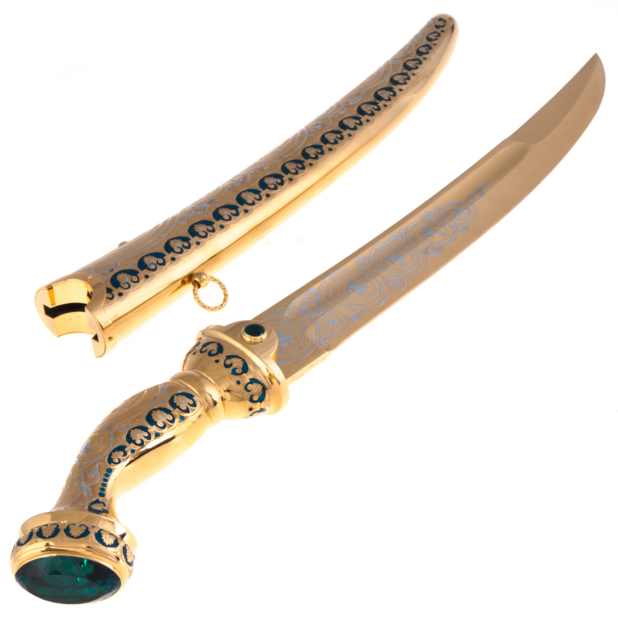 Zlatoust craftsmen observed all the parameters of the dagger, manually sharpening its blade, hilt and scabbard. The 999 gold veil is applied to a durable brass surface and decorated with elaborate patterns. A multi-stage engraving with a needle and a chisel is performed on top of the sketch applied with a brush. At the final stage, all the elements of the product were etched in the oven. Due to this, the decor began to look more voluminous and expressive. Fragments of the pattern with emerald enamels contrast favorably with gilding. The inlay of the handle with cubic zirconia of a dark green shade completes the overall concept of the product.