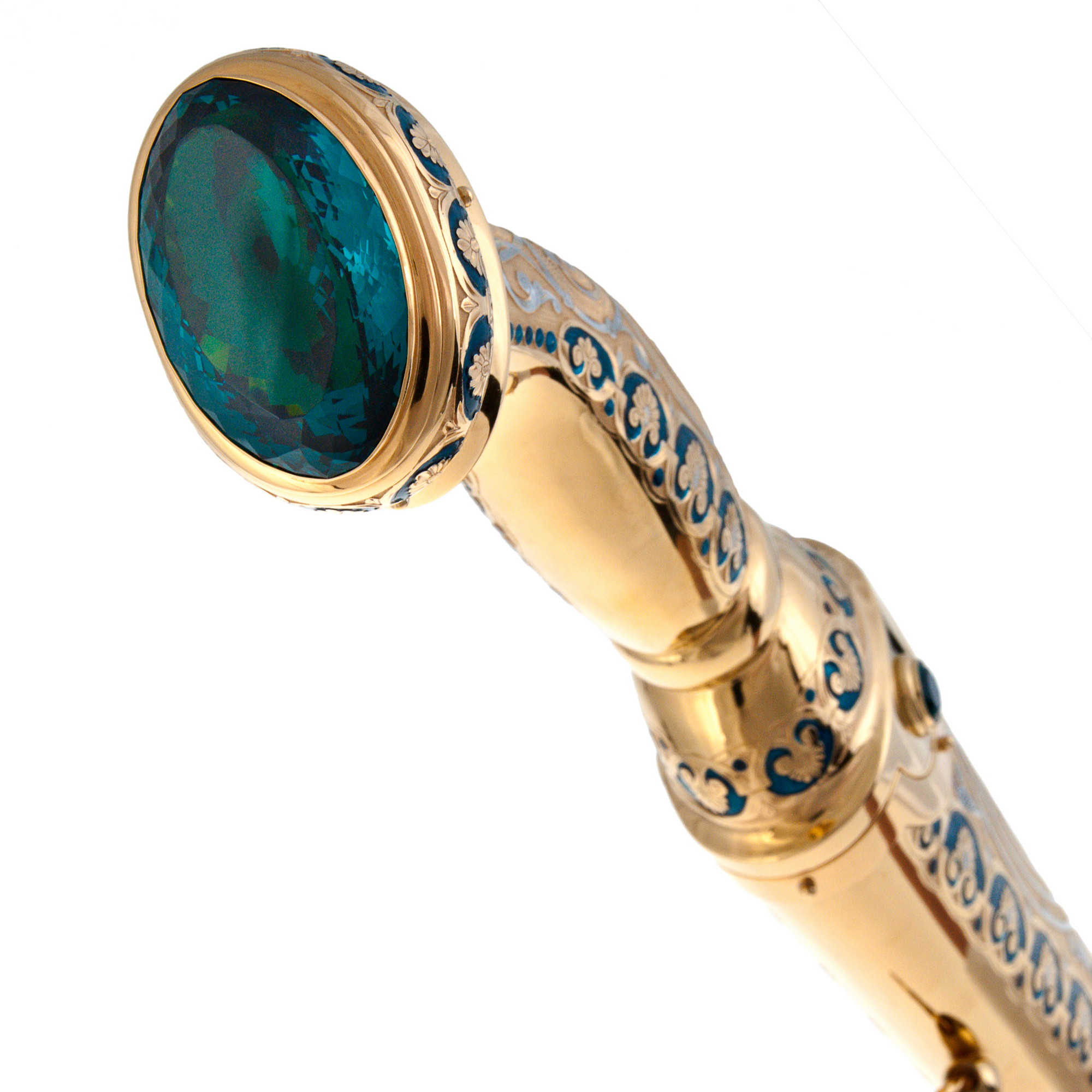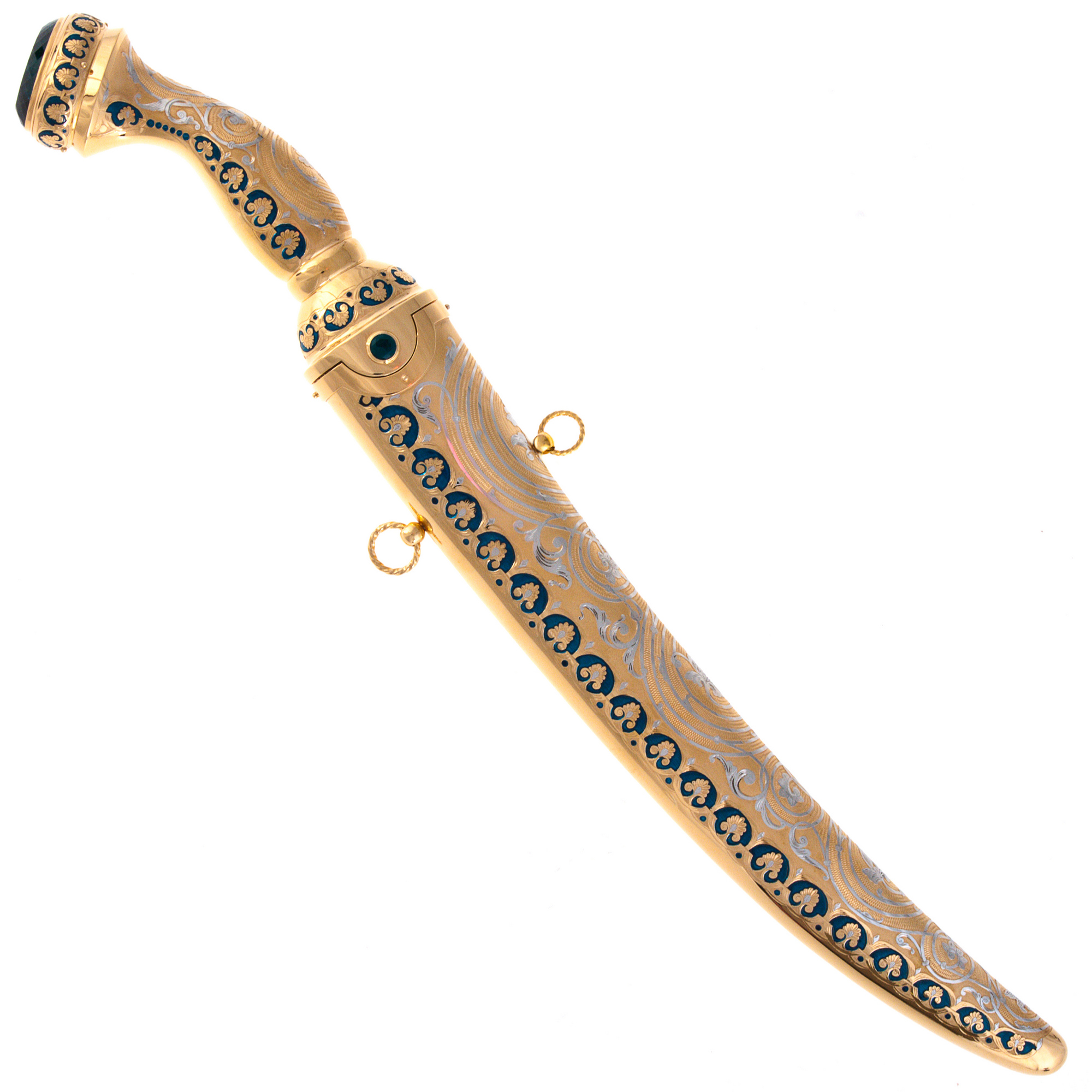 Materials:brass, Damascus steel, enamels, cubic zirconia, gilding, nickel.