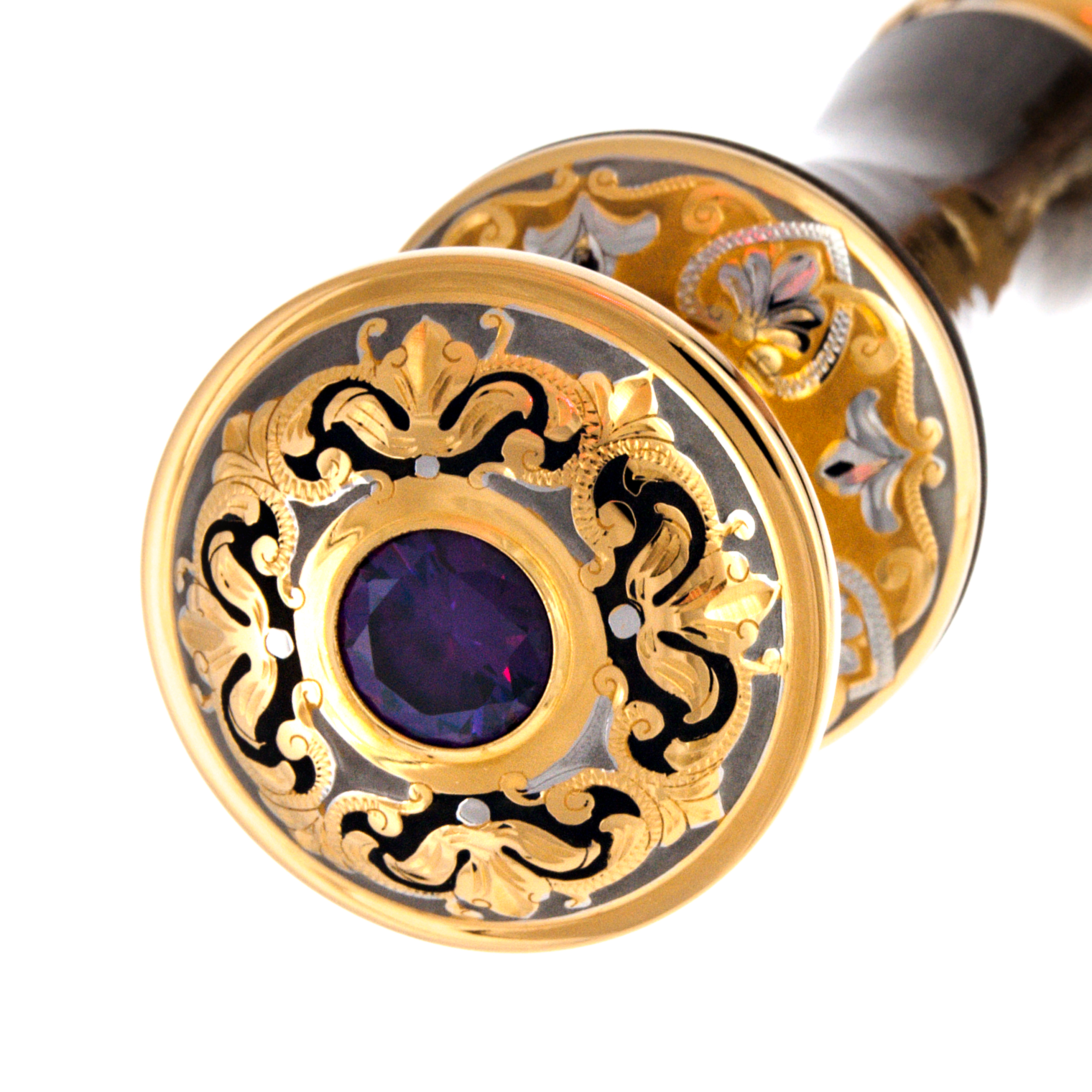 The dagger is made with strict observance of all parameters of this type of weapon. For a long time, such a dagger has been used in fencing to repel enemy attacks. It was considered an essential attribute of knights' equipment. The short powerful blade is covered with a golden veil over a lightweight (total weight of the product is only 1.2 kg) and durable alloy of steel and brass. On the gold, the artists filigreed a floral ornament, and the engravers brought it to perfection with a needle and a chisel. After etching in the oven, the decor gained the necessary volume and expressiveness. Blackening on silver in the form of velvety sections of the pattern gives the blade an additional chic. The engraving technique also includes a scabbard and the base of the handle, which is inlaid with dozens of amethysts with a diameter from 1 to 13 mm.