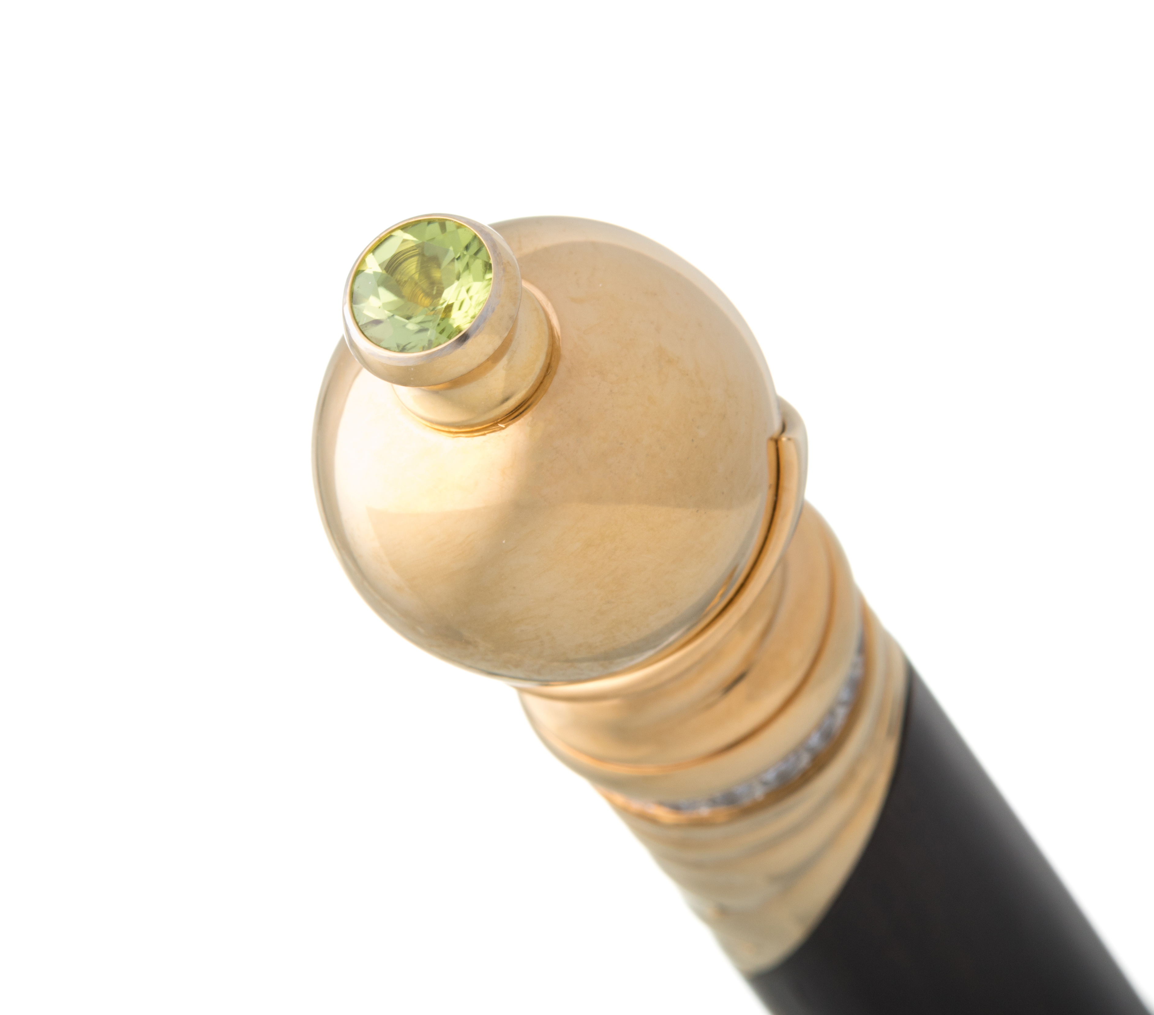 The stiletto is made in full accordance with the parameters of this famous weapon of Italian origin. By its very appearance, a stiletto made of a durable alloy of brass and steel inspires respect and admiration. The powerful triangular blade is topped with an original wooden handle decorated with 999 gold. The unique pattern on the precious metal was created by the artist and brought to perfection by engravers. The luxury of the product is added by light green and transparent cubic zirconia on the handle.