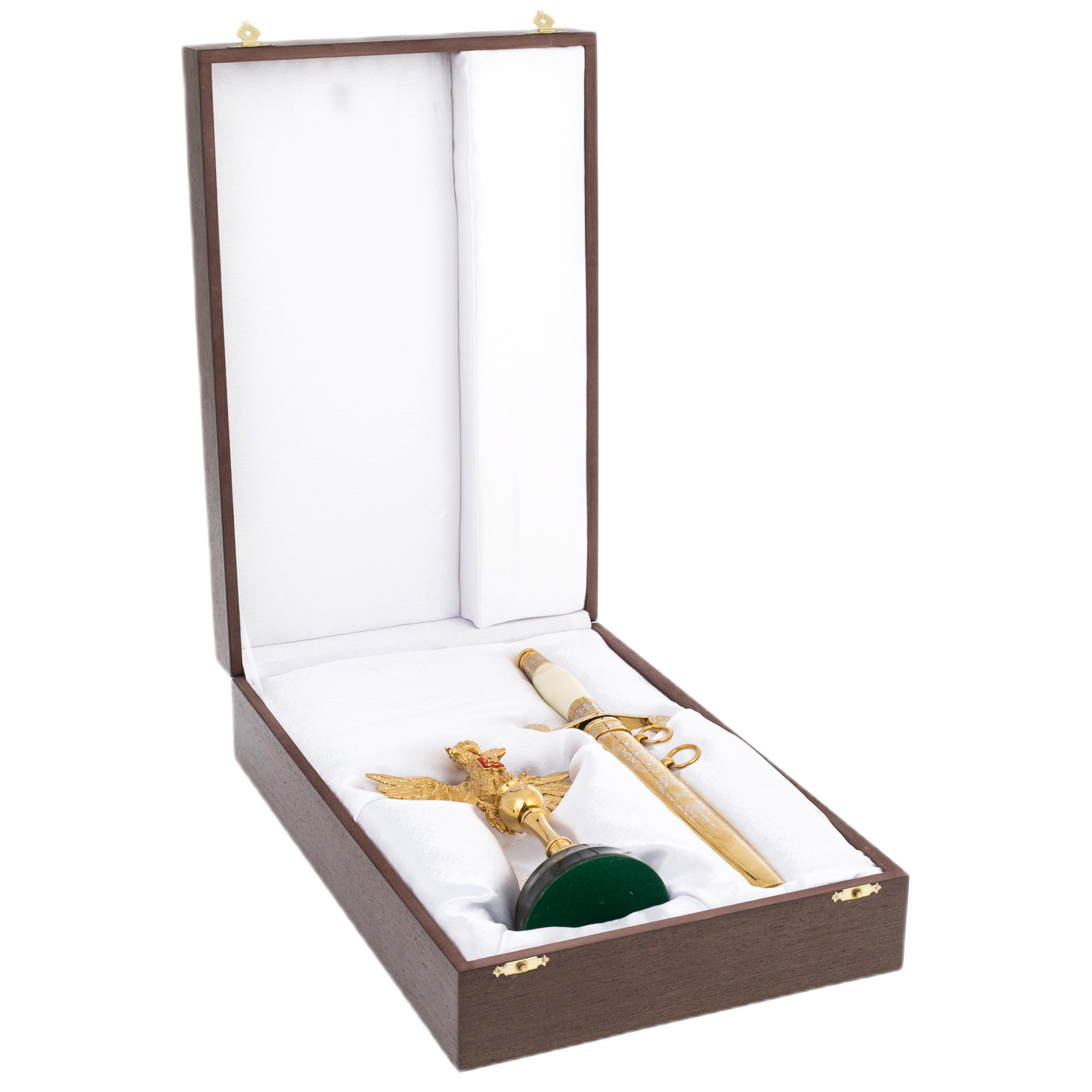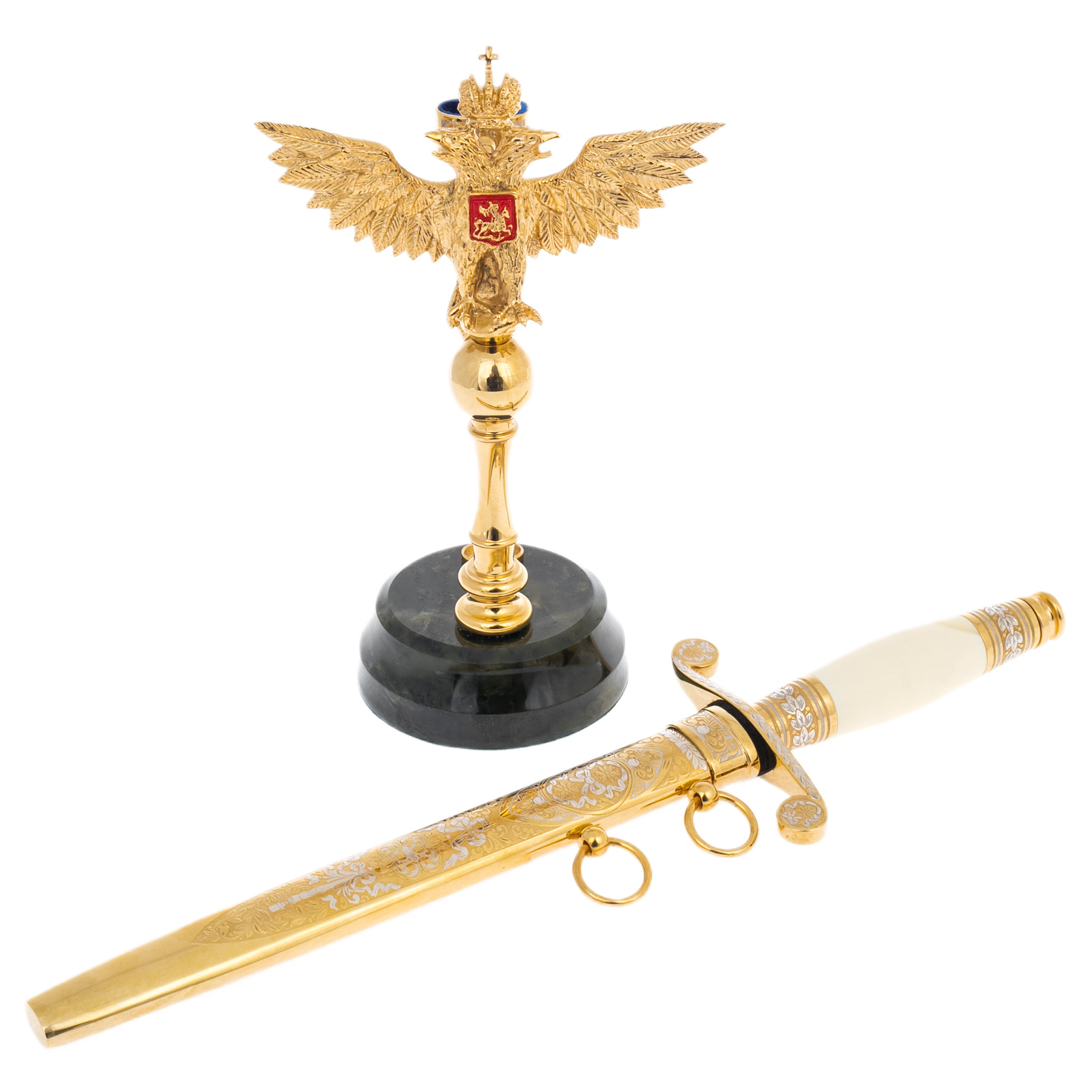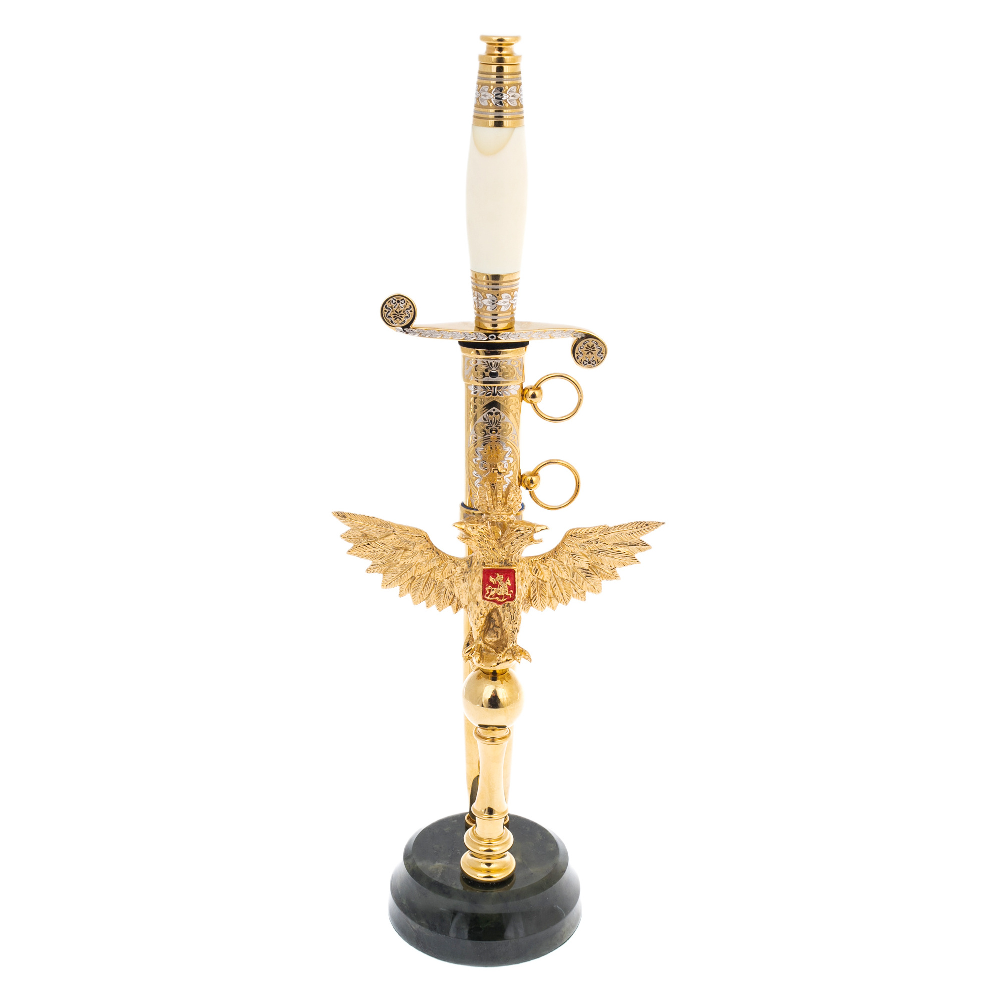 Сувенирный кортик «Россия» на подставке из нефрита — образец высокого оружейного искусства, предназначенный для коллекционеров, государственных деятелей и эстетов с утонченным вкусом. Лезвие, инкрустированное гравировкой и покрытое благородным золотом, заключено в ножны, украшенные филигранным орнаментом и растительными мотивами. Рукоять выполнена из светлого материала, стилизованного под кость или бивень, а гарда обрамлена узорчатой насечкой с золотистым сиянием. Символ державной мощи — двуглавый орел с гербом в лапах — венчает подставку, выточенную из темного нефрита с зеркально отполированной поверхностью. Сочетание блеска металла и глубины камня создает ощущение безмолвного величия, достойного кабинета первого лица.