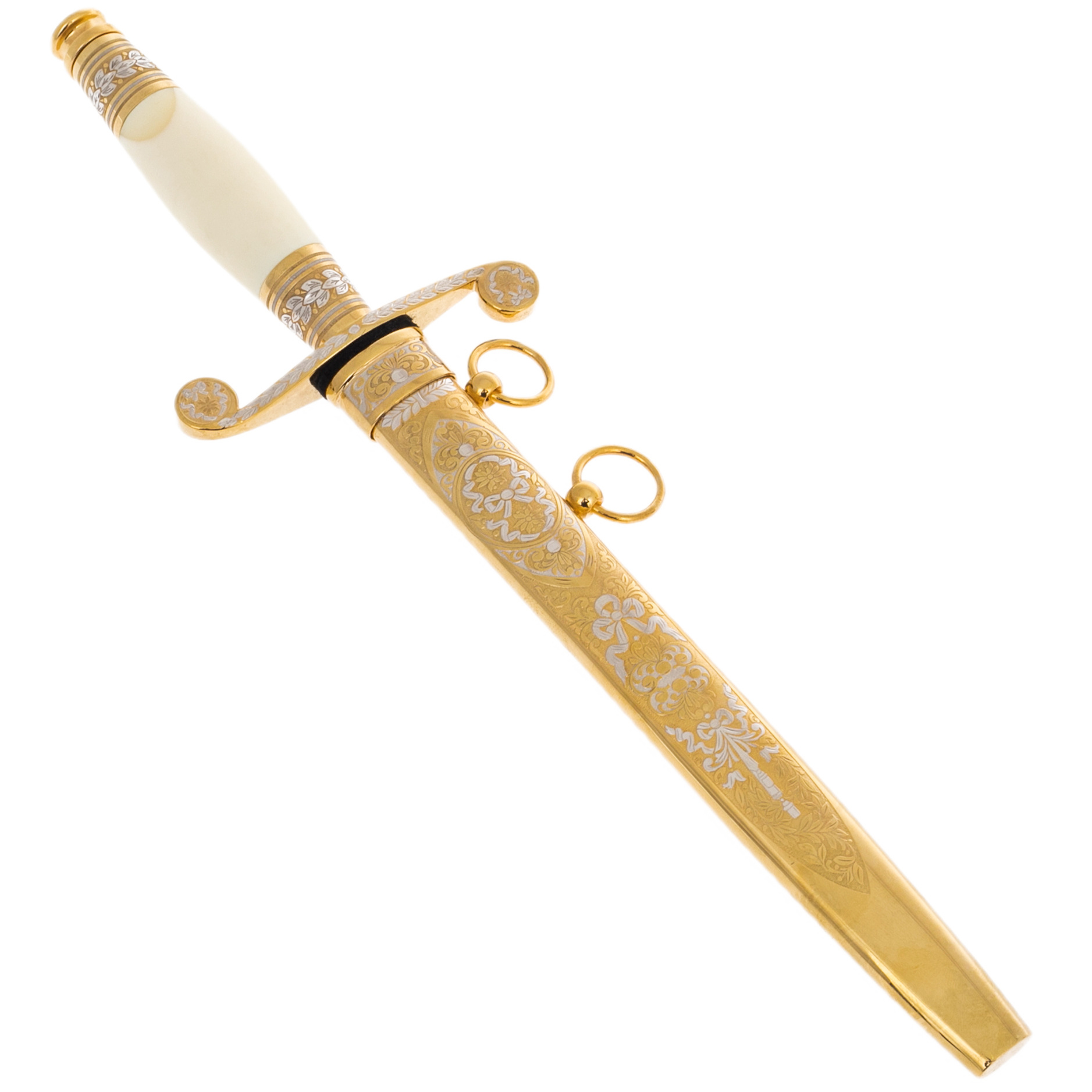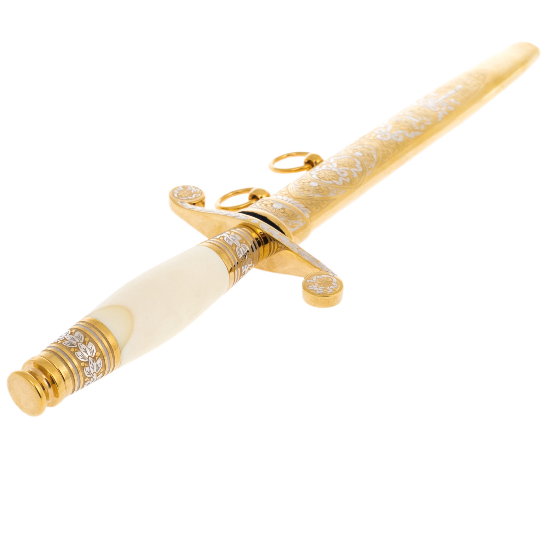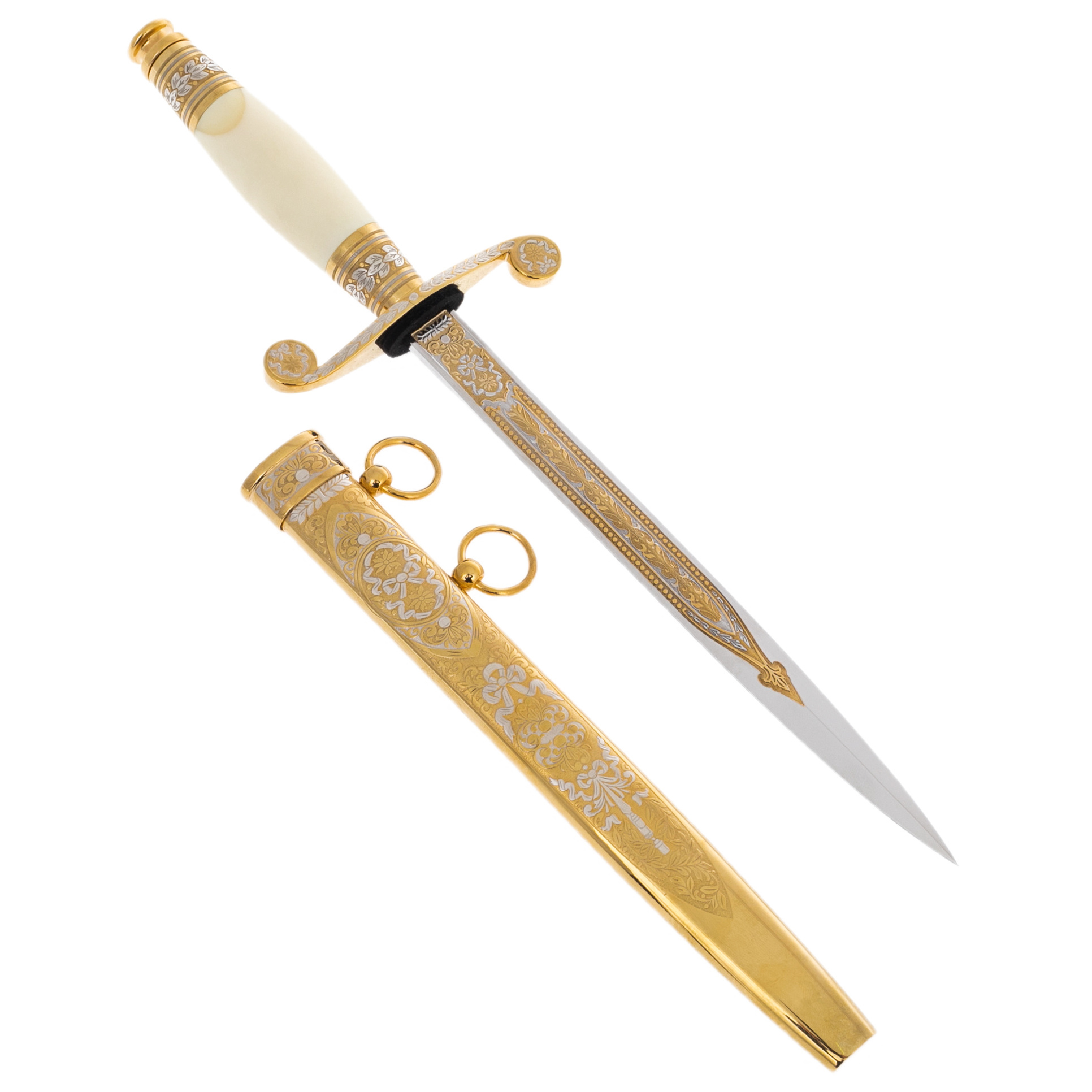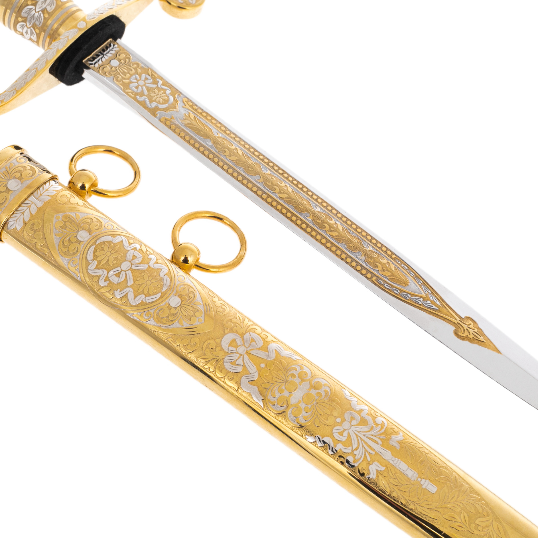 Изделие создано мастерами Златоуста, города, известного своими оружейными традициями с начала XIX века. Техника златоустовской гравюры по металлу предполагает многослойное нанесение золотых и серебряных узоров, выгравированных вручную с ювелирной точностью. Каждый элемент орнамента прорисовывается с особым вниманием: цветочные венки, виньетки и симметричные композиции не только украшают клинок, но и подчеркивают его статус художественного произведения. Отдельного внимания заслуживает сверкающая линия узора вдоль лезвия, создающая иллюзию движения при каждом повороте света.