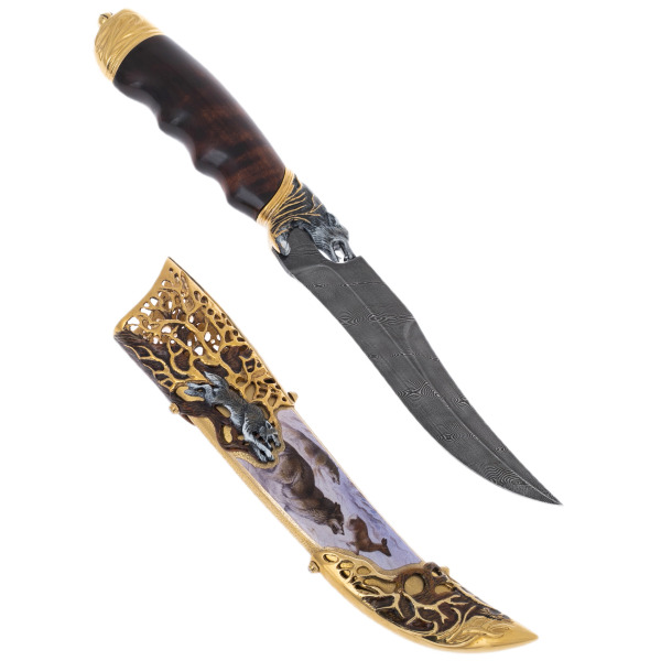 The Damascus steel Wolf knife is the epitome of predatory grace and impeccable craftsmanship. His blade, decorated with golden ornaments, reflects the primordial power of the beast whose name he bears. The elegant engraving depicts a wolf caught in the act of hunting, when instinct and calculation merge together. Steel, hardened using ancient technologies, preserves the spirit of an impeccable weapon, created for those who are accustomed to rule over circumstances.