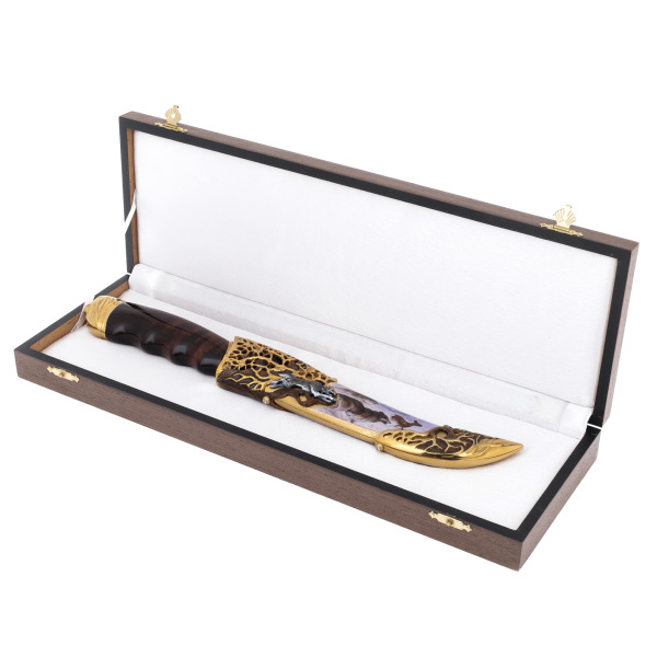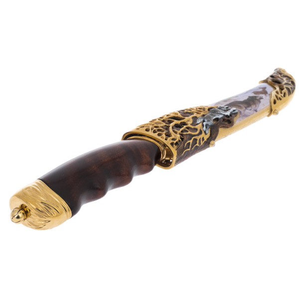 Souvenir Tiger knife, ZlatoustSouvenir Tiger knife, ZlatoustSince ancient times, the best craftsmen from Zlatoust have been engaged in the production of weapons. Artistic blades, daggers, stilettos, dirks, swords, checkers and hatchets were made by hand from high-quality steel in the technique of Zlatoust engraving on metal. Our gunsmiths are well versed in the techniques of engraving, etching, silvering and gilding. We offer you the best samples of gift weapons, each of which is a masterpiece of gunsmithing. An expensive collectible weapon emphasizes the high status of its owner. You can decorate a souvenir with an original greeting card or order a drawing according to your sketch.