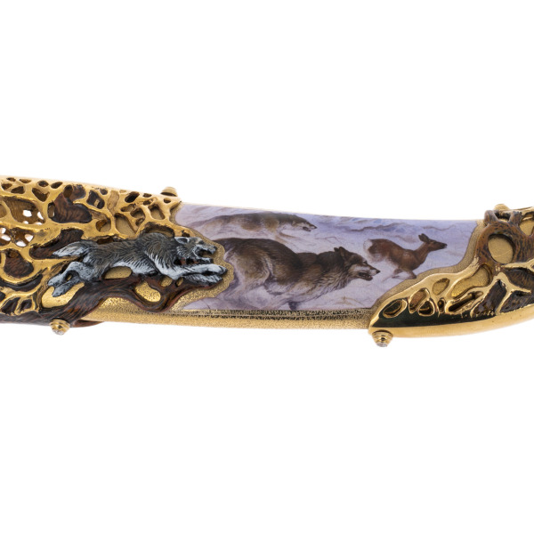 Knife on the stand "Bear and deer" with a wishKnife on the stand "Bear and deer" with a wishSince ancient times, the best craftsmen from Zlatoust have been engaged in the production of weapons. Artistic blades, daggers, stilettos, dirks, swords, checkers and hatchets were made by hand from high-quality steel in the technique of Zlatoust engraving on metal. Our gunsmiths are well versed in the techniques of engraving, etching, silvering and gilding. We offer you the best samples of gift weapons, each of which is a masterpiece of gunsmithing. An expensive collectible weapon emphasizes the high status of its owner. You can decorate a souvenir with an original greeting card or order a drawing according to your sketch.