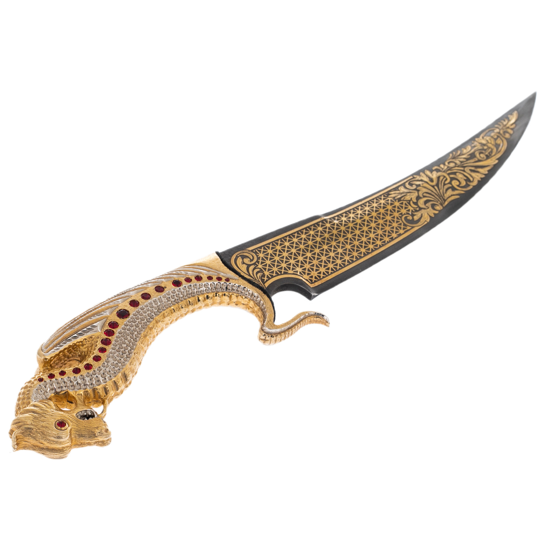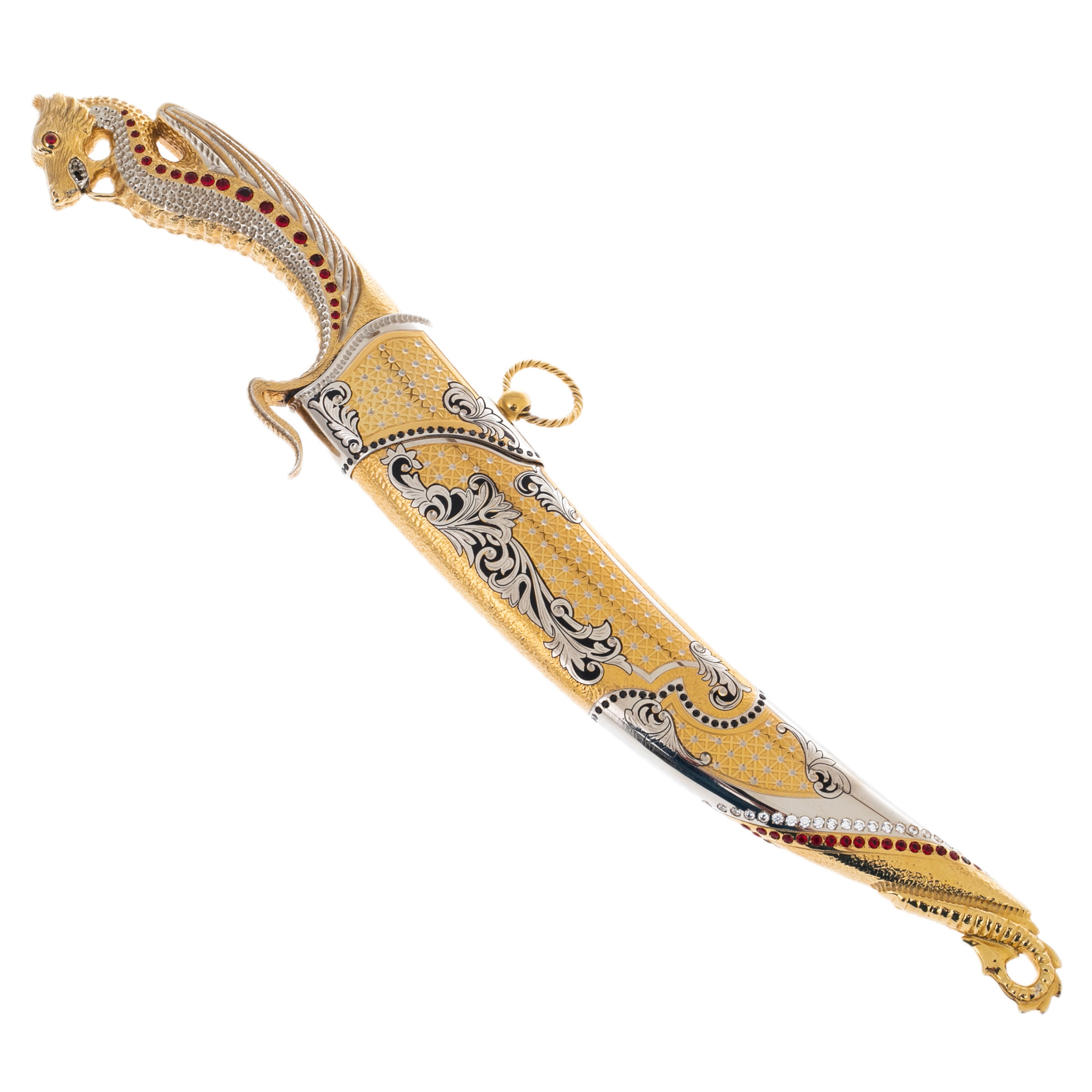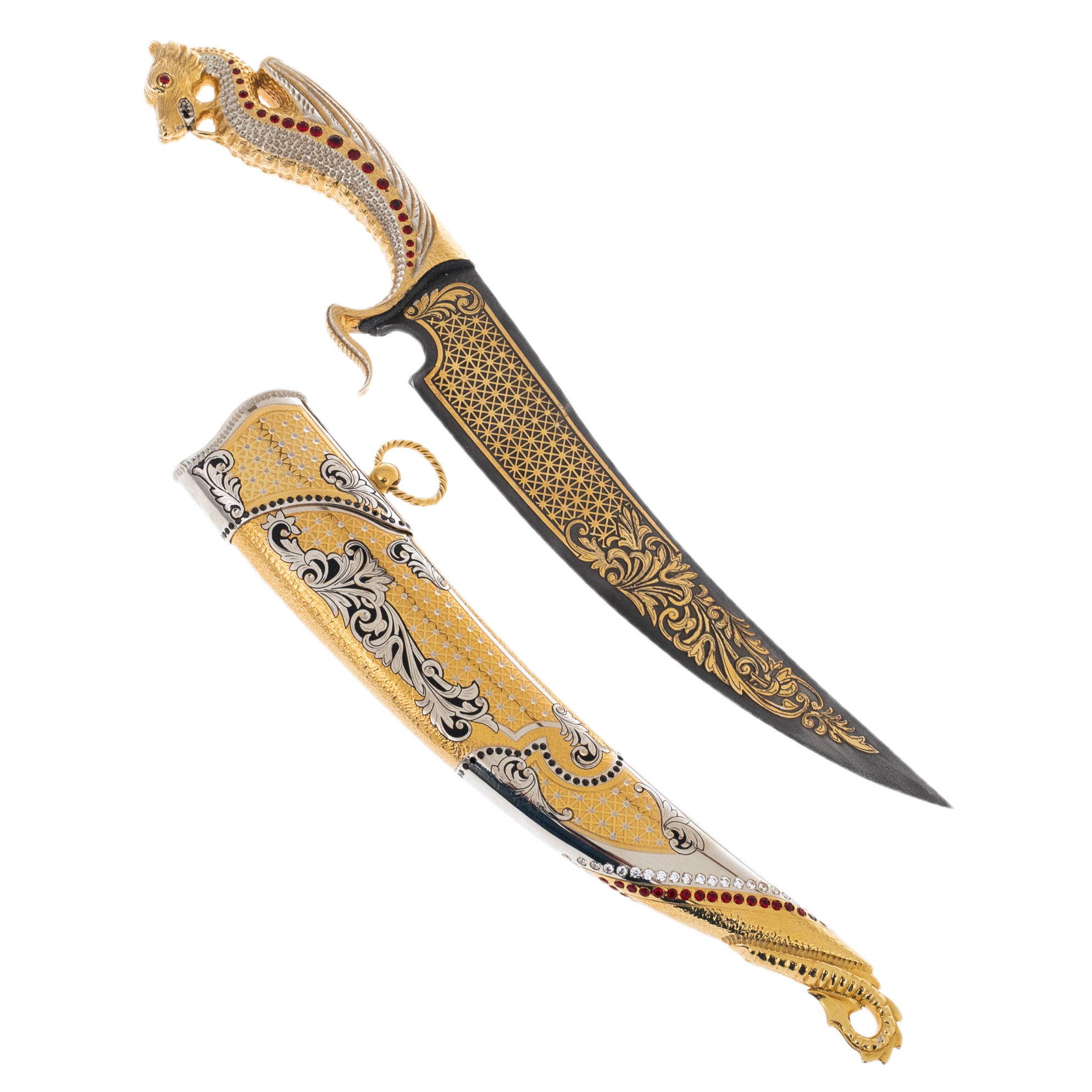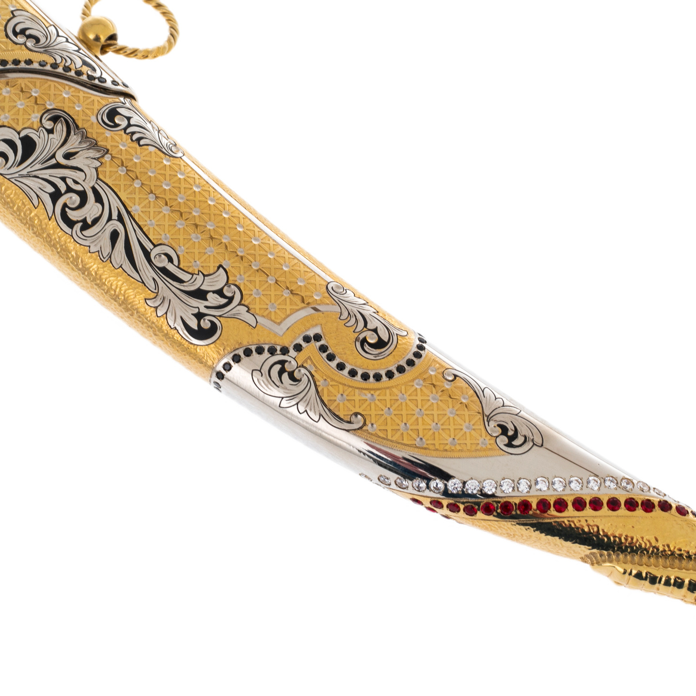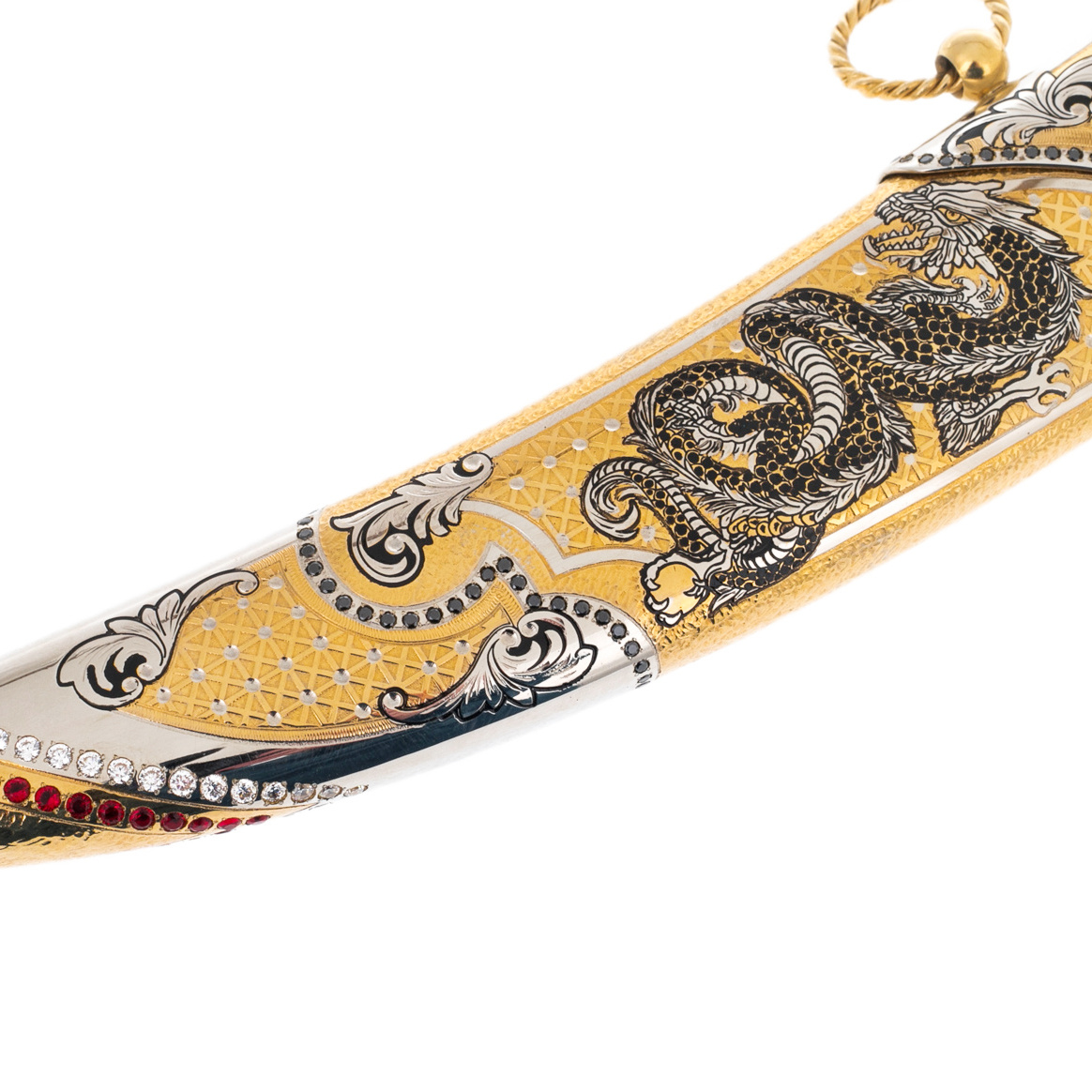 The scabbard, inlaid with patterns and decorated with a scattering of crystals, as if to emphasize the dragon, continue its history, immersing it in the world of oriental luxury. Here, the dragon is surrounded by ornate lines and weaves, as if his image is woven into legends passed down from generation to generation. Deep red and gold shades accentuate the richness and splendor of the product.