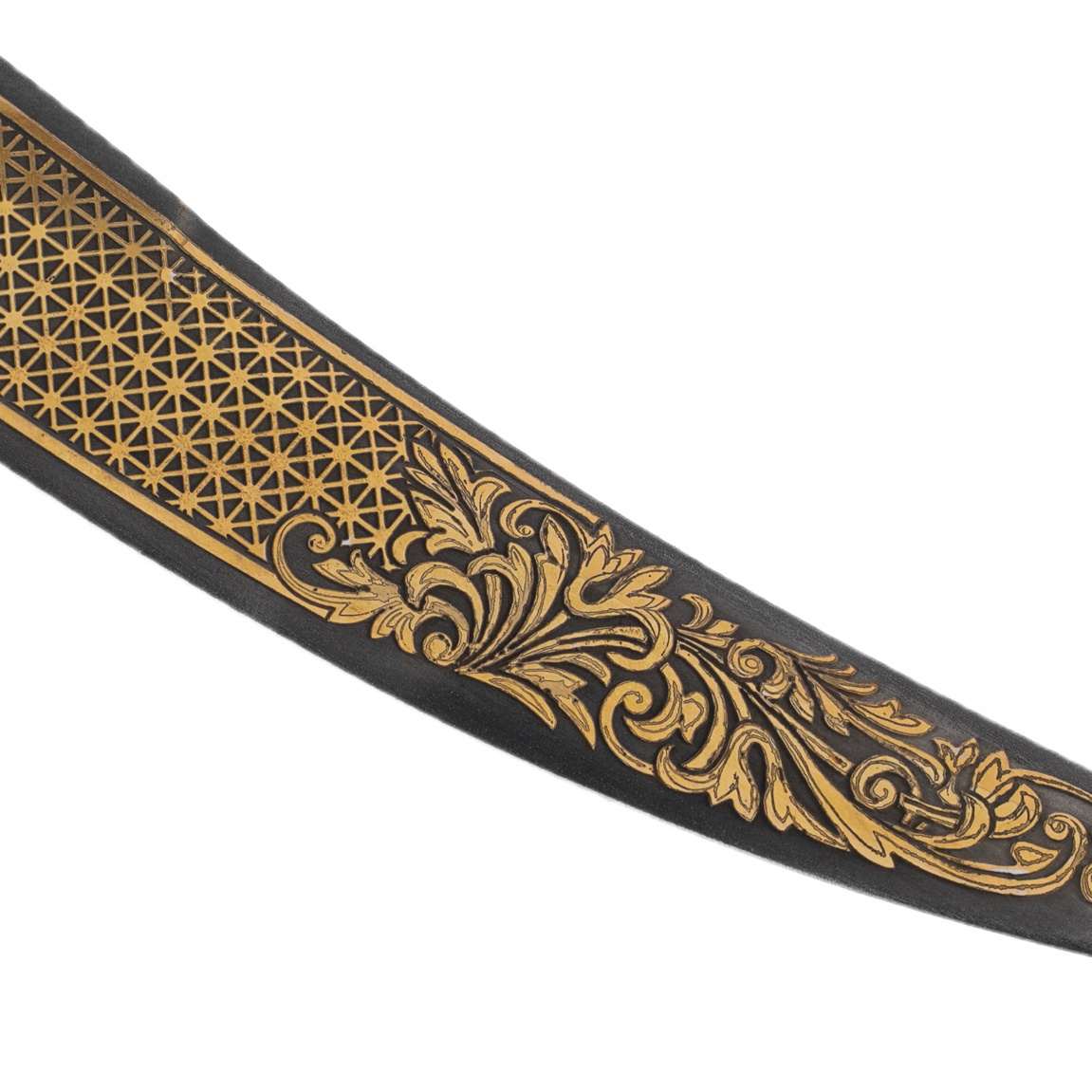 The blade, forged from Damascus steel, is decorated with the finest patterns, reminiscent of ancient symbols of power and prosperity. The gold ornament on the black steel gives the product additional depth and significance, symbolizing the unity of opposites, light and darkness, fire and water. He seems to say that in the hands of a true expert it is possible to achieve harmony between strength and wisdom.