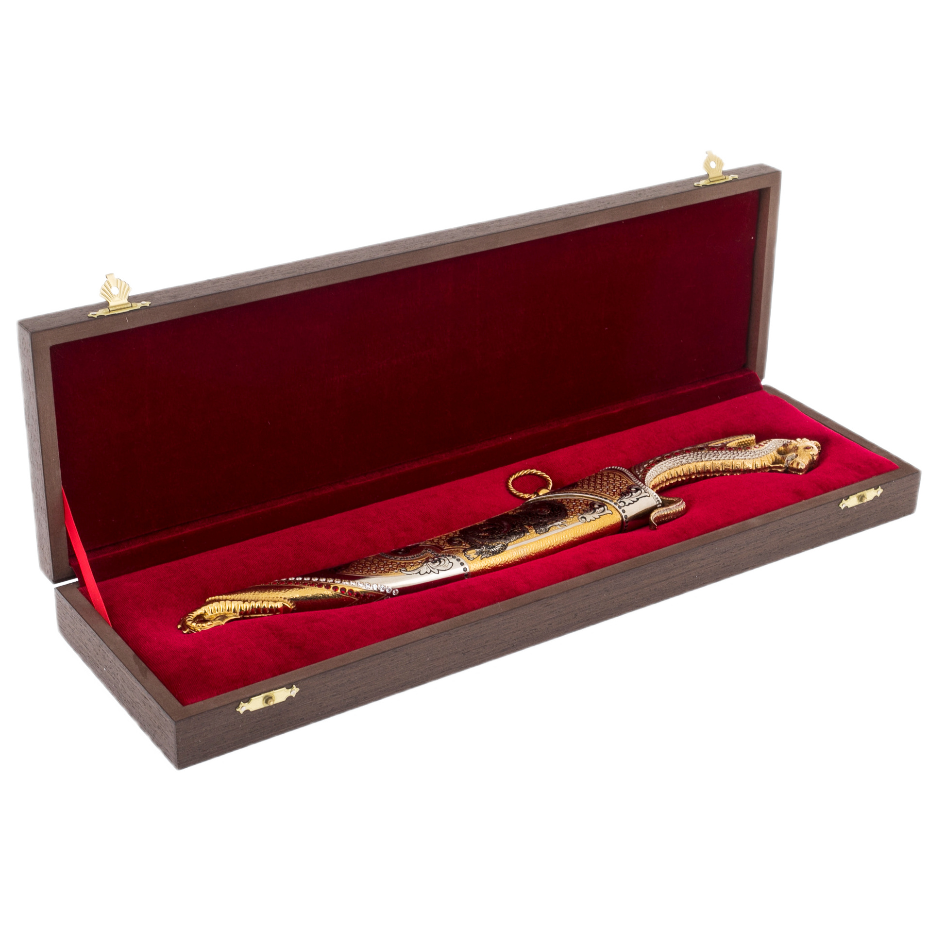 The velvet case in which this work of art rests serves as a worthy frame for such a valuable object, emphasizing its exclusivity and uniqueness. This knife is not just a weapon or an accessory, it is the keeper of ancient secrets; possession of it grants the owner strength worthy of emperors and generals.