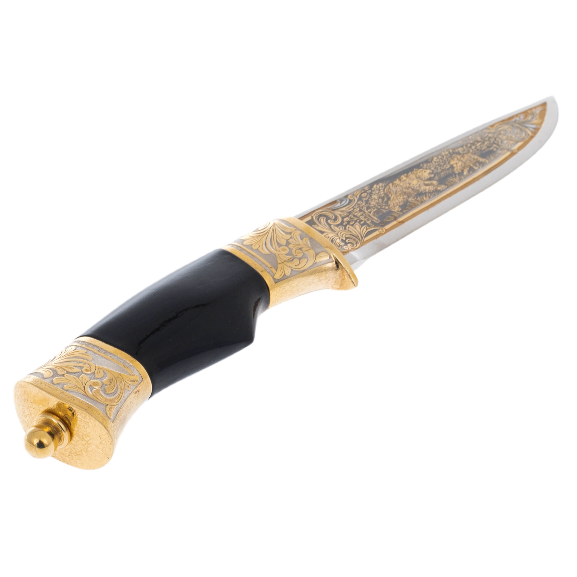 The handle, made of noble materials, fits comfortably in the palm of your hand, giving you a sense of stability and confidence that a true hunter and a man with a strong character need. Gilding and exquisite ornamentation give the product a special grandeur, emphasizing its elite status and uniqueness.