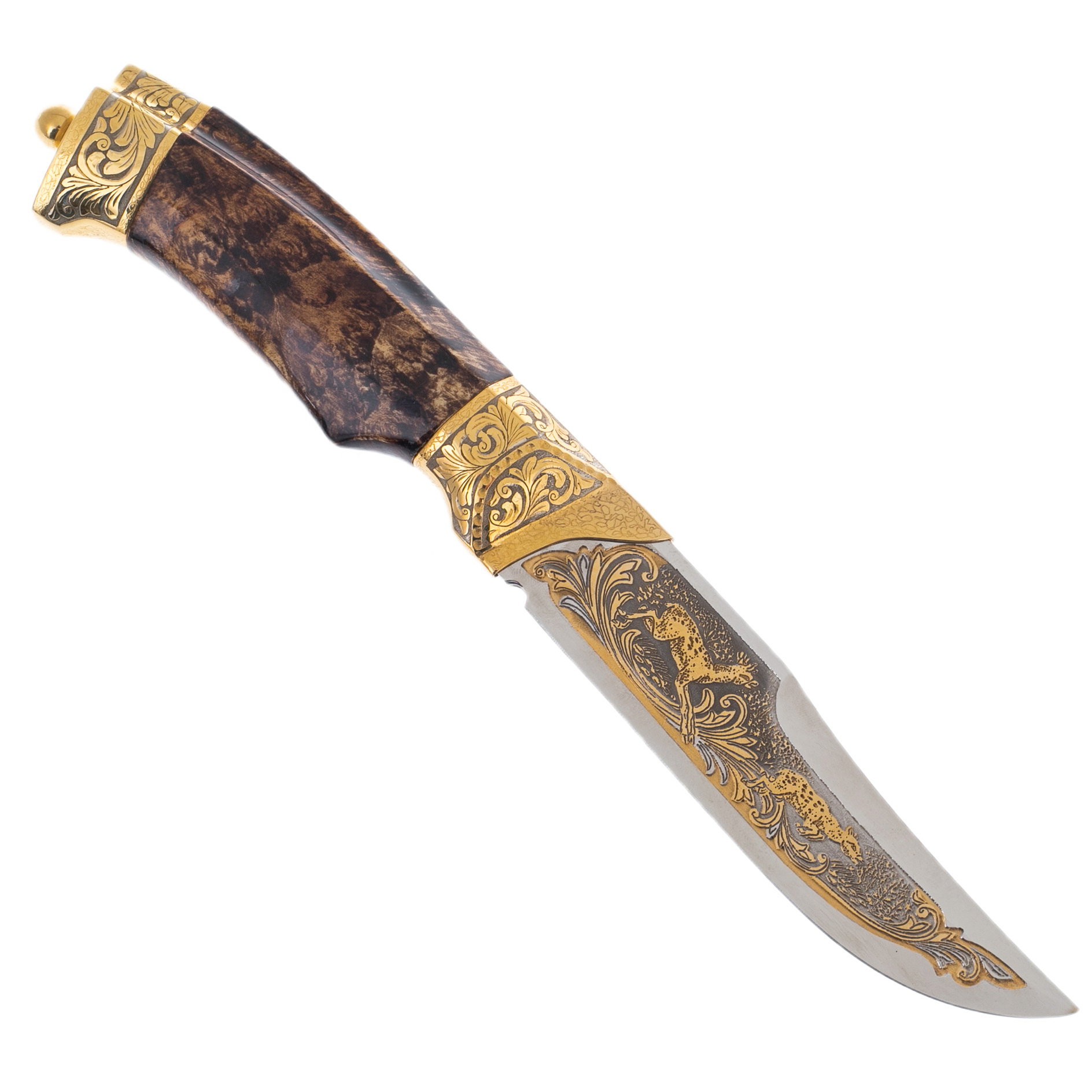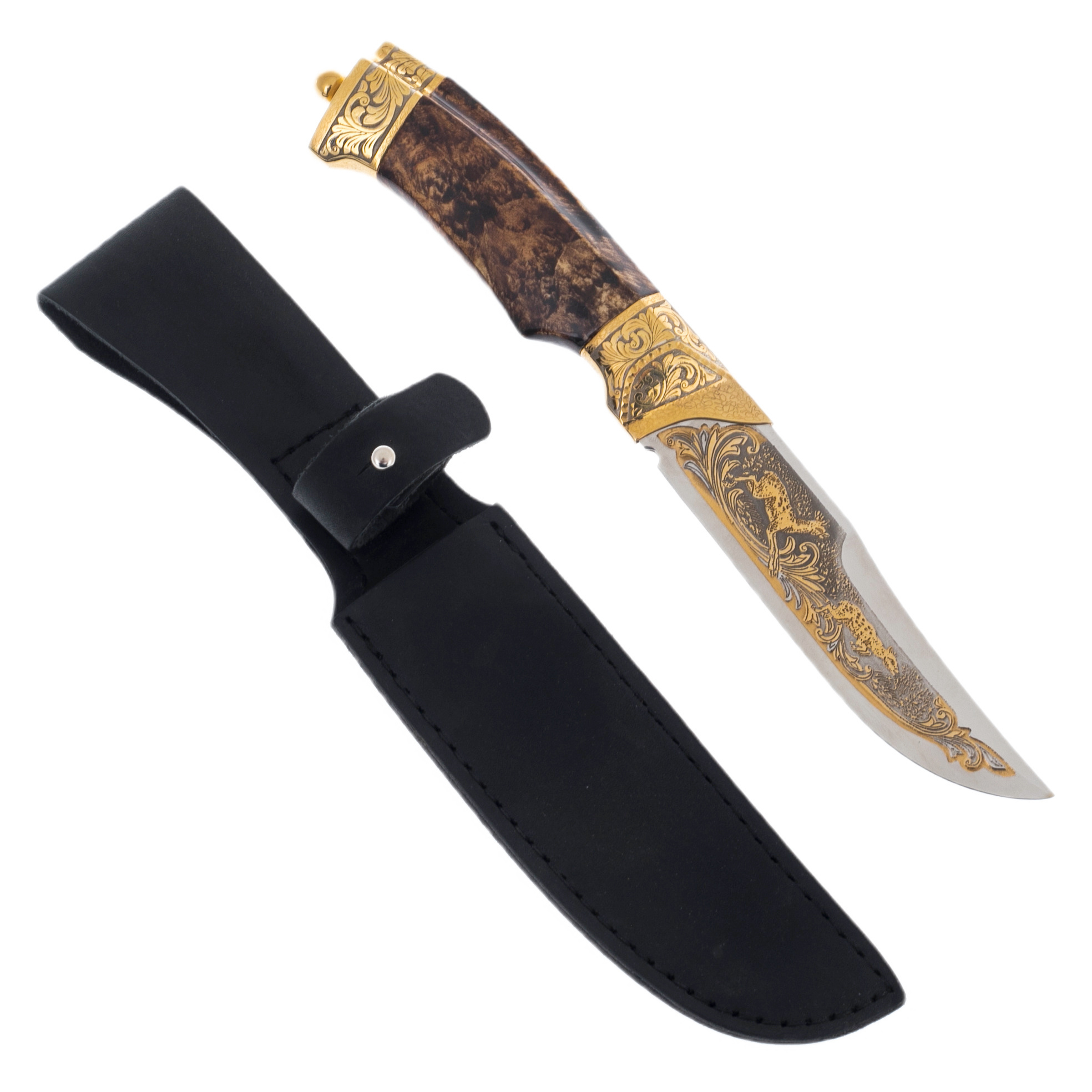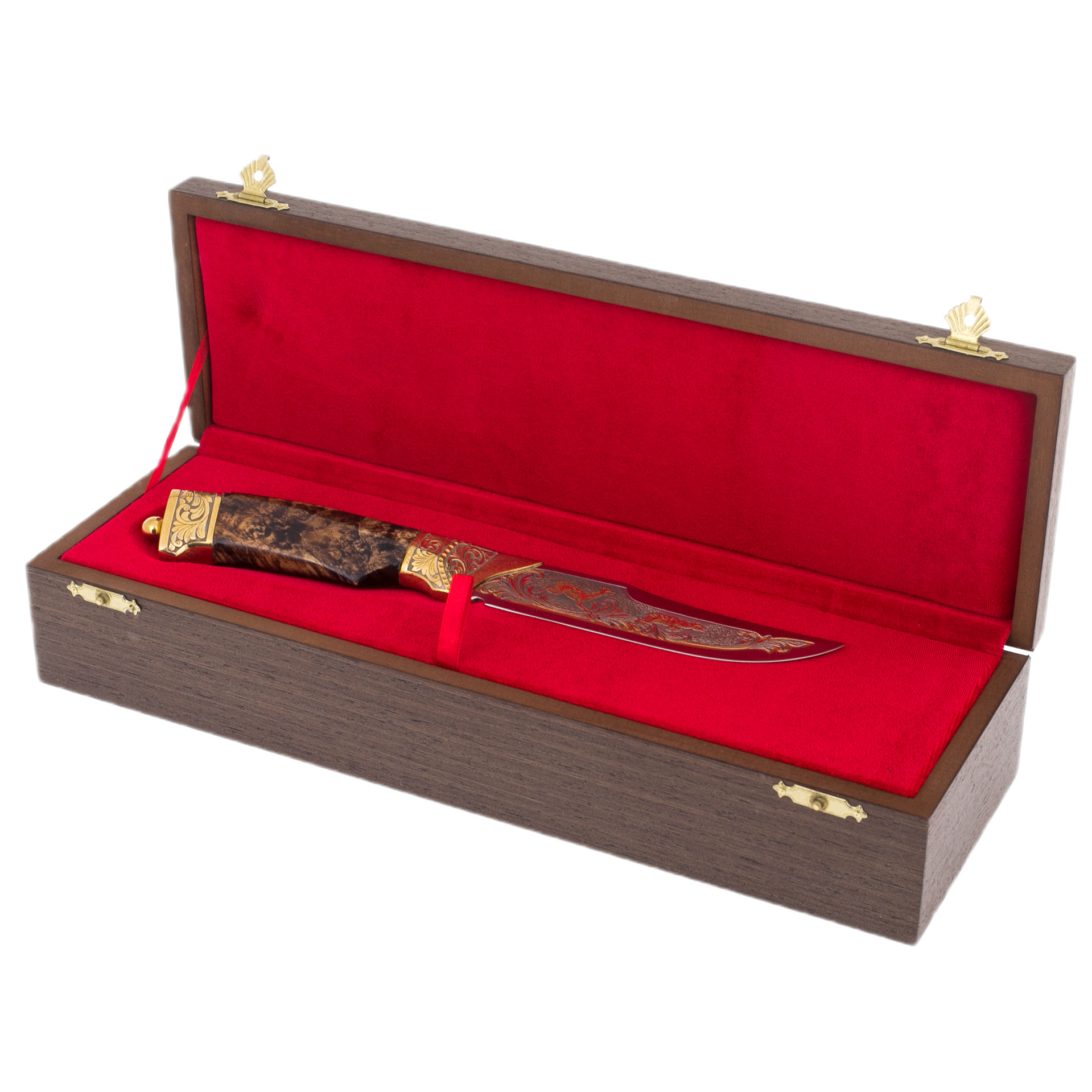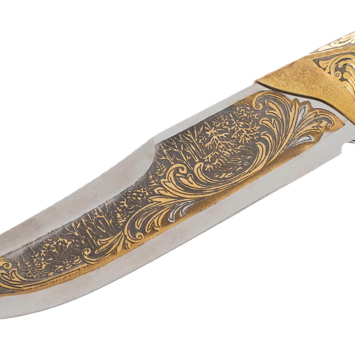 The blade of the knife is the epitome of power and beauty. Covered with the finest gold pattern, it conveys the harmony of nature and human art. Every twist on the blade is a tribute to traditions and craftsmanship passed down from generation to generation. This knife is not just an object, it is a keeper of history, which can become a talisman, a source of strength and inspiration for its owner.