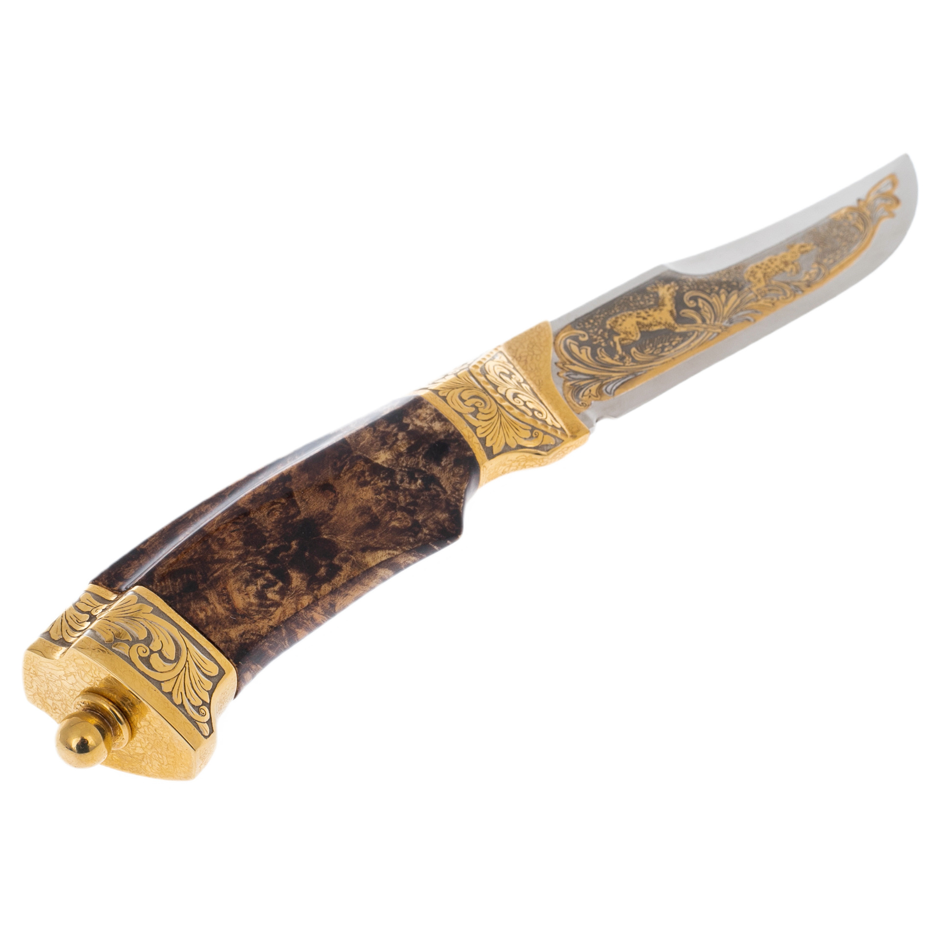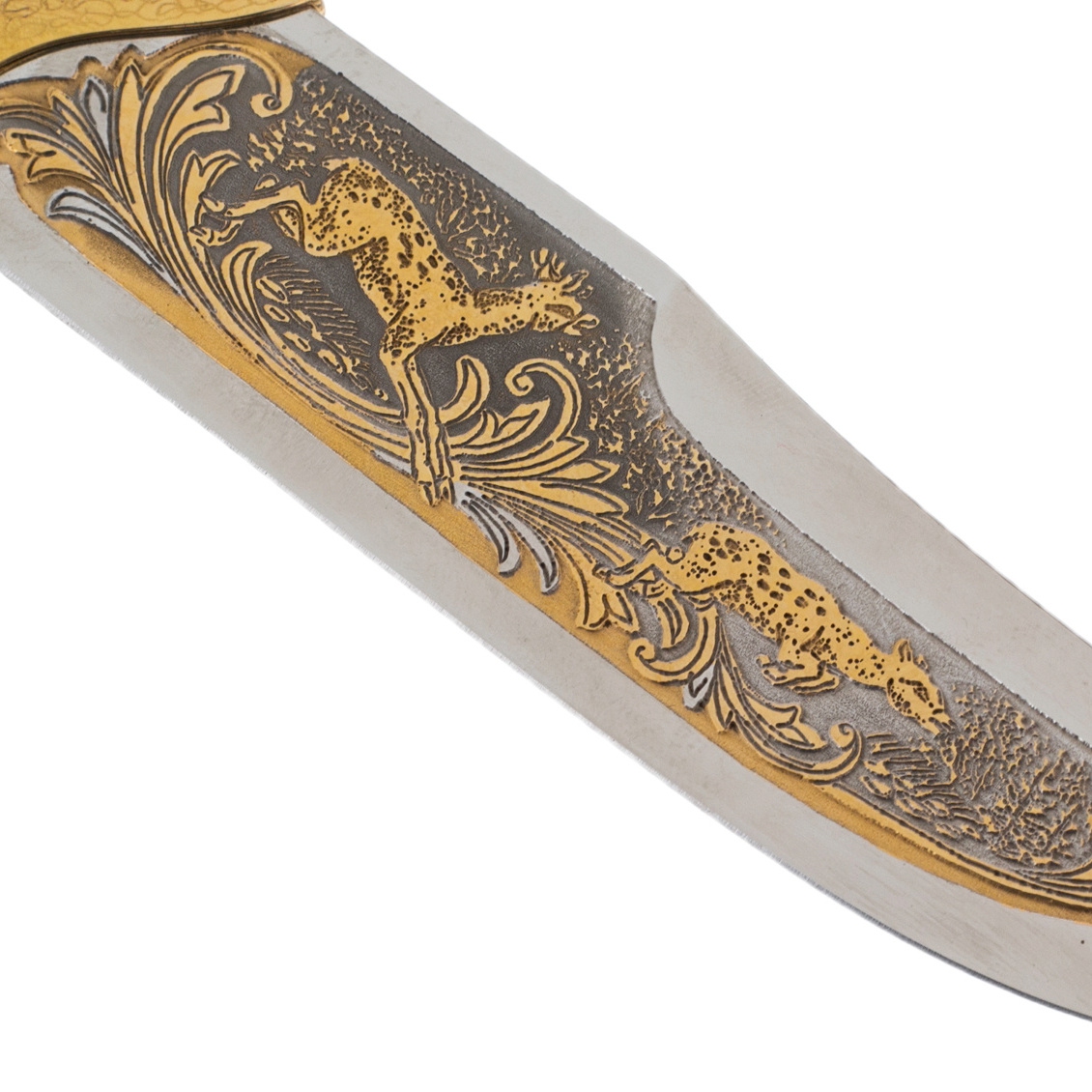 The handle of the knife, made of noble wood, shimmers with warm shades, in which you can see the deep antiquity of centuries-old forests. Decorated with exquisite gold ornaments, it seems to contain the wisdom of generations and the power of the past. The figures of deer and roe deer on the blade are symbols of speed, dexterity and nobility, the ideals inherent in real leaders. They are depicted in a swift leap, as if they are ready to rush into battle or disappear in an instant, leaving behind only a trace of greatness.