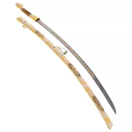 Шашка из дамасской стали "Подарочная" Златоуст Шашка из дамасской стали "Подарочная" Златоуст Парадная шашка, выкованная из дамасской стали и украшенная в лучших традициях оружейного искусства Златоуста, является воплощением статуса, силы и исторической преемственности. Лезвие, демонстрирующее характерный волнистый рисунок дамаска, инкрустировано орнаментальными гравюрами с золочением, подчёркивающими ритуальный и представительский характер оружия. Рукоять изготовлена из капа ценных пород дерева, оттенённого обоймами с глубоким чернением и золотыми растительными мотивами, а контур подчеркивают два пояса из красных вставок, напоминающих гранатовые зерна. Ножны сплошь покрыты сложной композицией с изображениями античных трофеев, знамен, щитов, барабанов и лавровых венков — аллегорий победы, доблести и воинской славы. В художественной отделке использована классическая златоустовская техника гравировки по металлу, включающая золочение, никелирование и чернение. Мастера ювелирной оружейной школы добились исключительной контрастности: в растительных и символических узорах золотой рельеф играет на фоне бархатно-чёрного поля, а тончайшая серебряная проработка создаёт иллюзию объёмного рельефа. На клинке — орнаментальная полоса из повторяющихся символов, выполненная в многослойной цветной гравюре, демонстрирующая высочайший уровень владения техникой. Декор покрывает не только гарду и ножны, но и каждую пластину, создавая единое визуальное целое. Это не оружие, а реликвия, созданная для демонстрации власти, достоинства и вкуса. Шашка предназначена для подарка человеку государственного уровня, высокопоставленному военному, дипломату или бизнесмену, чья биография наполнена символами побед и уверенного пути. В деревянном футляре с бархатной подкладкой она выглядит как трофей из закрытого собрания, достойный витрины личного кабинета или зала почёта.