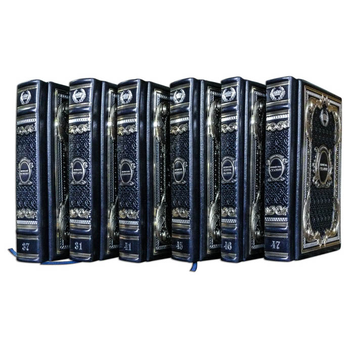 Design features: the handmade French composite binding is made from a combination of natural leathers (calf leather "Robbat blue", leather "Robbat nero" produced by the Italian tannery Carisma"). The book cover is decorated with a combination of multi-level volumetric embossing: embossed gold, using Luxor 240 foil and deep pancake. The trimmings are hand-polished and gilded with gold leaf.