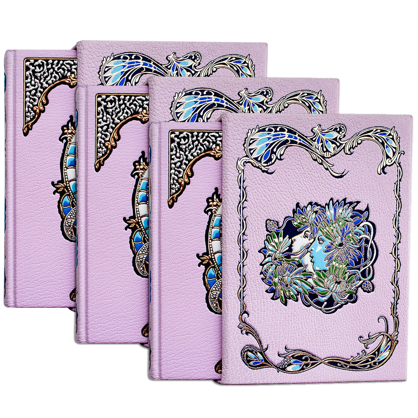 Design:The binding is made of genuine leather. All books have a three-sided gold edge and are placed in a handmade leather case with foil embossed on all sides of the case. The number of foil embossments is up to 9 different colors on the cover and case. The interior design of most books is printed in 5 colors (4 + gold) on each strip.