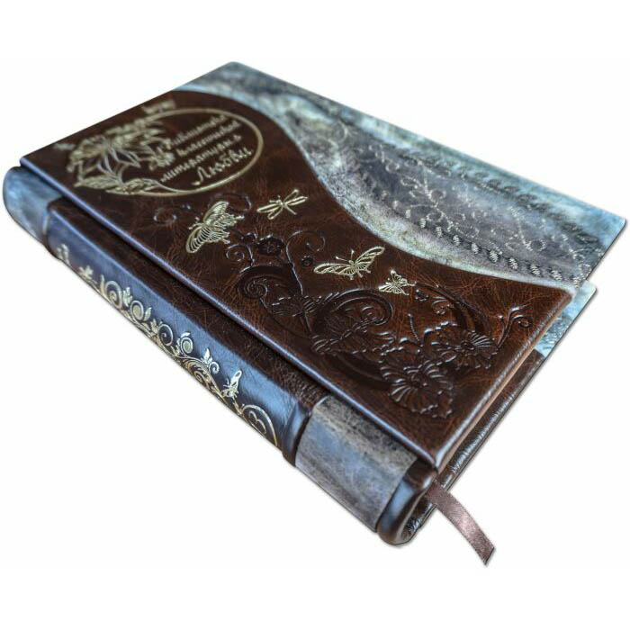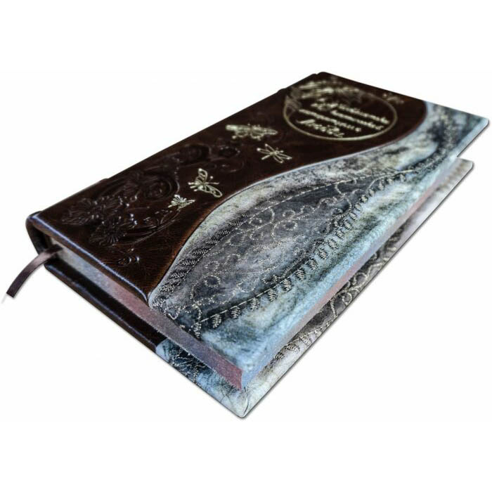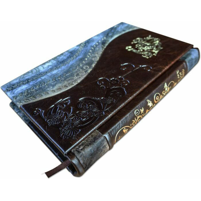 Design features: the handmade French composite binding is made of natural leathers (leather "Perugia brown", leather "Cavalli" produced by the Italian tannery "Carisma"). The book covers are decorated with embossed gold embossing, using Luxor 240 foil and deep pancake embossing. The edged blocks are decorated in the author's Chameleon technique.
