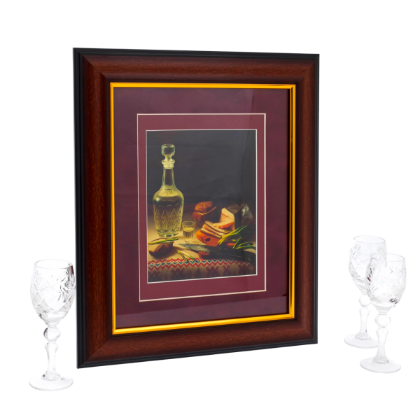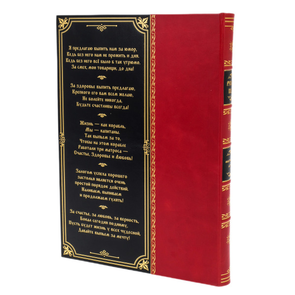 Книга и аксессуары уложены в деревянный футляр, выстланный бордовым бархатом, — цвет, подчёркивающий торжественность, но не громкость. Внутреннее оформление напоминает интерьер редкой библиотеки: место каждой детали определено с ювелирной точностью, и в этой продуманности чувствуется вкус мастеров, привыкших работать не для витрины, а для личности. Хрустальные рюмки придают комплекту материальную завершённость — прозрачность и блеск хрусталя звучат рядом с бархатом и кожей как аккорд лёгкости и света.