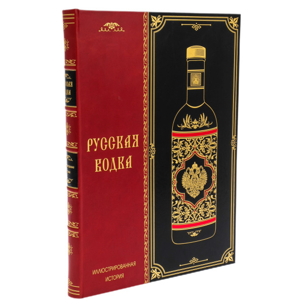 Подарочный комплект "Русская водка" — образец интеллигентного остроумия в подарочной культуре, собранный с вкусом и уважением к традиции. В центре композиции — книга в кожаном переплёте глубокого винного тона с золотым тиснением и графическим оформлением, превращающим обложку в визуальный символ национального напитка.