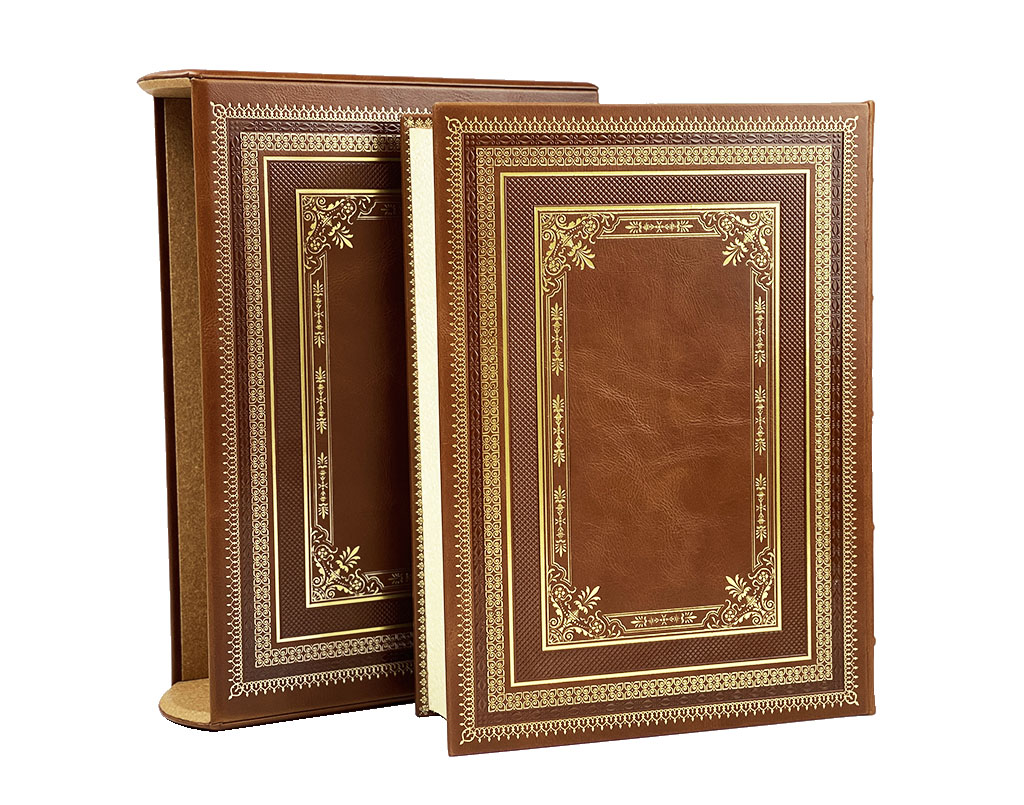 Execution:a unique reprint edition, hand-bound from high-quality vegetable-tanned leather produced in Italy. A sawn-off shot painted to match the binding material. Classic binding style, with a combination of pancake and gold embossing. High-quality designer paper. Dubbing. A leather gift case.