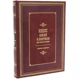 The leather-bound book "The Code of Leaders and Politicians of all Times and Peoples" The leather-bound book "The Code of Leaders and Politicians of all Times and Peoples" The book is presented in a classic binding, invented in the XVII-XVIII centuries. Gold embossing, sawn-off, blint, lace dyed to match the binding material. It is hand-bound. The book is a collection of aphorisms, catch words, sayings of political and public figures. The reader will see a kind of parade of sages from many countries, times and peoples, from ancient times to the present day.