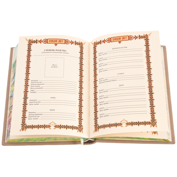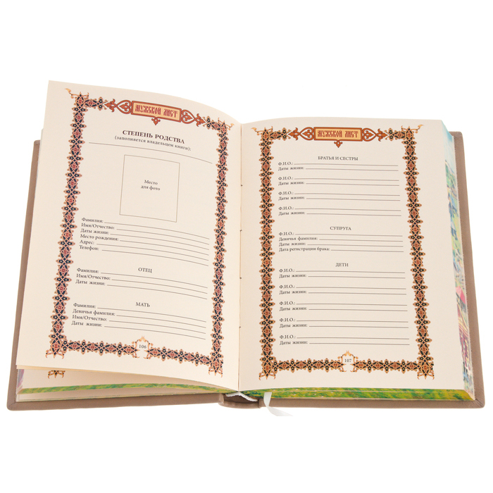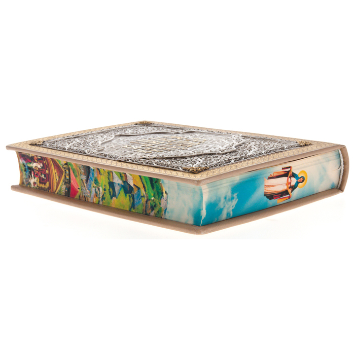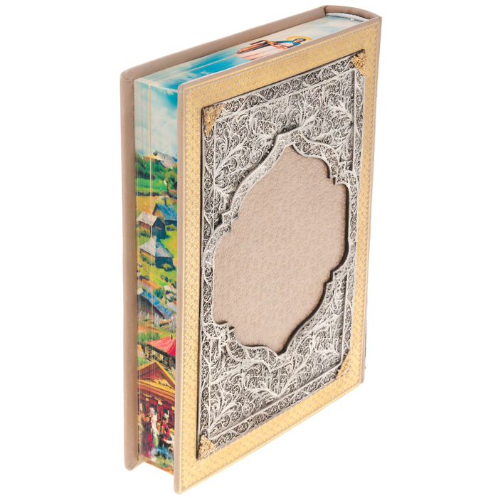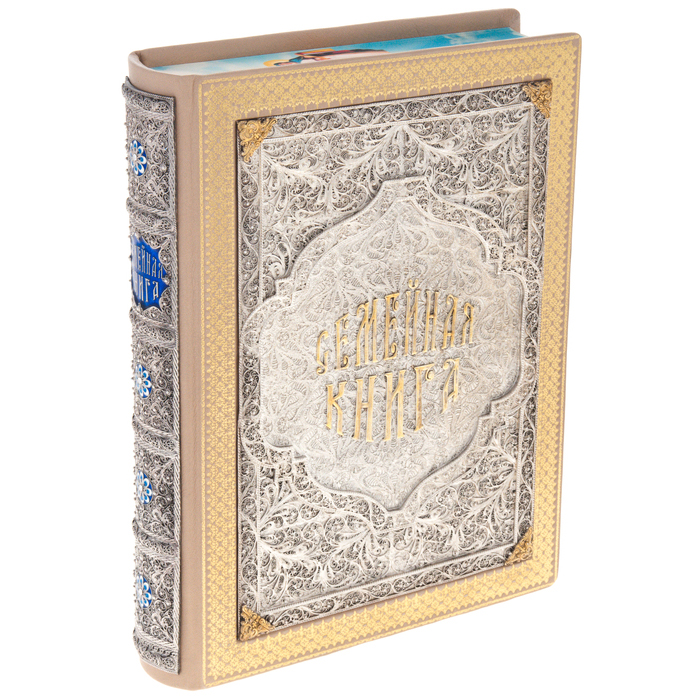 Design features: coated paper; handmade solid-leather binding, electroplating plates coated with silver and gold, embossed with gold foil, spine decorated with an overlay with inserts of Swarovski crystals and enamels, designer paper, hand-polished and painted sawn-off, lasse.