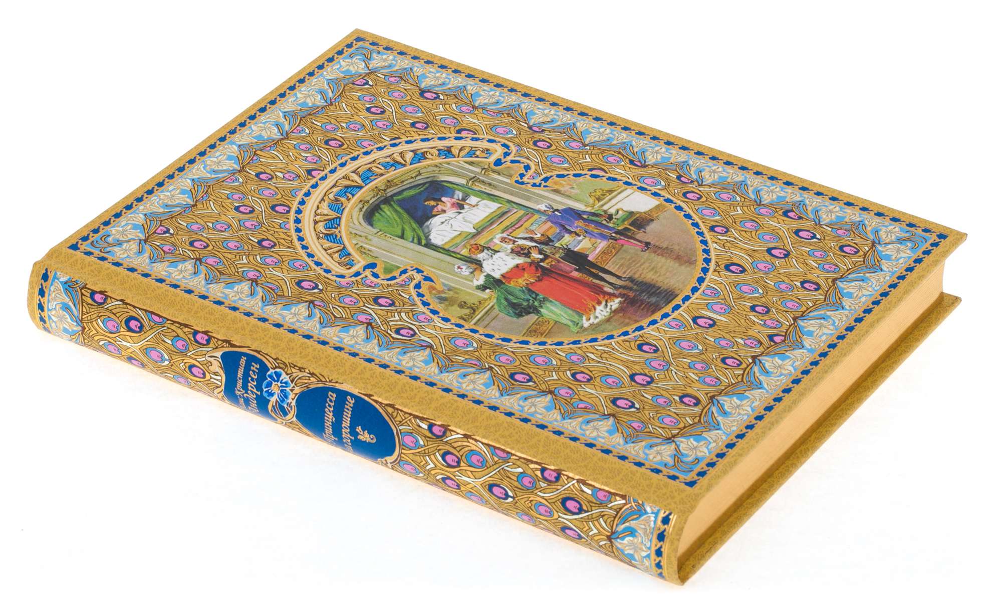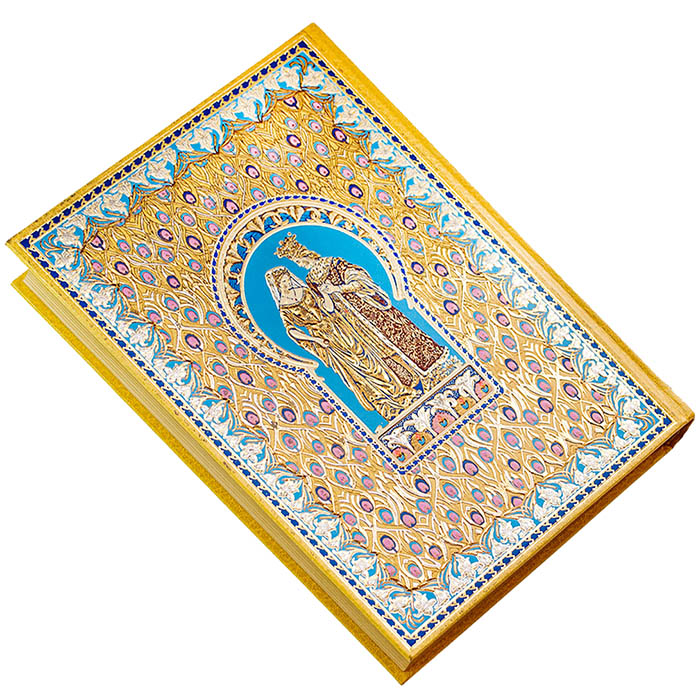 Design features:leatherette, coated paper; embossed with 10 types of foil; polished and hand-painted sawn-off, satin ribbon.