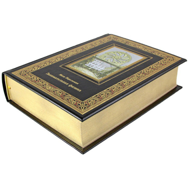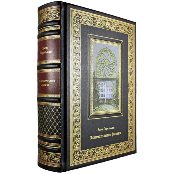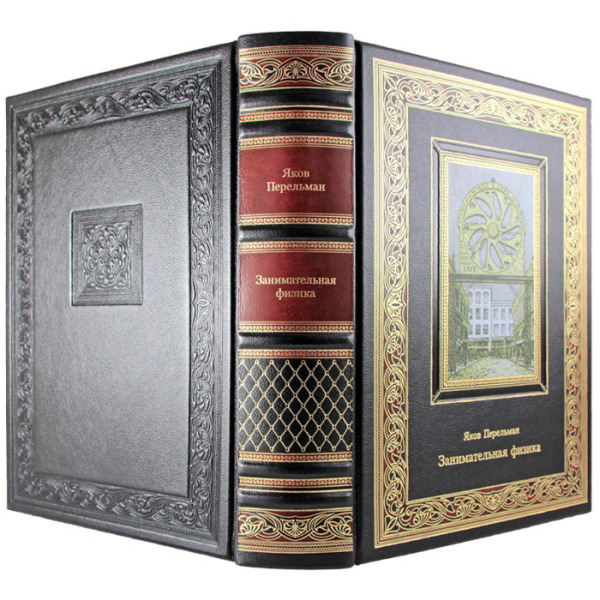 The leather-bound book "Entertaining Physics" by Yakov Perelman