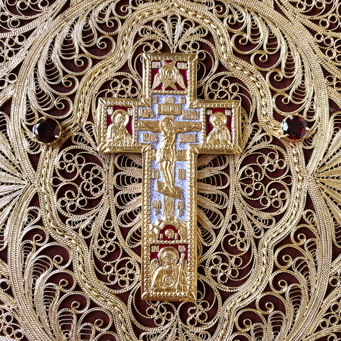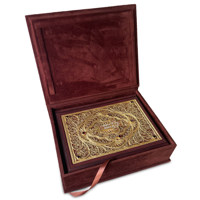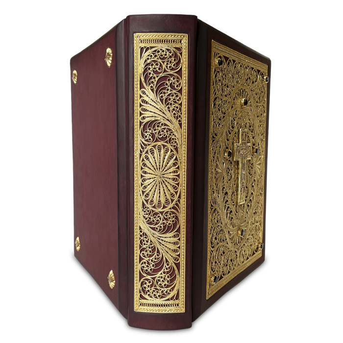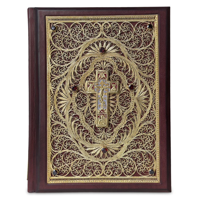 An exclusive gift edition in a handmade genuine leather binding with a three-sided gold edging. The book is decorated with handmade filigree covered with gold, garnets, artistic casting covered with gold, hand-painted with hot enamel.