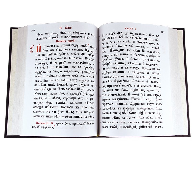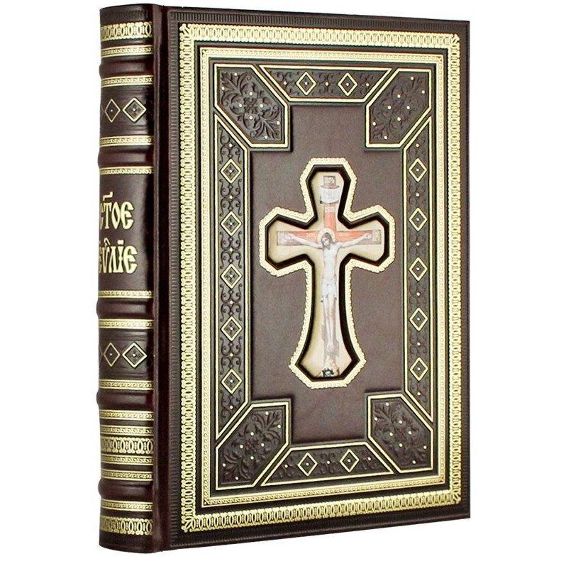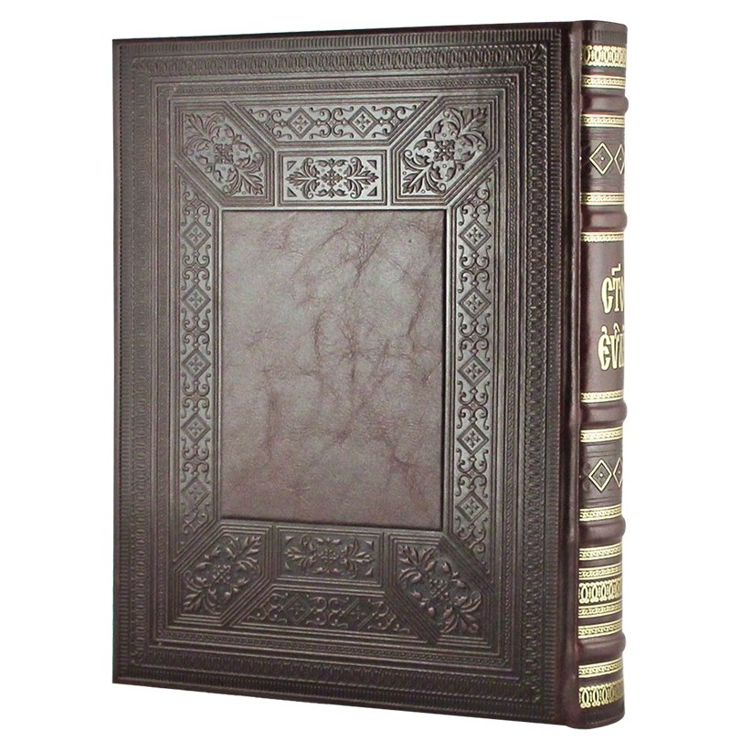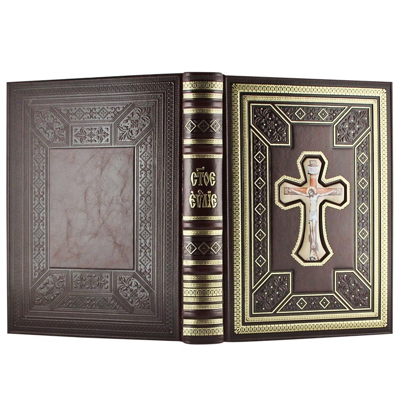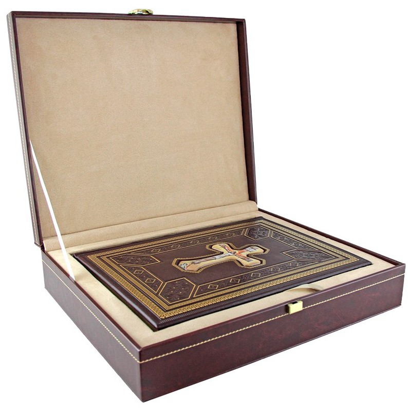 The leather-bound book "The Holy Gospel" in a gift box