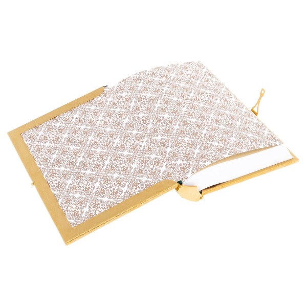 Gold itself is the epitome of nobility and luxury, it envelops every detail of the Quran, not just decorating, but emphasizing its significance and placing it on a pedestal worthy of the greatest relics of the world. The light reflection of gold playing on the surface of the cover creates a feeling of warmth and light, illuminating it and giving it special significance for true connoisseurs of beauty.
