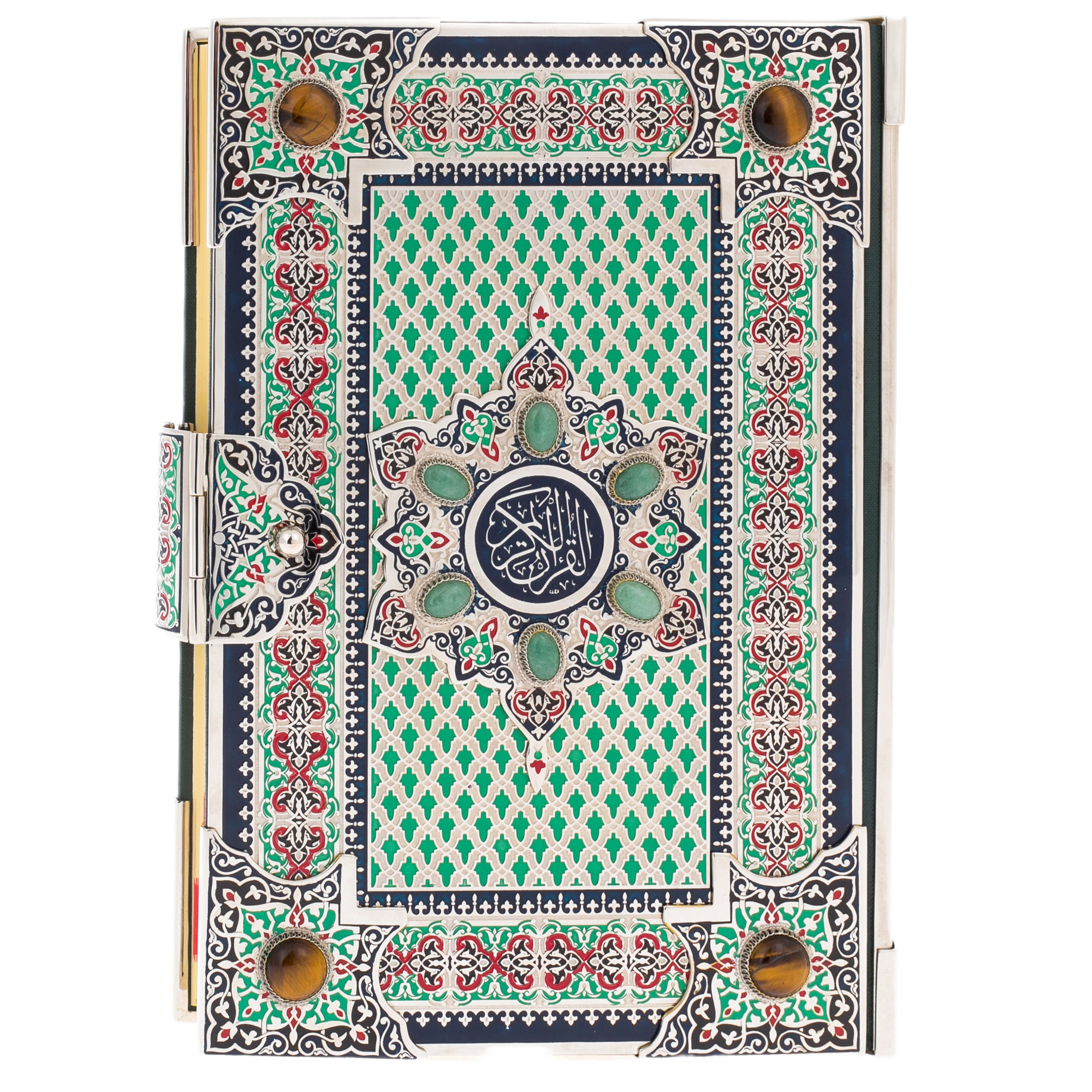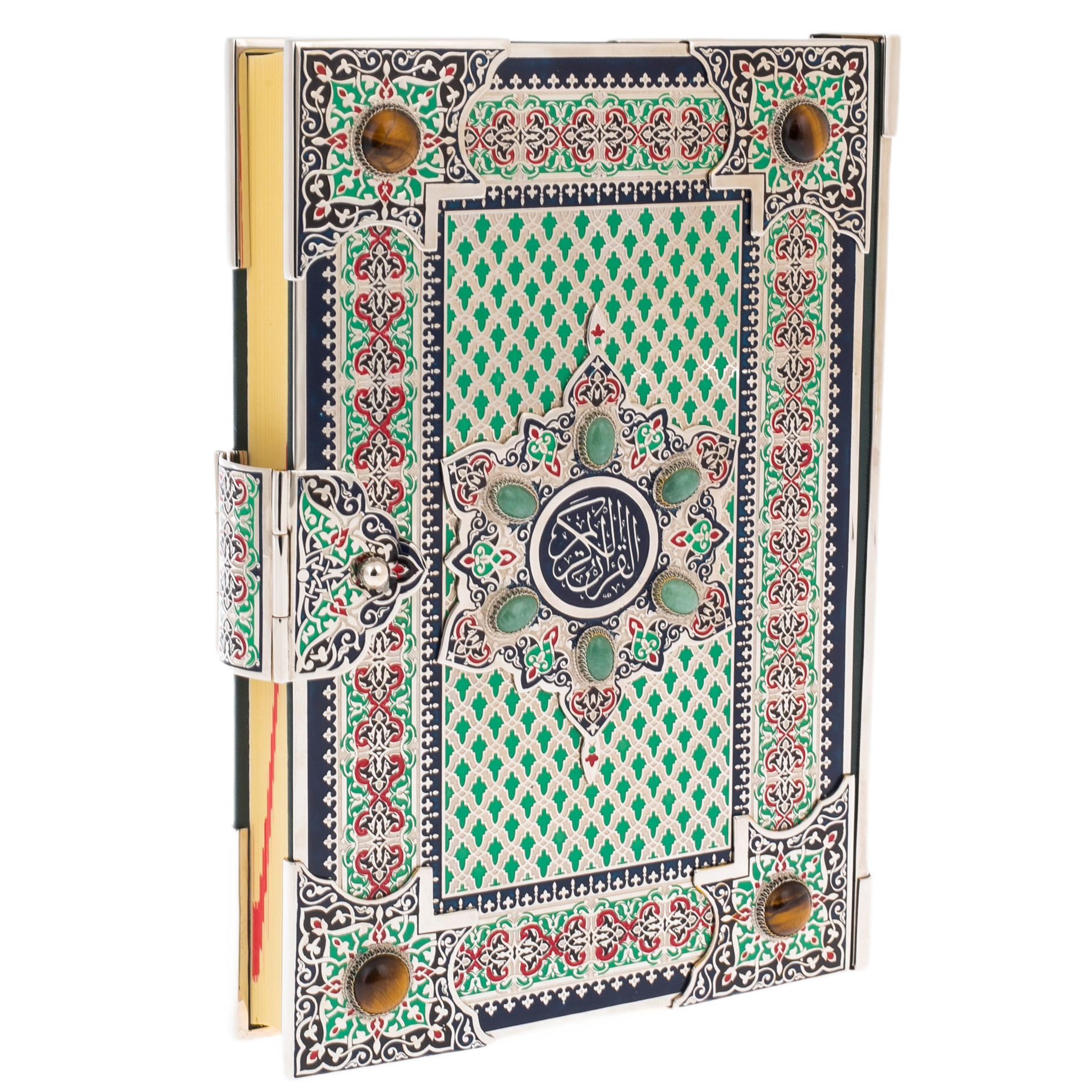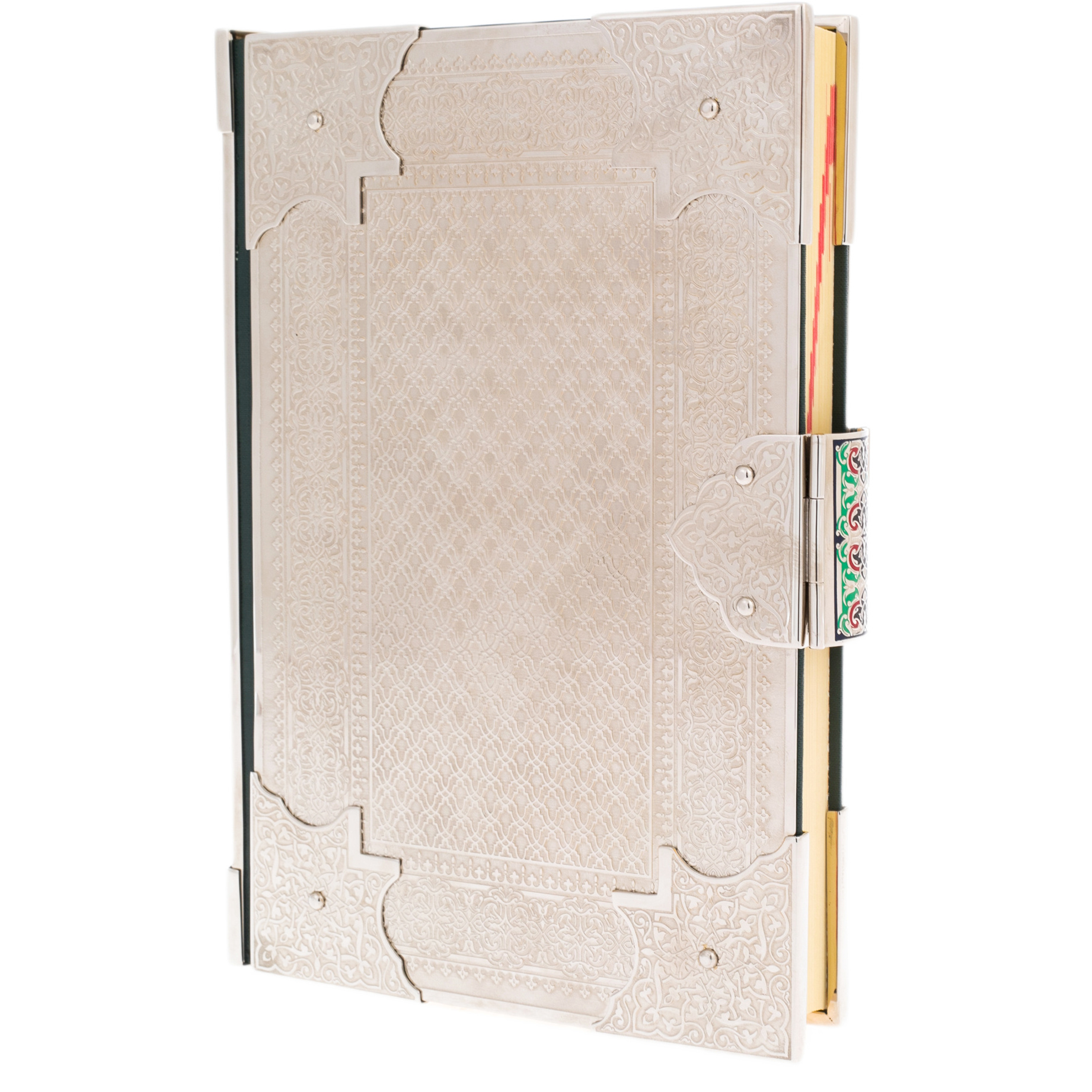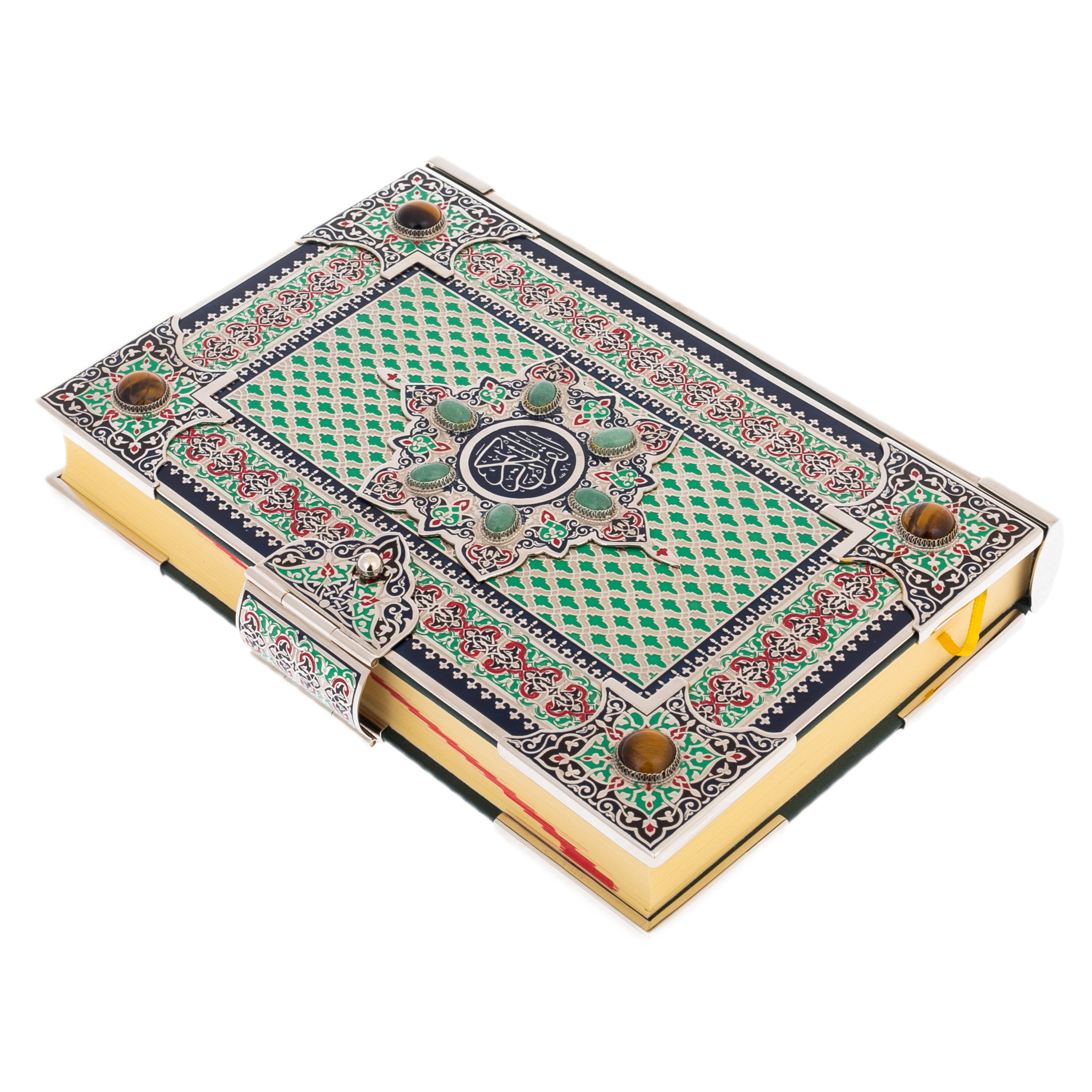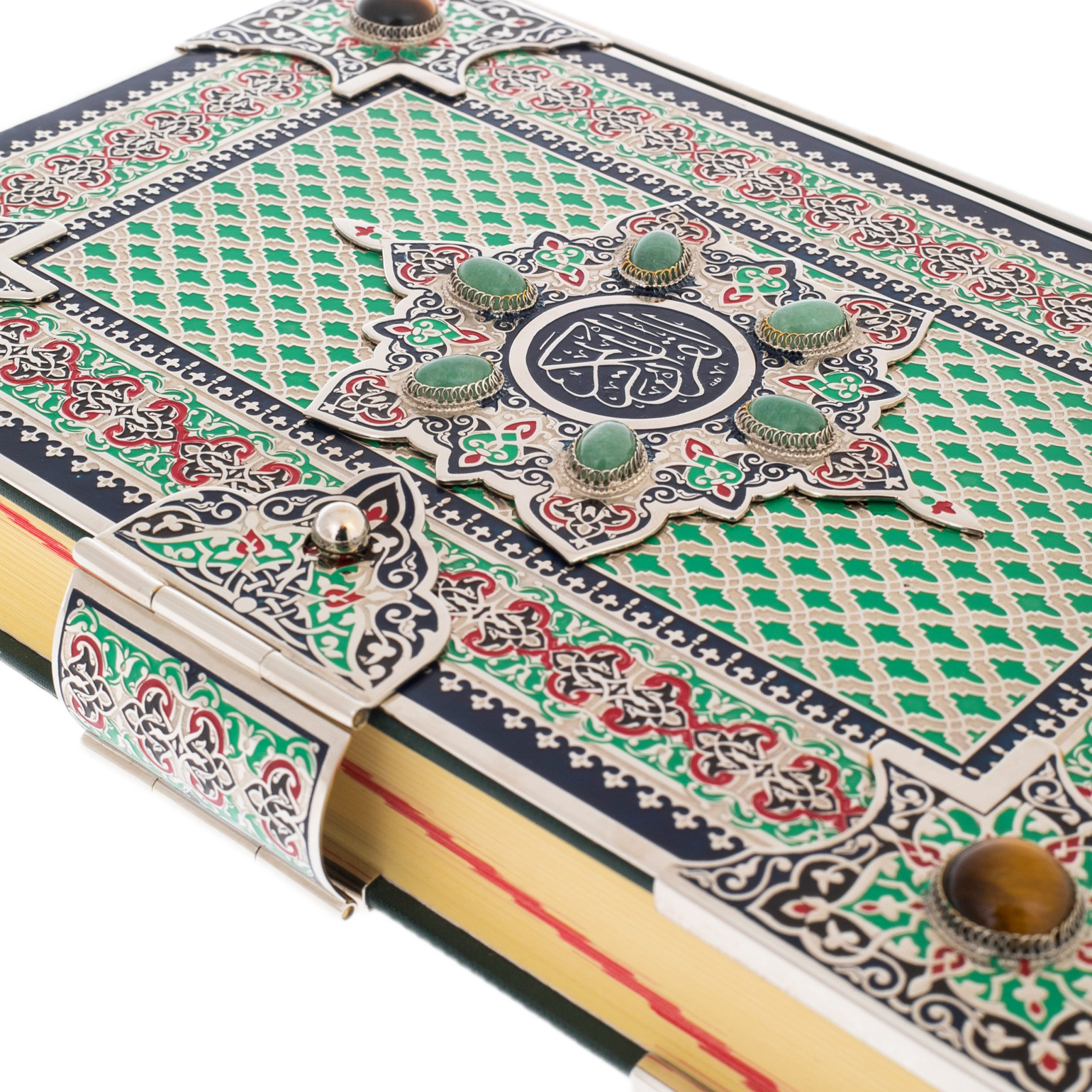 In the center of the composition is an exquisite medallion with calligraphic writing, surrounded by natural aventurine inserts. These stones, like a scattering of morning dew drops, symbolize purity of thought and blessing. They are enclosed in carved silver frames, complemented by the finest engraving, creating a play of light on each face. There are ornamental borders with intricate patterns around the perimeter of the cover, reminiscent of the carved mosaics that decorated the ancient palaces of the East.