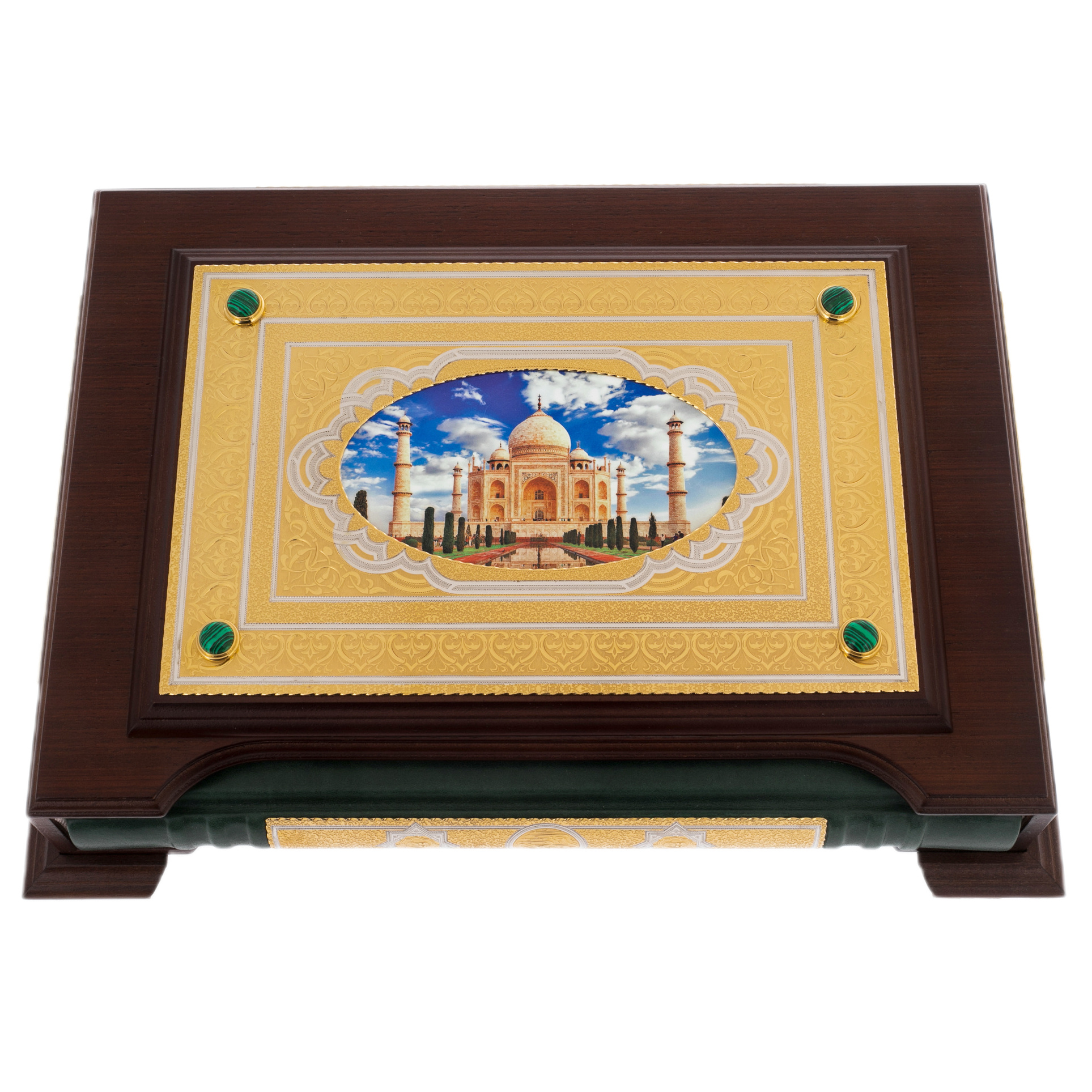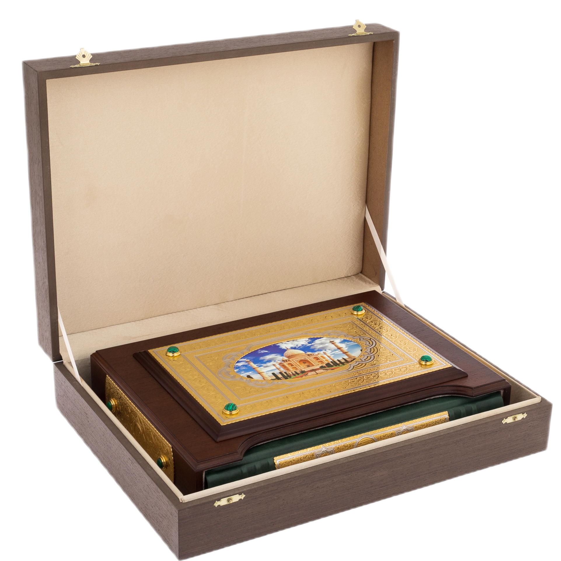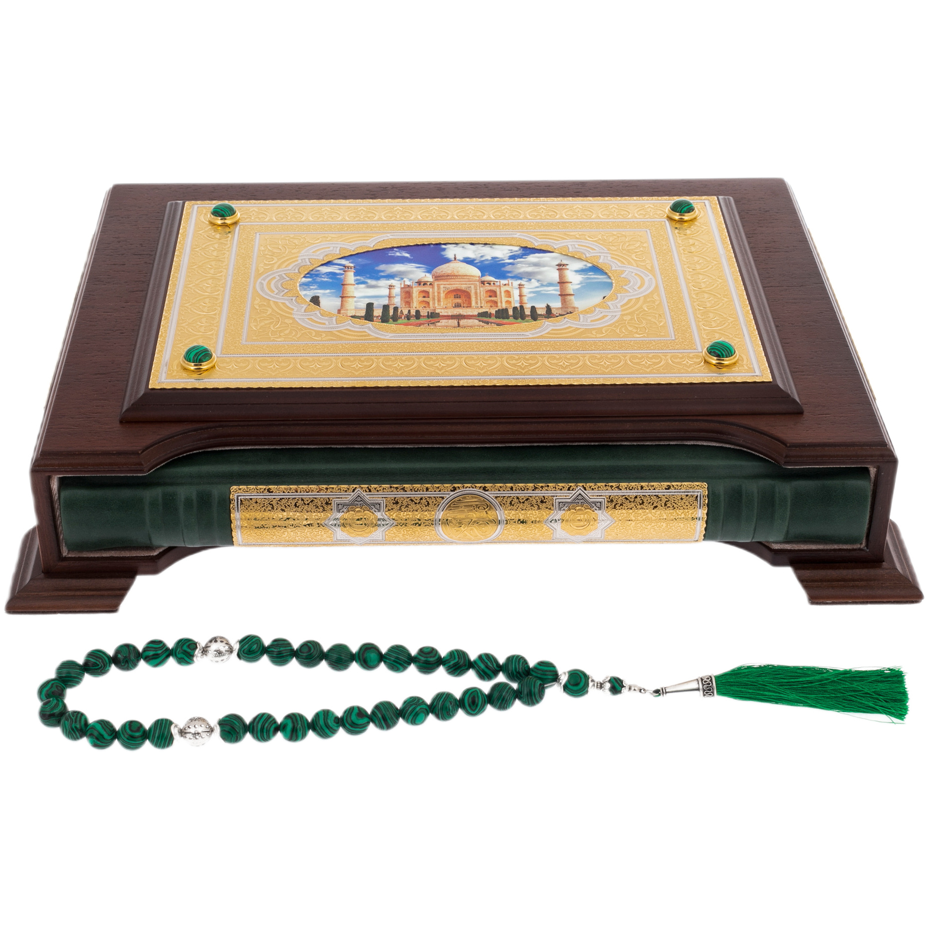 A gift edition of the Koran, decorated with gold and painted in the spirit of the Zlatoust engraving, will be a welcome gift for Muslims in honor of religious holidays. The book in an expensive leather cover comes in a pencil case made of natural walnut wood inlaid with malachite. The set includes a luxurious emerald-colored rosary made of malachite.