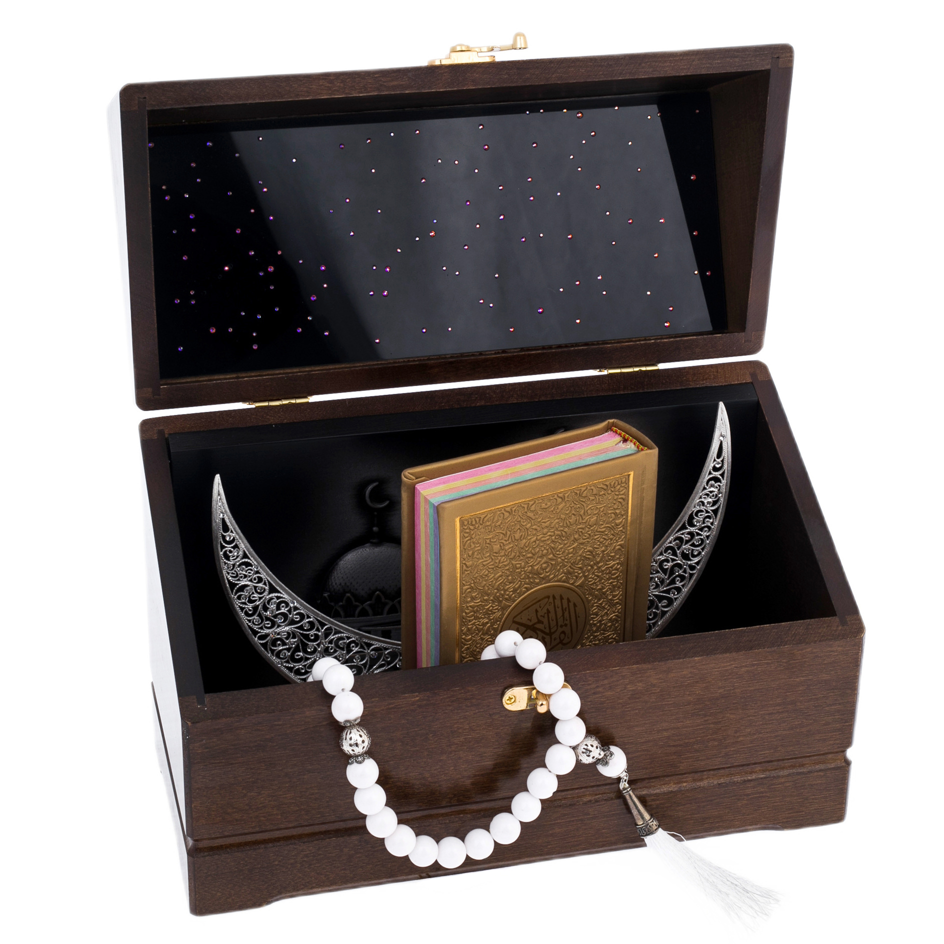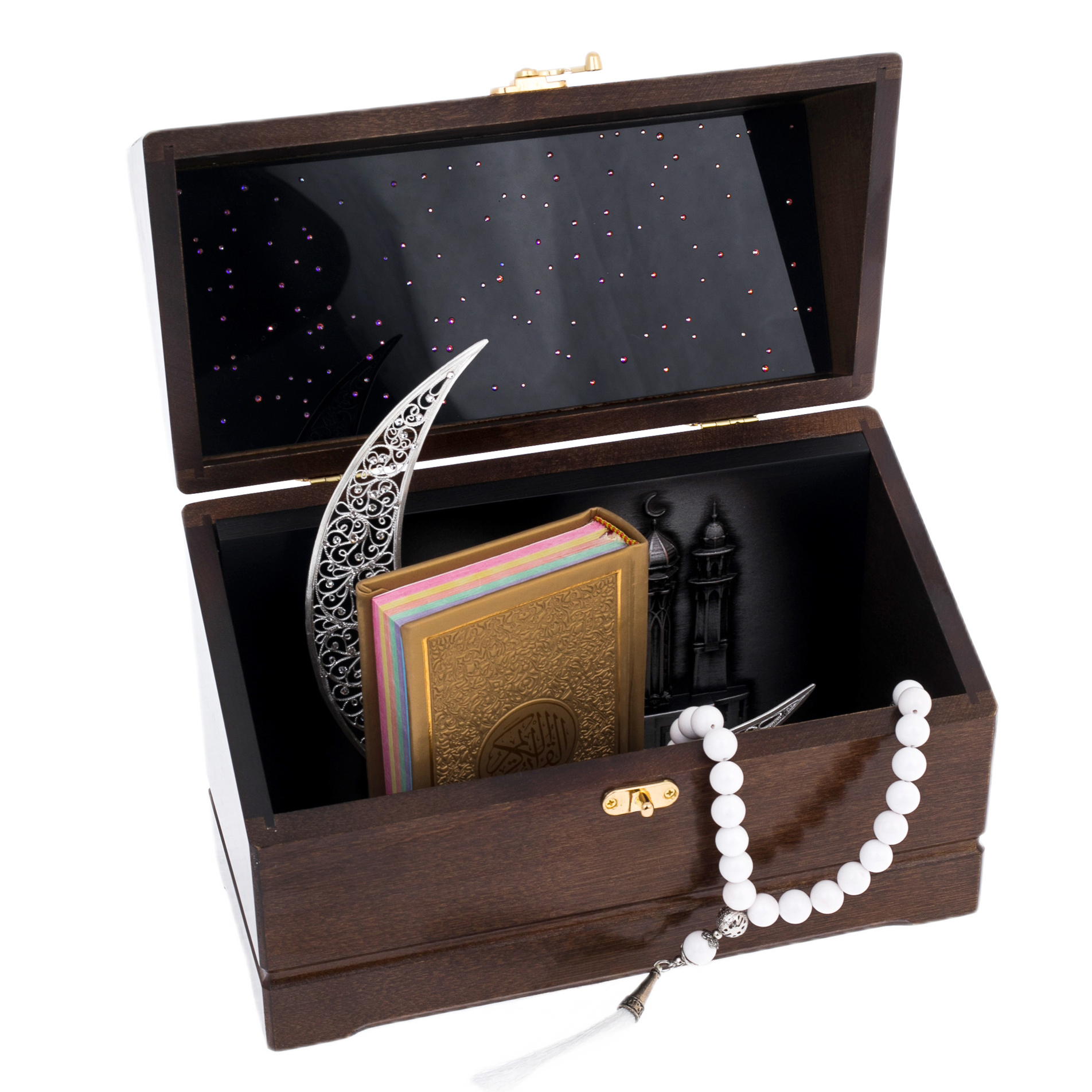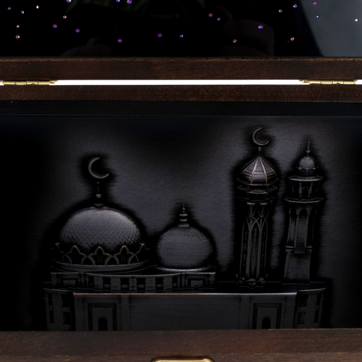 Открывая шкатулку, владелец будто переносится в иное измерение — инсталляция внутренней крышки с сияющими звездами и силуэтом мечети погружает в атмосферу священного ночного безмолвия. Ажурный полумесяц, отлитый в восточной технике с тончайшей филигранью, дополняет образ небесного свода, контрастируя с матовой глубиной фона. Четки из натурального камня лежат поверх священного текста, не только украшая, но и подчеркивая духовную значимость момента — каждое зерно, отполированное до шелковистого блеска, удобно ложится в ладонь, напоминая о ритме молитвы и внутреннего покоя.