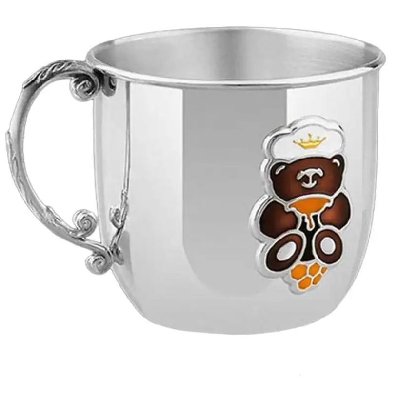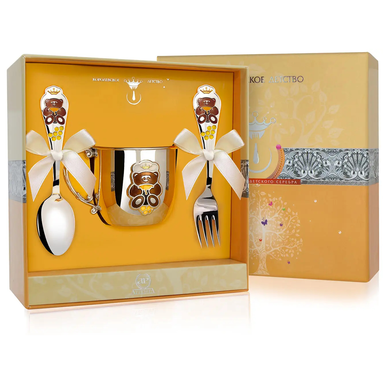 Set of children's silver CD "Mishka": fork, mug, spoon with gilding and enamel