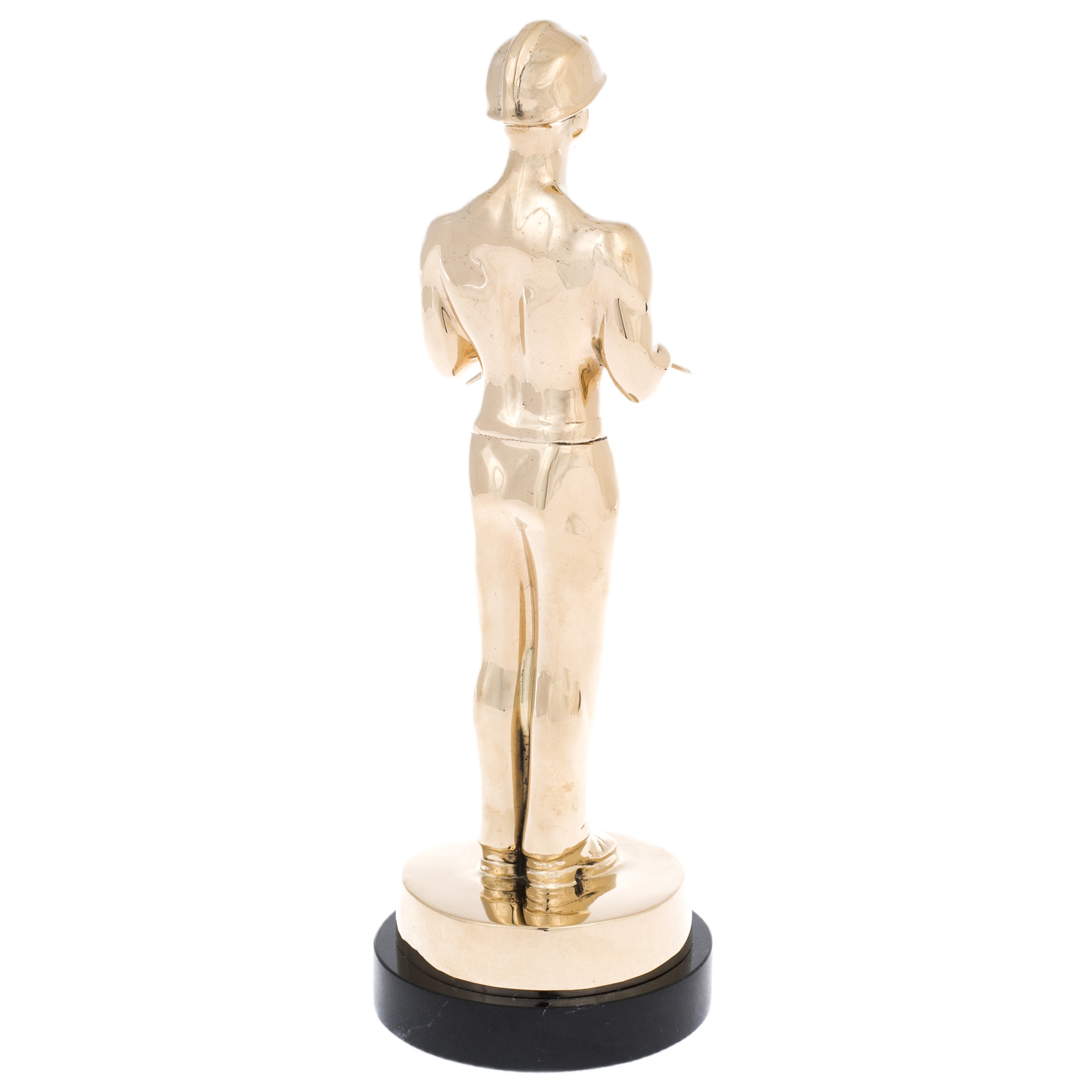 The smooth surface of the figure, polished to a mirror-like shine, reflects the play of light, which adds dynamics and grandeur to the sculpture. It rises above a black marble base, creating a contrast and accentuating the nobility of the metal. This combination of materials gives the composition its monumentality and completeness.