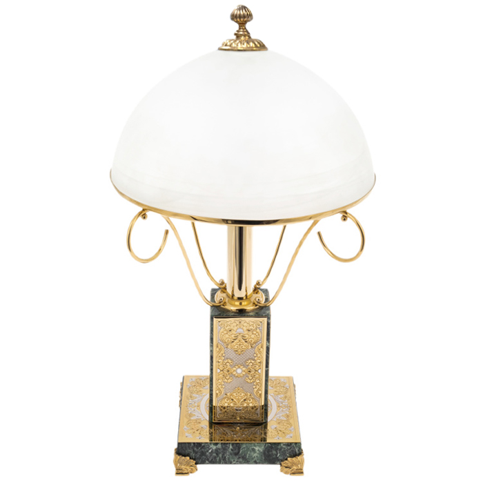 Настольная лампа «Статус» — не просто источник света, а предмет, который структурирует пространство, подчёркивая его значимость и вкус владельца. На основании из змеевика — камня, ассоциирующегося с силой, мудростью и долголетием — возвышается колонна, декорированная золотыми панелями, гравированными в лучших традициях златоустовской школы. Металл буквально сияет сквозь орнамент, создавая игру света и тени, в которой каждый виток — как штрих в фамильном гербе. Четыре ножки в виде стилизованных акантов подчеркивают архитектурность формы и придают конструкции устойчивую уверенность.