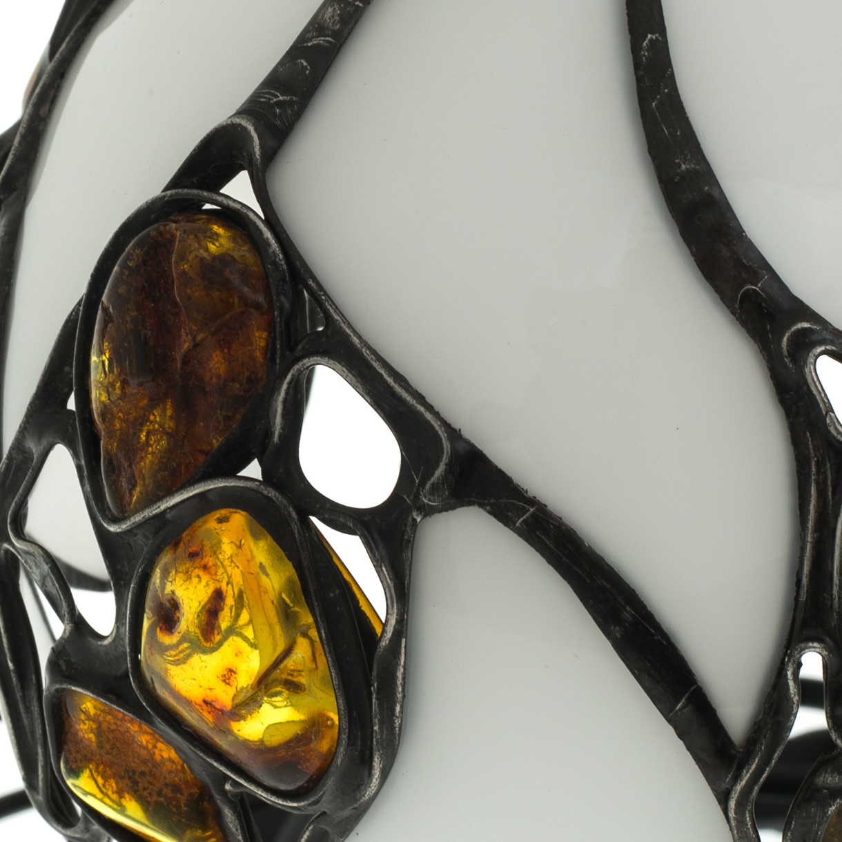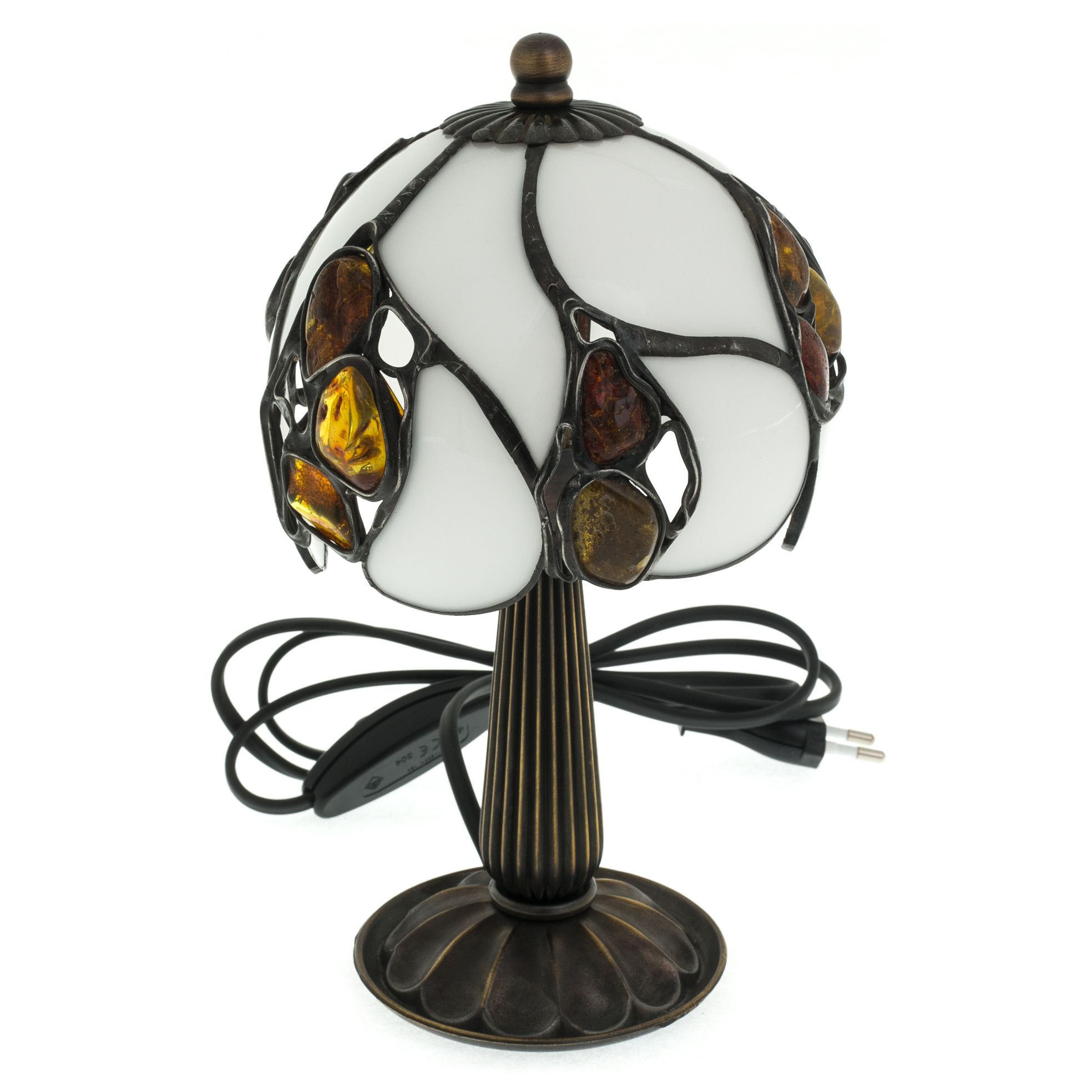 The stylish table lamp is made of bronze by the method of artistic casting. The intricately decorated lampshade is lined with large pieces of amber and inserts of white stained glass.