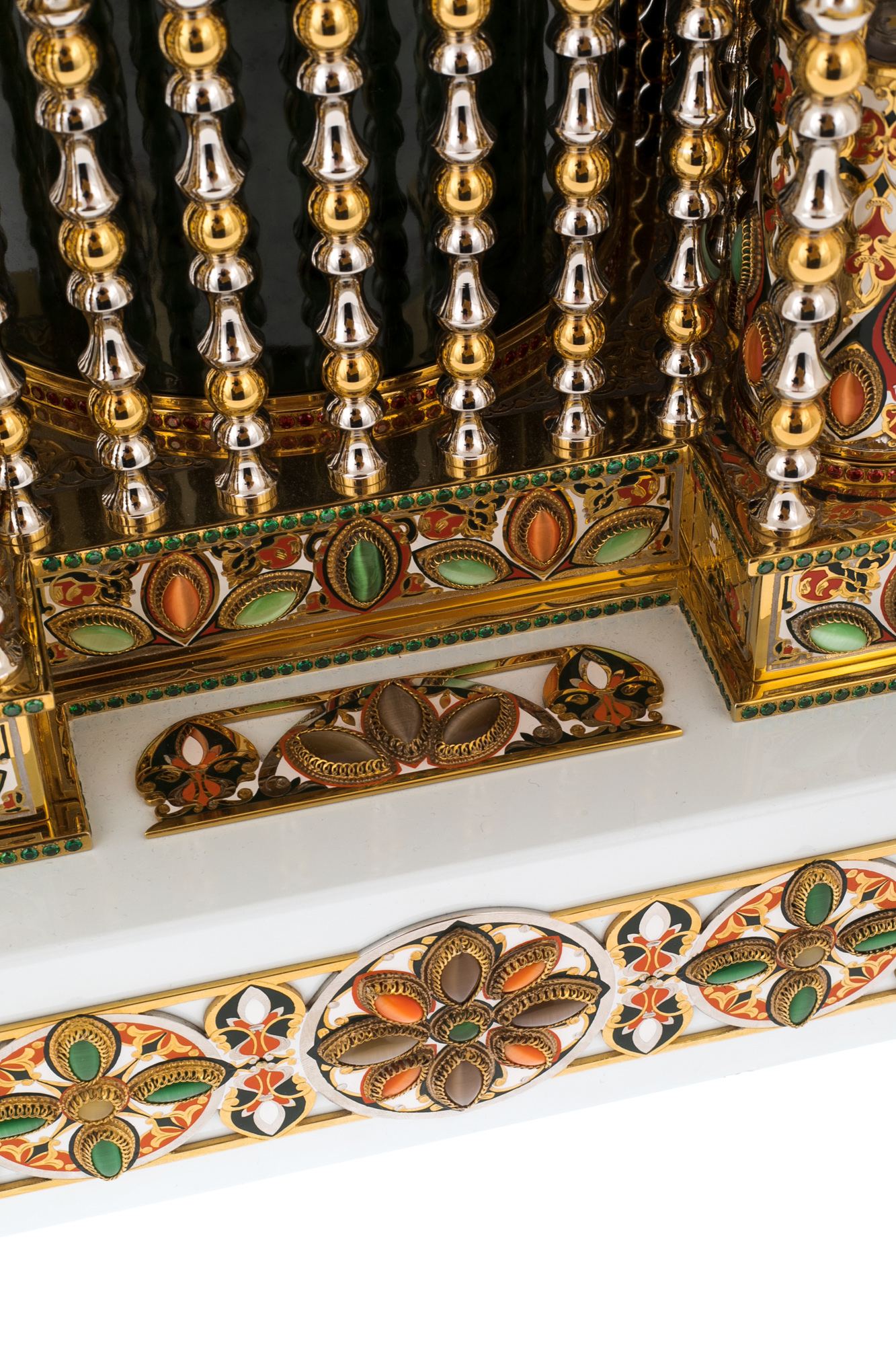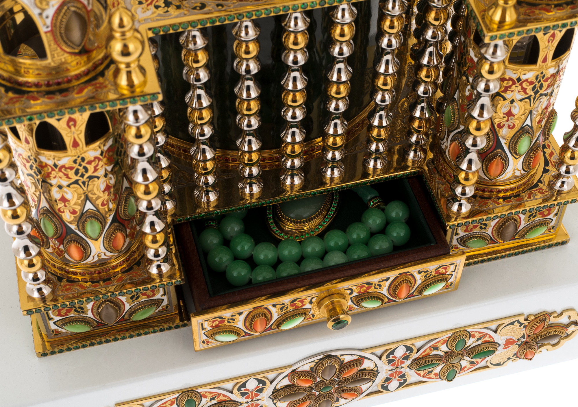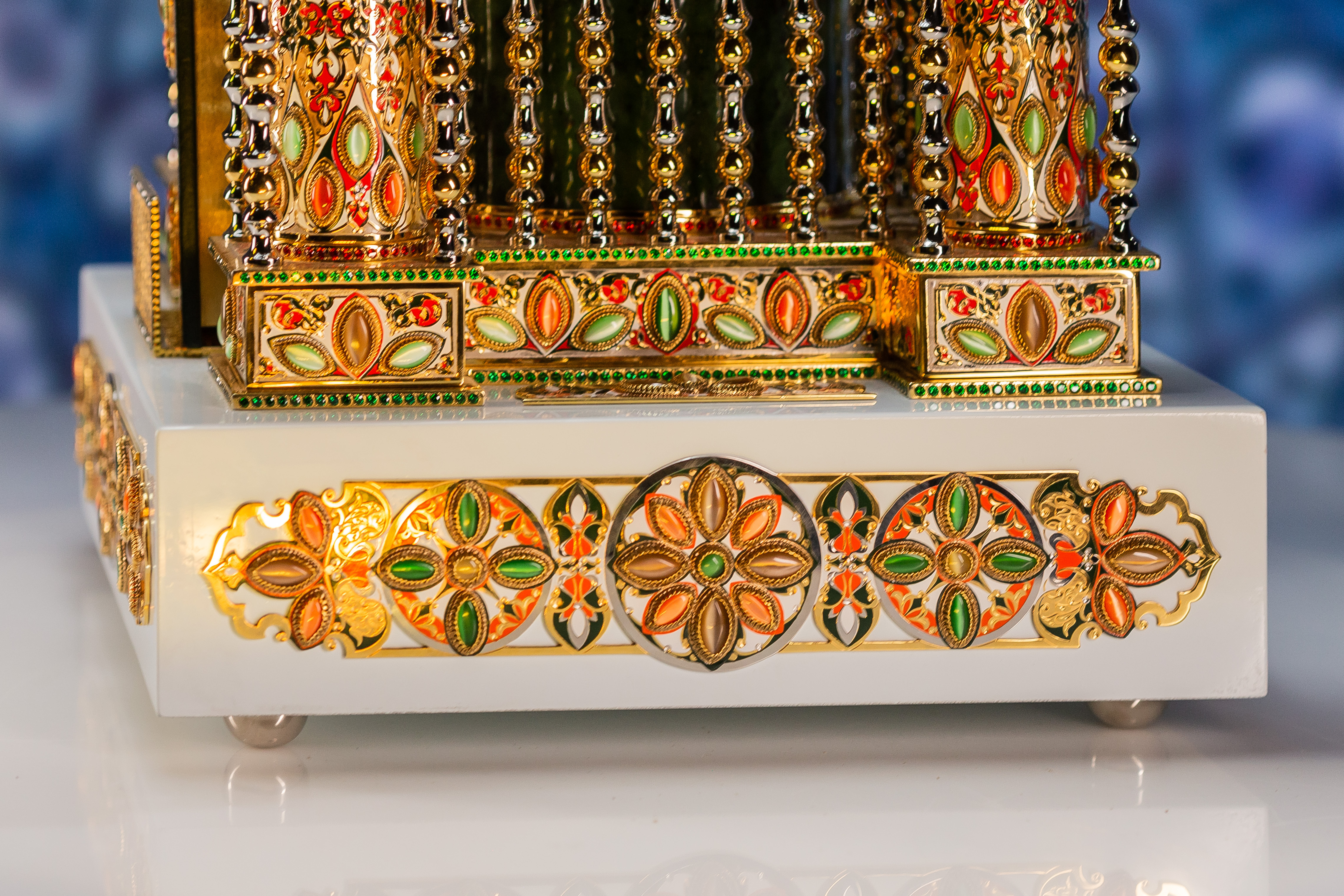 Materials:non-ferrous metal, nickel, jade, tiger's eye (250 pcs), garnets, green alpanite (2280 pcs).