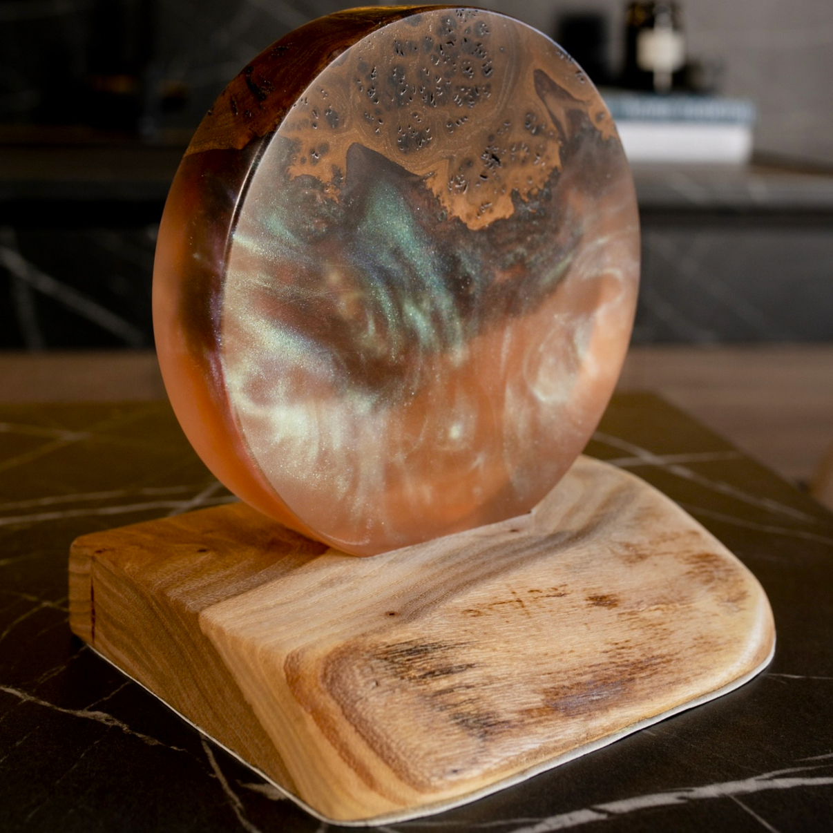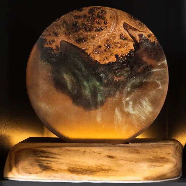 Умный ночник из дерева и эпоксидной смолы от RE Present — это гармоничное сочетание природной эстетики и современных технологий. Корпус изделия выполнен из премиальных пород дерева, дополненных прозрачной или цветной эпоксидной смолой, создающей уникальные визуальные эффекты. Каждый ночник является уникальным произведением искусства, благодаря естественной текстуре древесины и игре света внутри смолы.