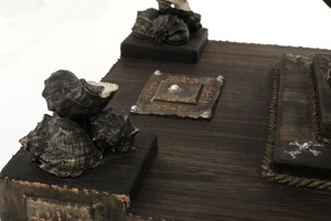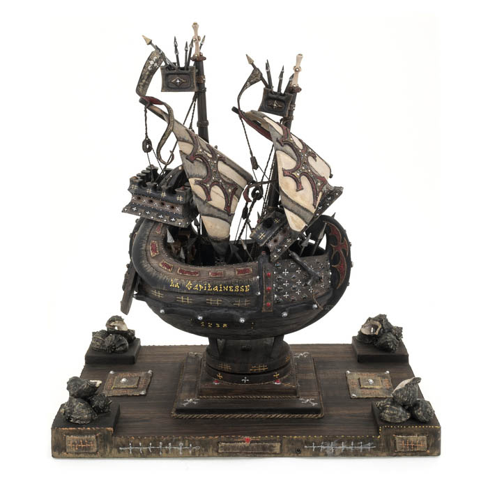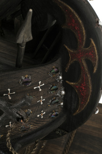 The sails and furniture are made of mammoth tusk. Many elements are made of copper, silver, potali and genuine leather. Hand-woven linen was used for the rigging. The product is inlaid with sea and river pearls, mother of pearl, amber, corals, agates and jet.