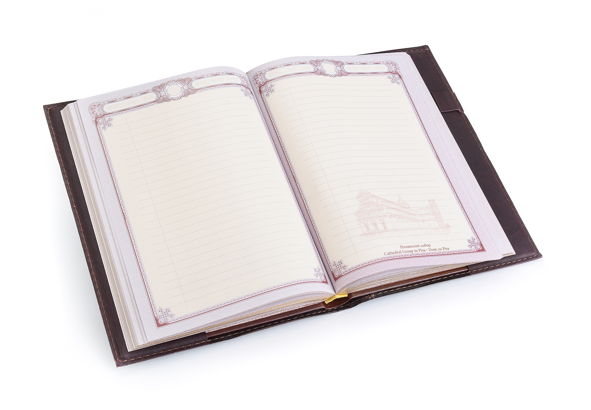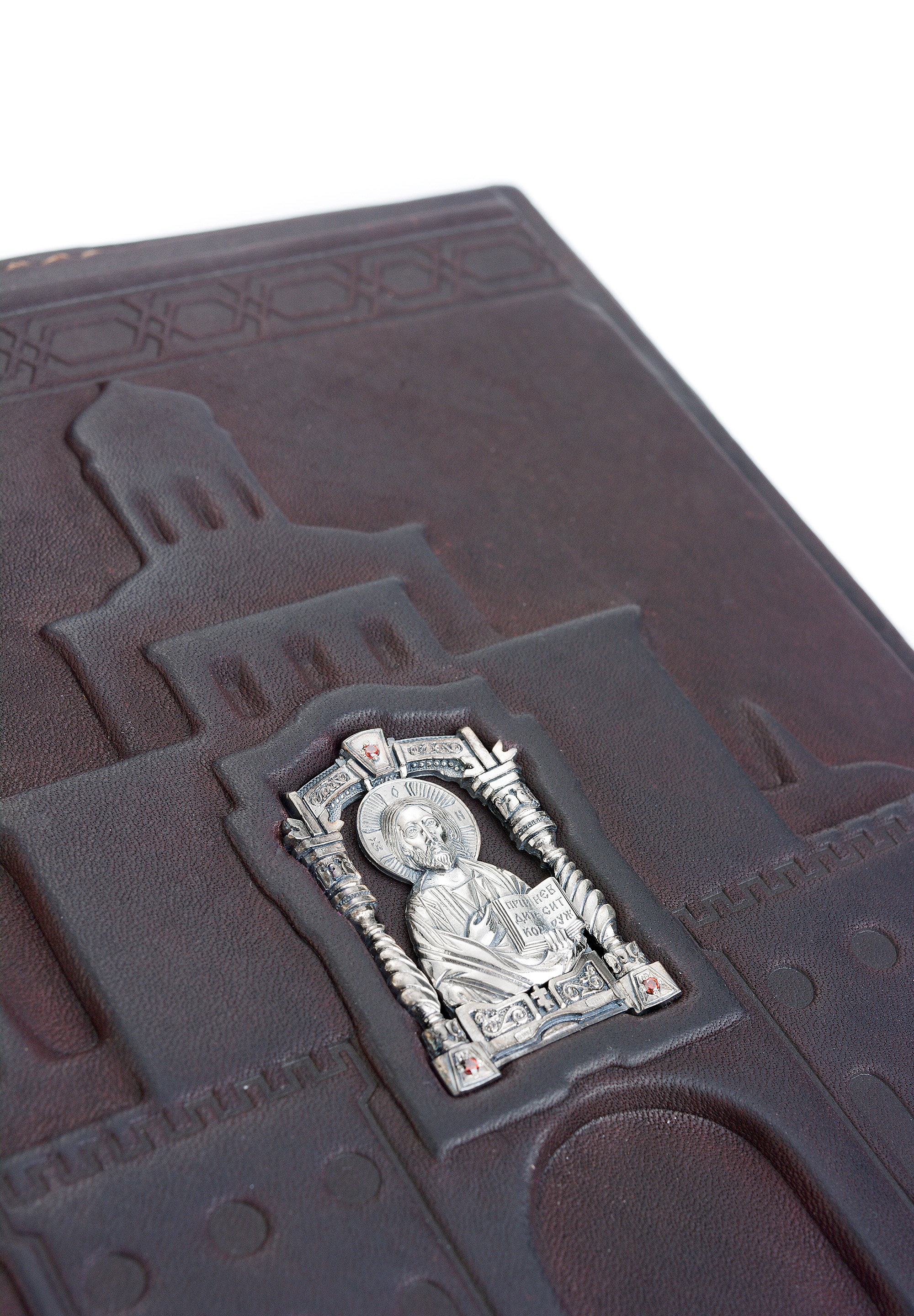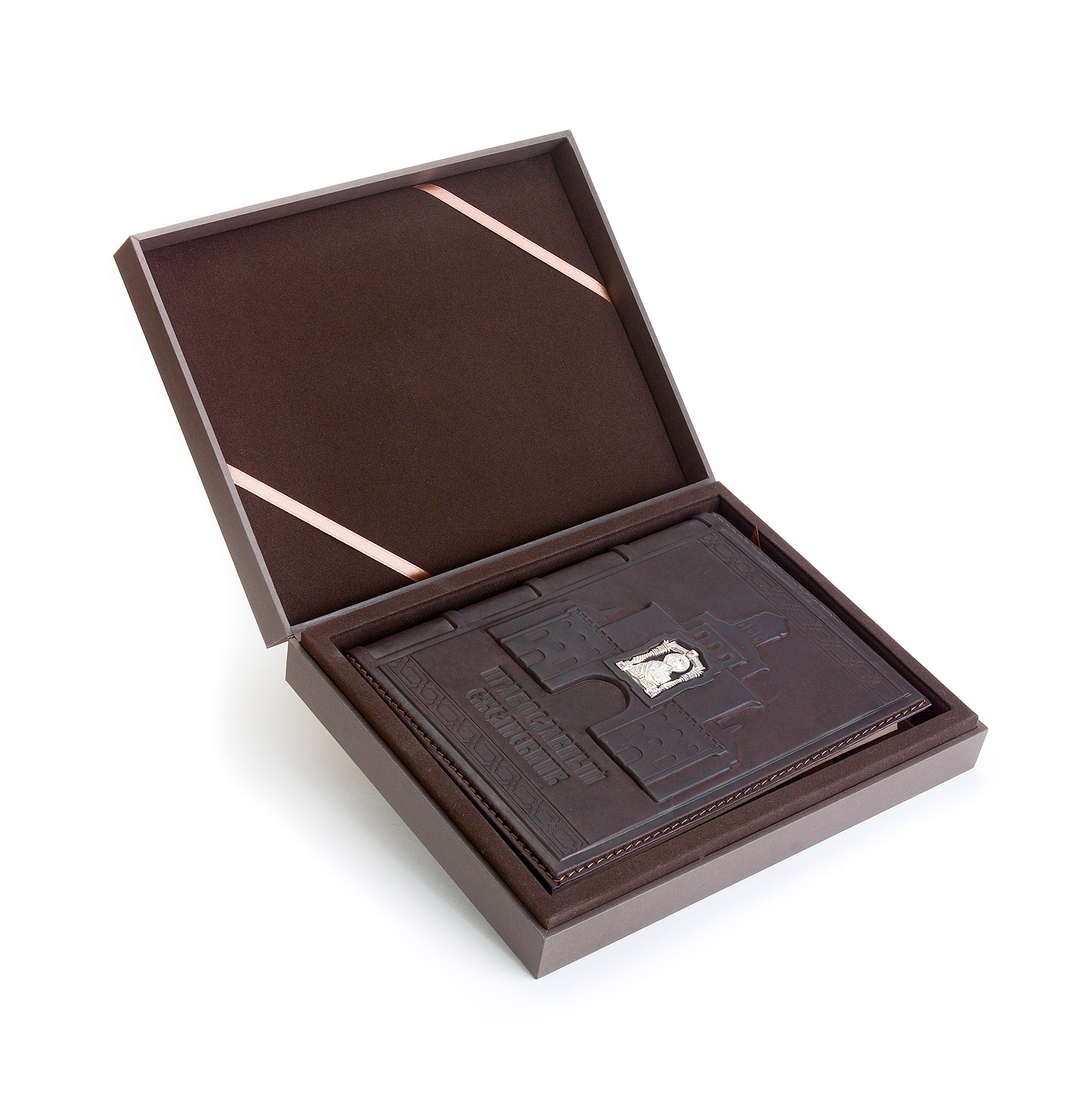 Design features: the binding is handmade from calfskin and decorated with a silver icon of St. Nicholas the Wonderworker. The block is decorated with a three-sided gold edging. The stamps of the workshop and assay chamber are located on the central element of the composition of the diary.