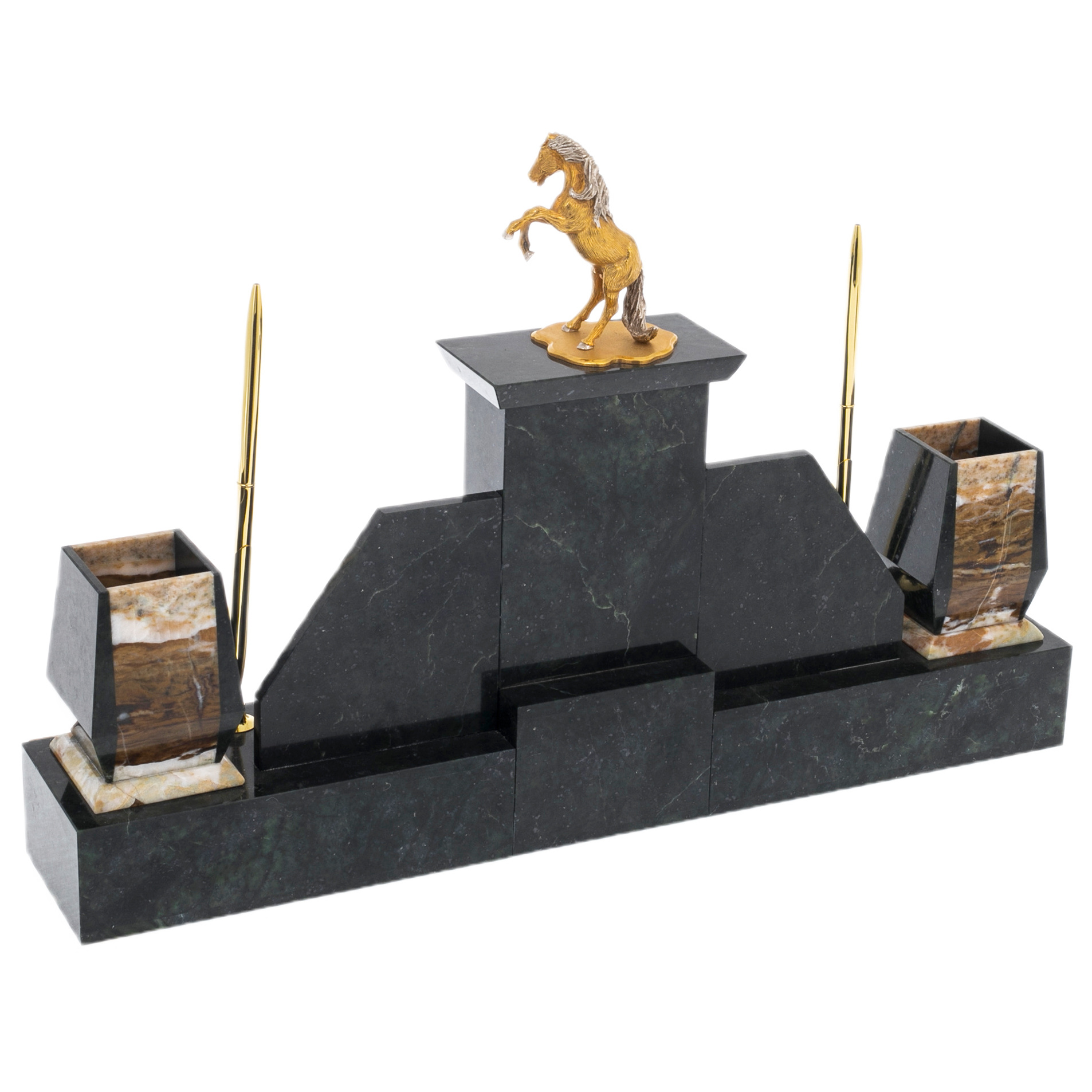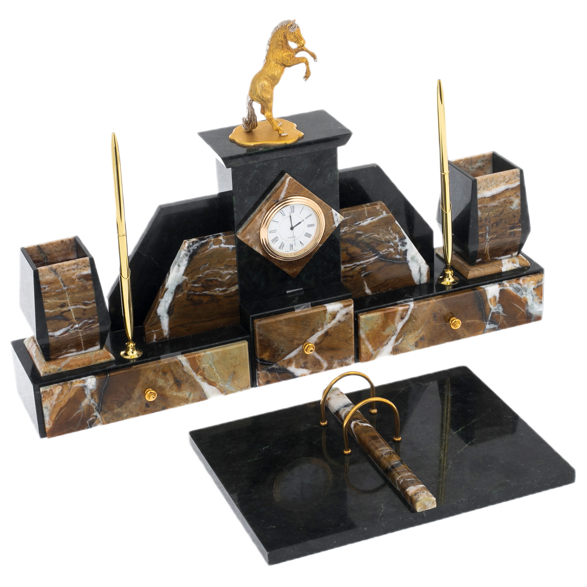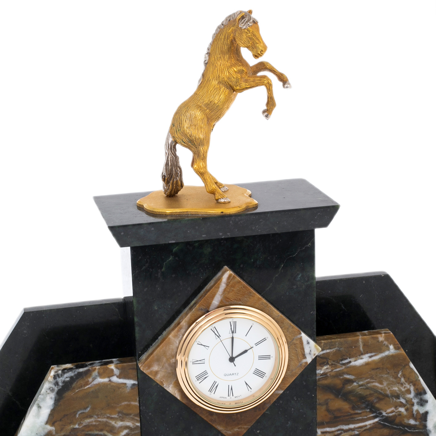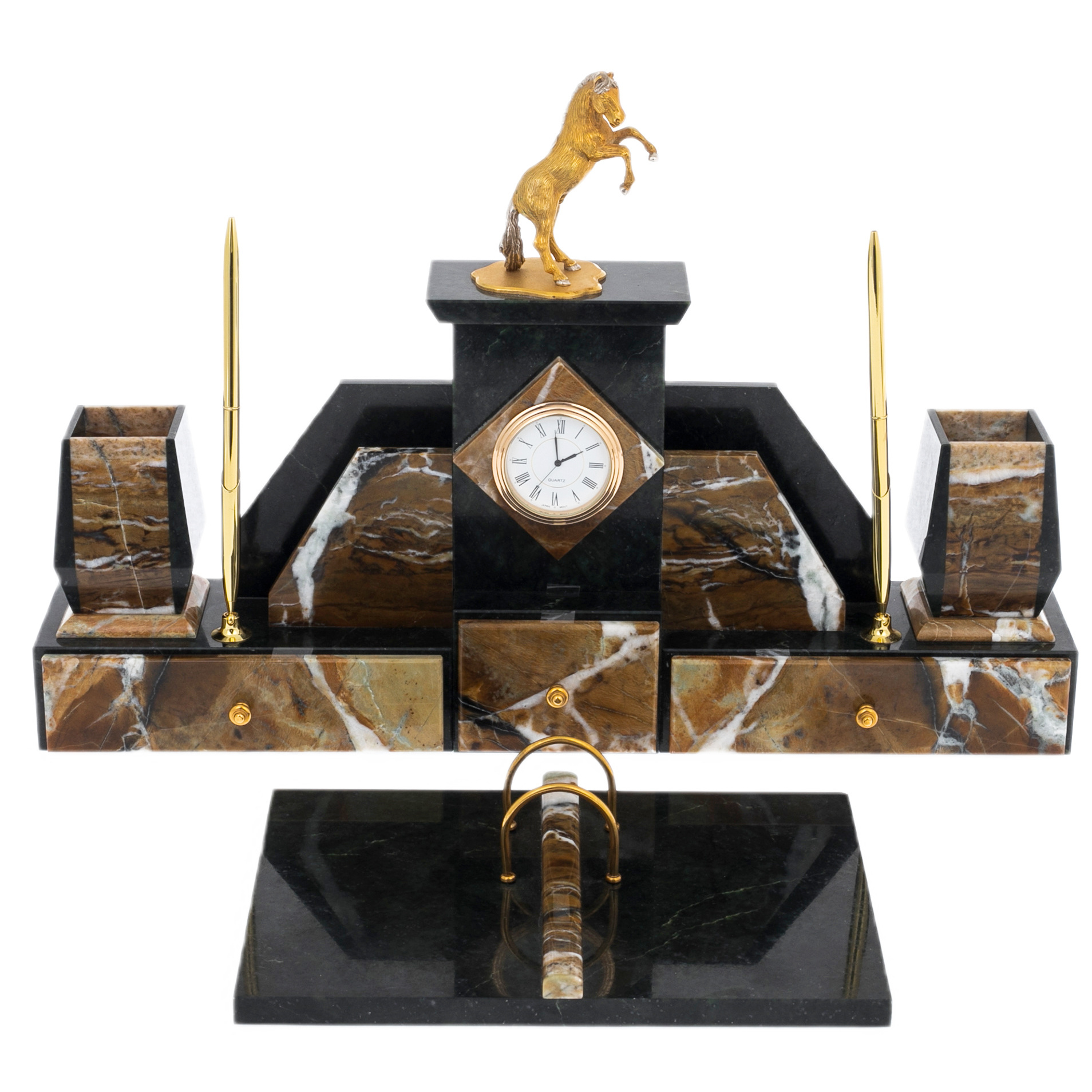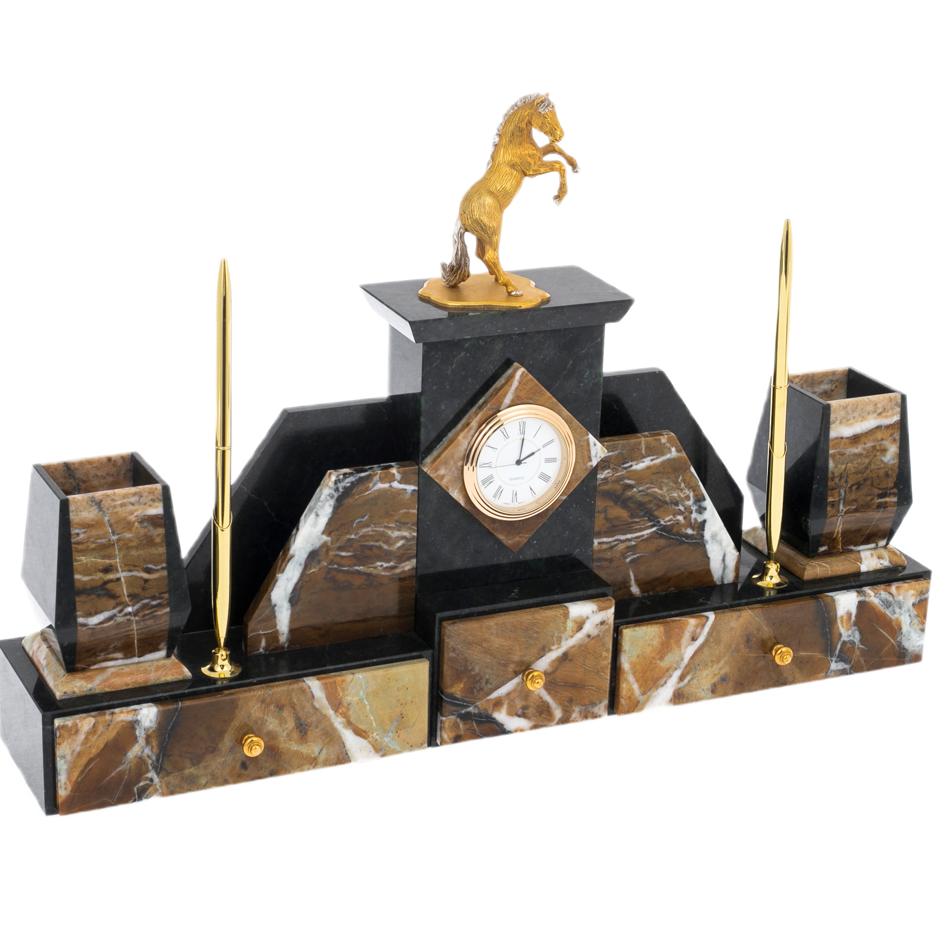 The "Horse" writing set is a sculptural and compositional ensemble in which each element serves not just as a functional task, but as an expression of the will, movement and strength contained in the material. In the center stands a column with a clock inscribed in the geometry of a diamond, topped with the figure of a rampant horse, a symbol of impetuosity of thought and independent character. The gilded statuette conveys the tension of muscles, a sharp sweep of the mane, and the energy of the moment, frozen in bronze. Below it is a Roman—marked dial, harmoniously integrated into the architecture of the entire complex, emphasizing the importance of time in the work of a strategic thinker.