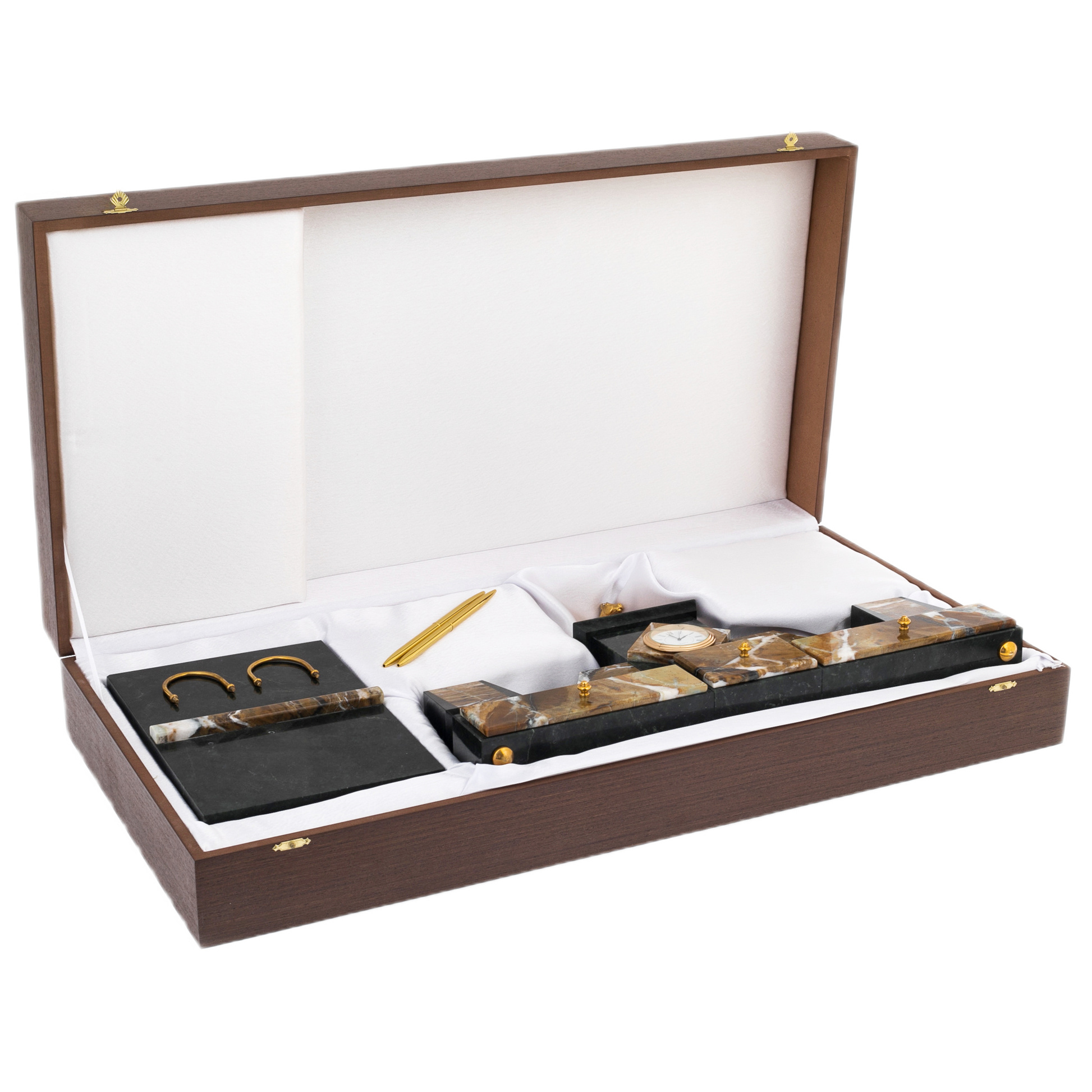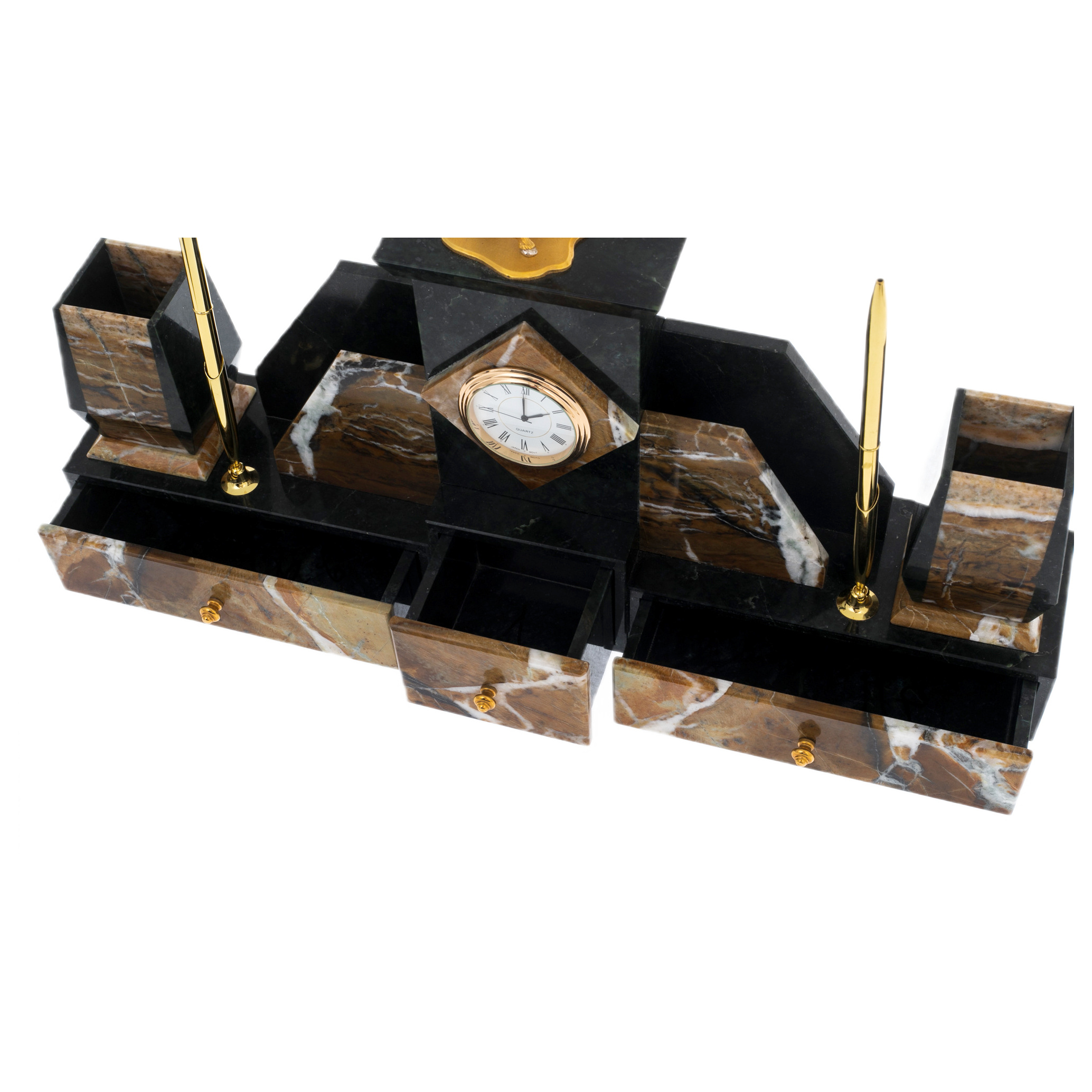 The case of the set is made of a rare shade of jasper, rich brown with white and gray veins resembling marble lightning bolts. Contrasting black gabbro diabase gives the composition the stability and visual heaviness needed for status. Two pencil cups, gold pen holders, spacious drawers and a business card holder form a strict, symmetrical structure built like the facade of an impregnable fortress. Each face is polished to a mirror—like shine, and the details are thought out to the millimeter, creating a sense of completeness and order.