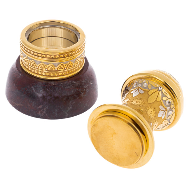 The case, cast from gilded metal, sparkles like the dawn sun, framed by paintings with the finest ornaments. Every detail of this jewelry breathes luxury: the carved patterns recall the ancient traditions of decorating objects of royalty, and the matte sheen of gilding emphasizes the exclusivity of the execution. The top of the snap is topped with a jasper insert.