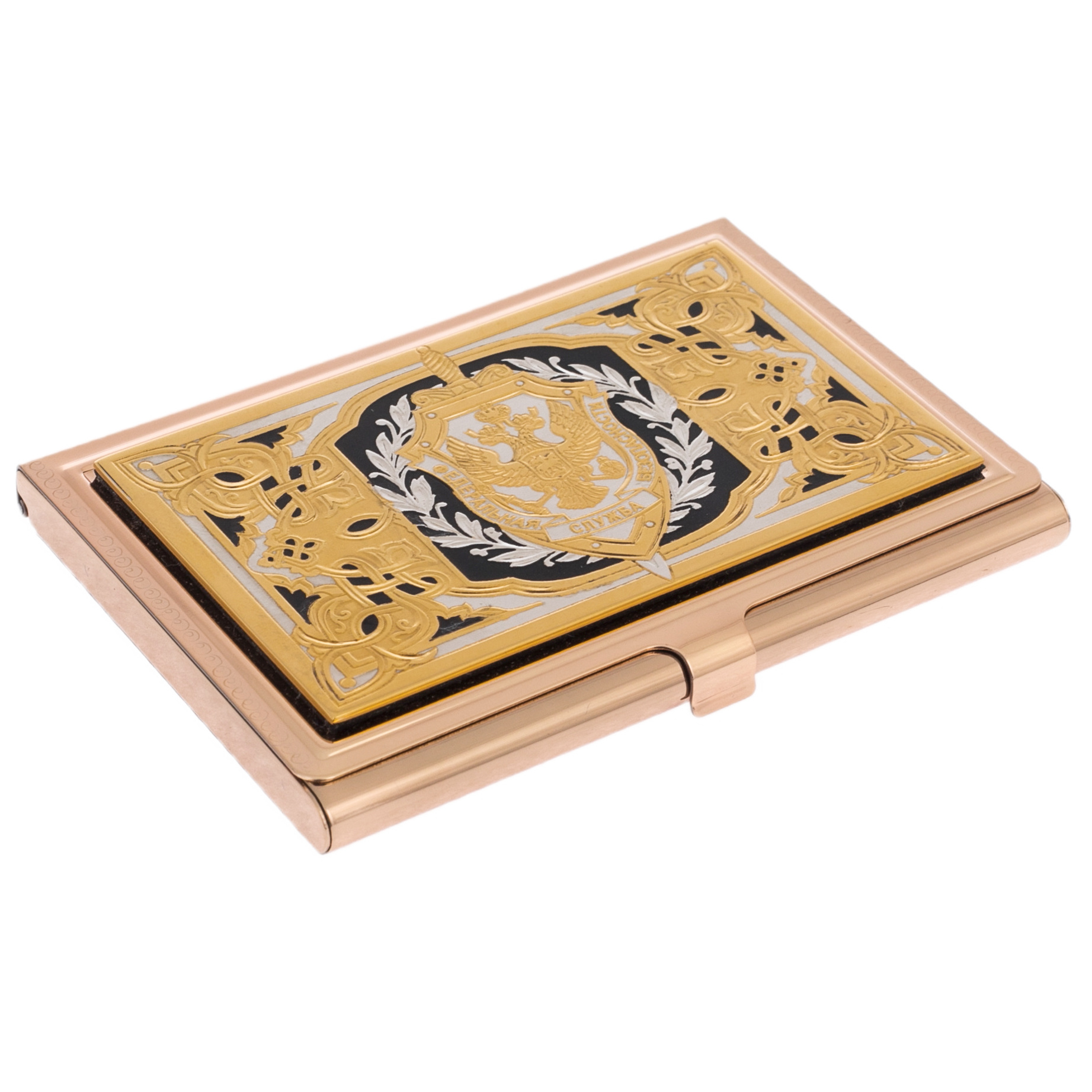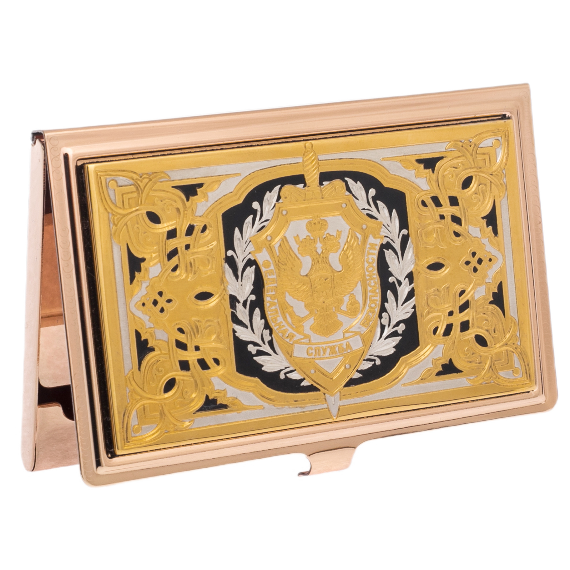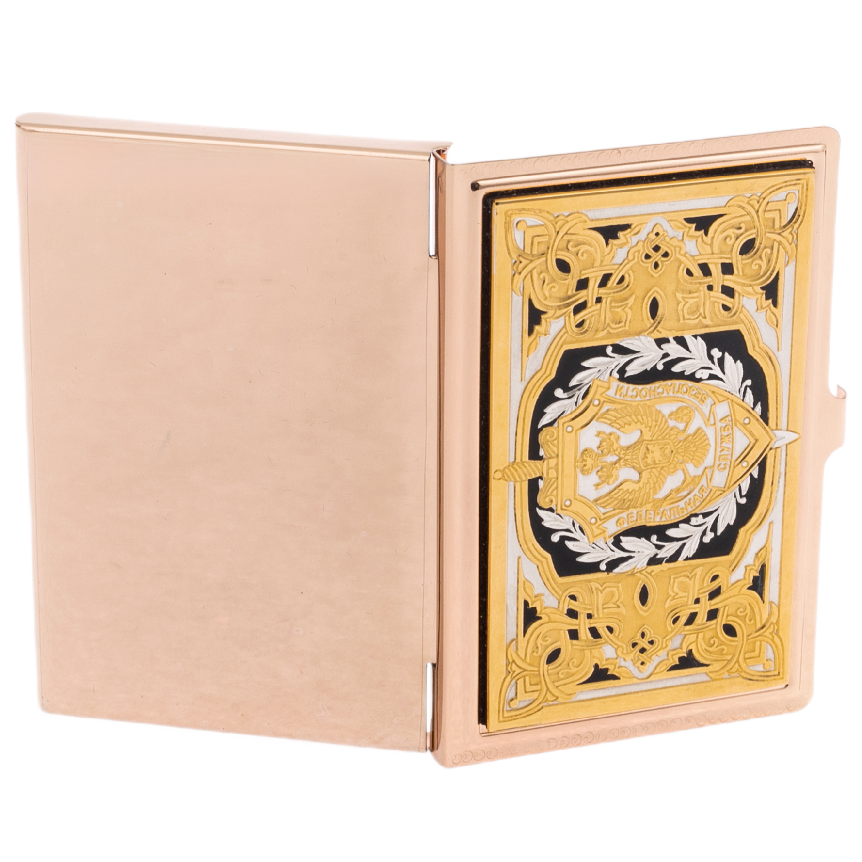 The business card holder, made in the technique of Zlatoust engraving on metal, appears to be the true embodiment of status and sophistication. Its sleek, noble metal body with a delicate pink hue carries an aura of sophistication. An amazing composition is placed on the lid, combining black, gold and silver colors, forming an emblem inspired by the symbols of the Federal Security Service.