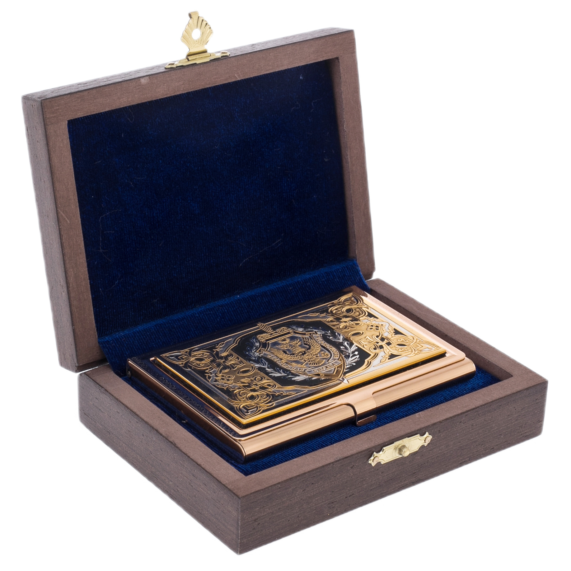 The product is packed in a luxurious wooden box, upholstered inside with deep blue velvet. This presentation enhances the impression of the gift, making it not only a functional accessory, but also a source of pride for its owner. This business card holder is the choice of those who value perfection in detail and strive to emphasize their status in every gesture.