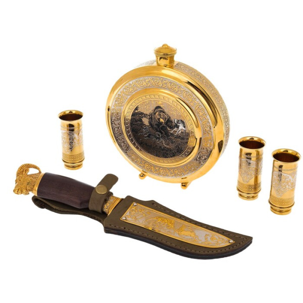 Hunting set "At rest" with a knifeHunting set "At rest" with a knifeExclusive hunting kits are made in the technique of Zlatoust, a national art craft. Knives, stacks and hunting accessories, covered with platinum, gold, silver and nickel, are decorated with engravings by Zlatoust masters. After an elegant pattern is applied to the polished surface, the product is dried in an oven and subjected to etching, after which the pattern becomes embossed. The secrets and subtleties of this art are passed down from generation to generation, so unique artistic products are unique. Hunting kits can be decorated with a gift inscription with the best wishes to the hero of the occasion.