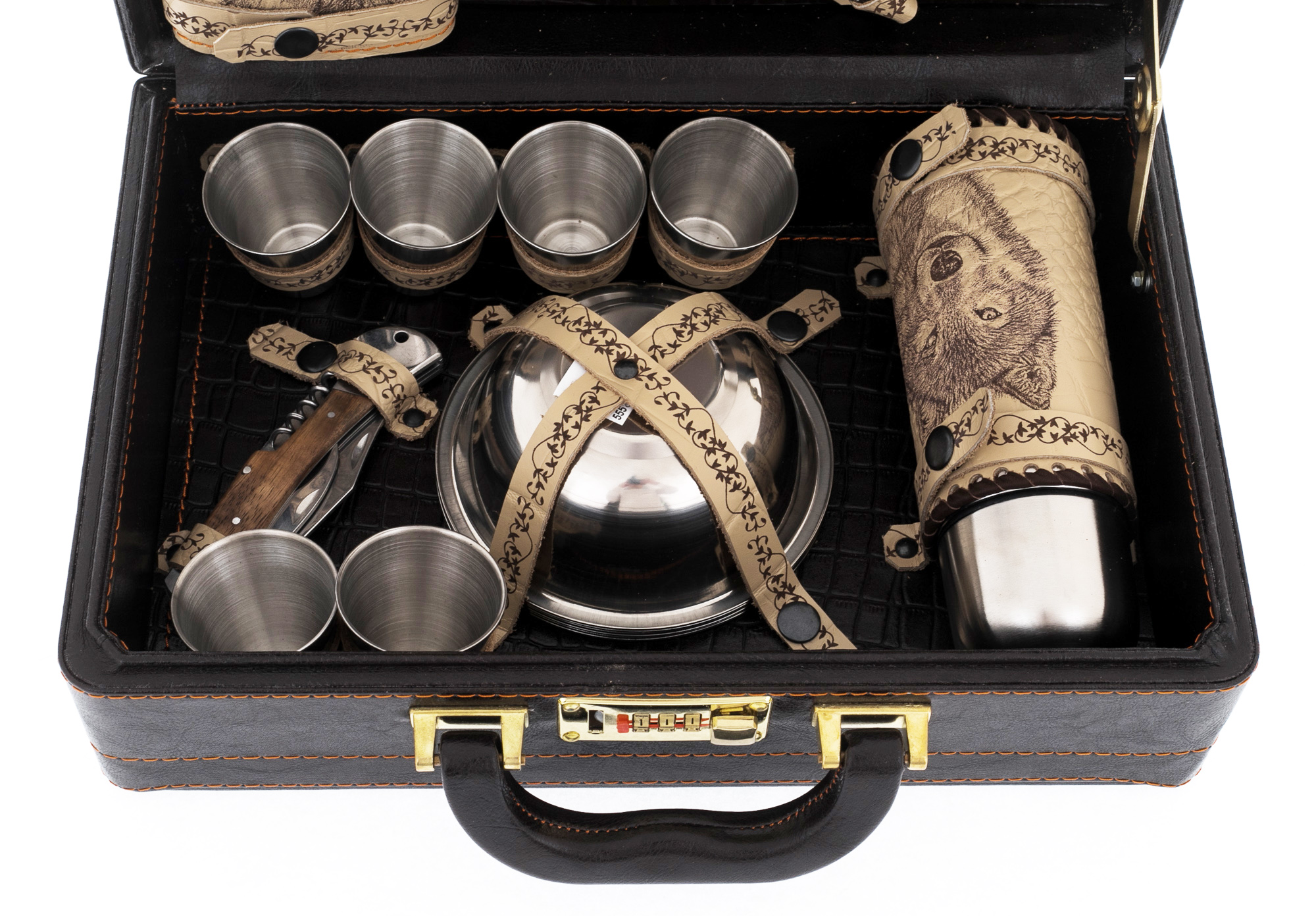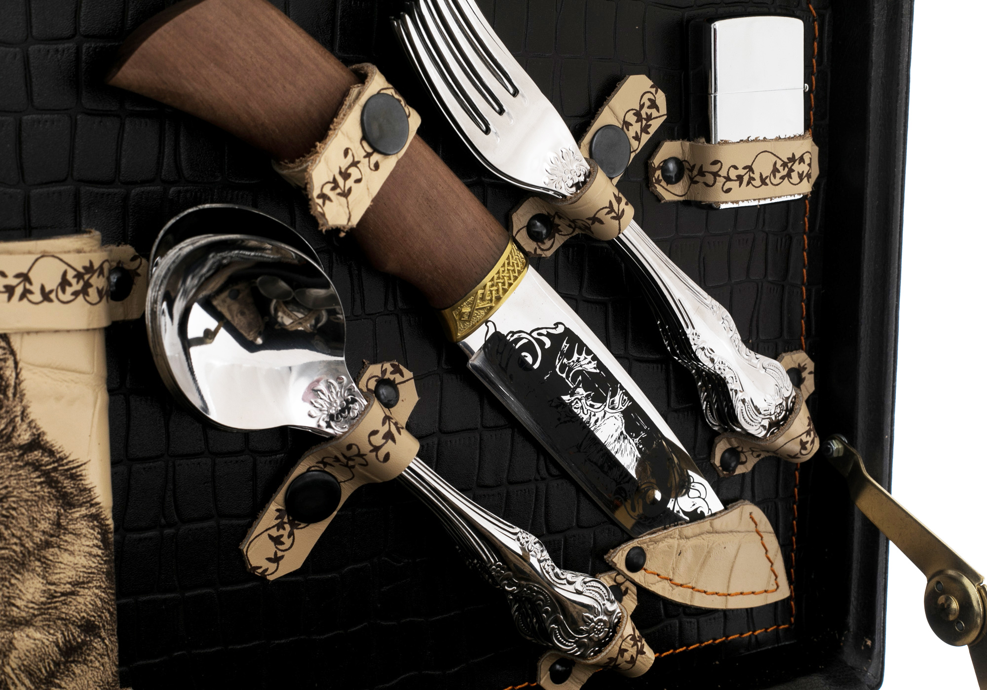 Materials:eco-leather case with interior trim, stainless steel tableware, stacks with nickel-silver coating, knife handle made of wenge and jewelry casting of nickel silver.