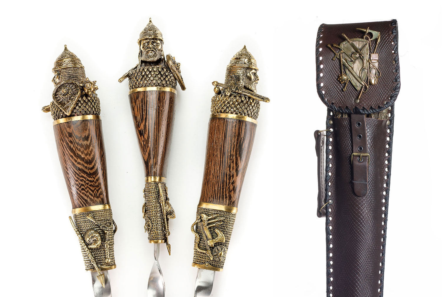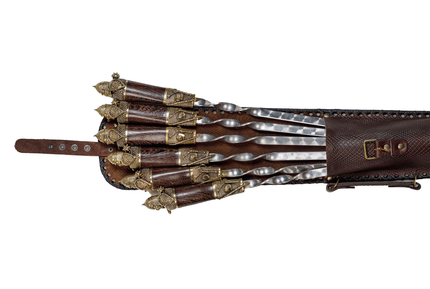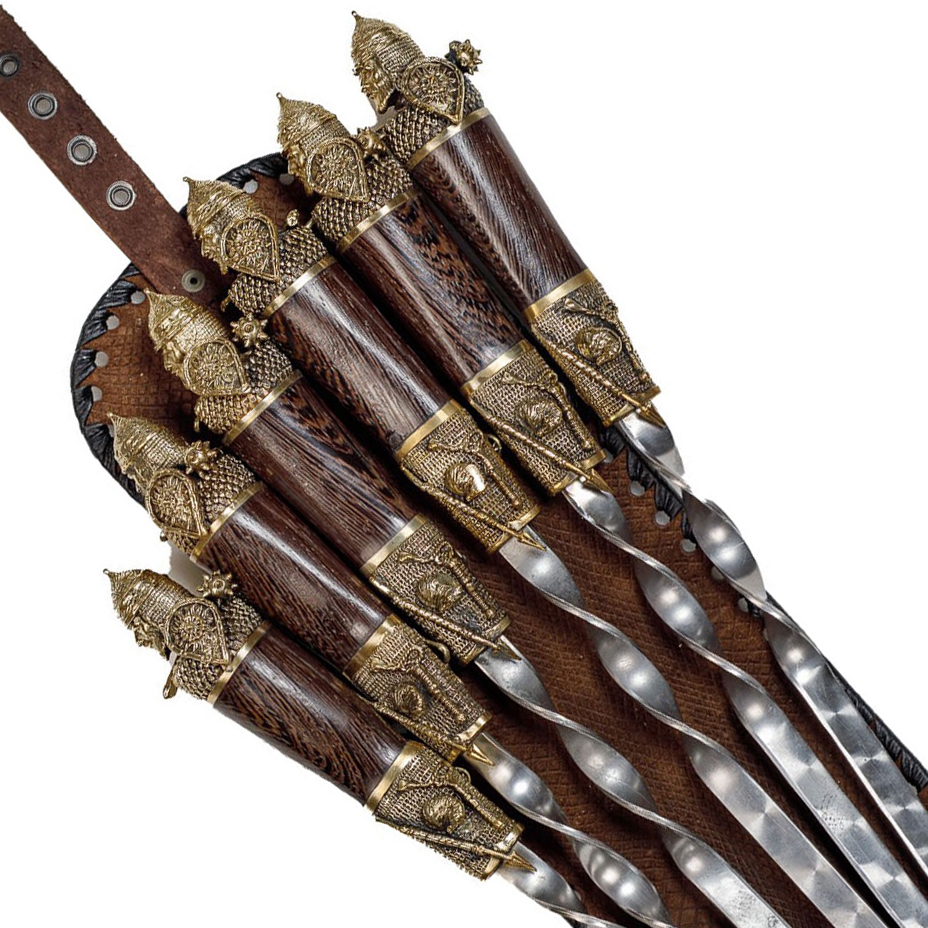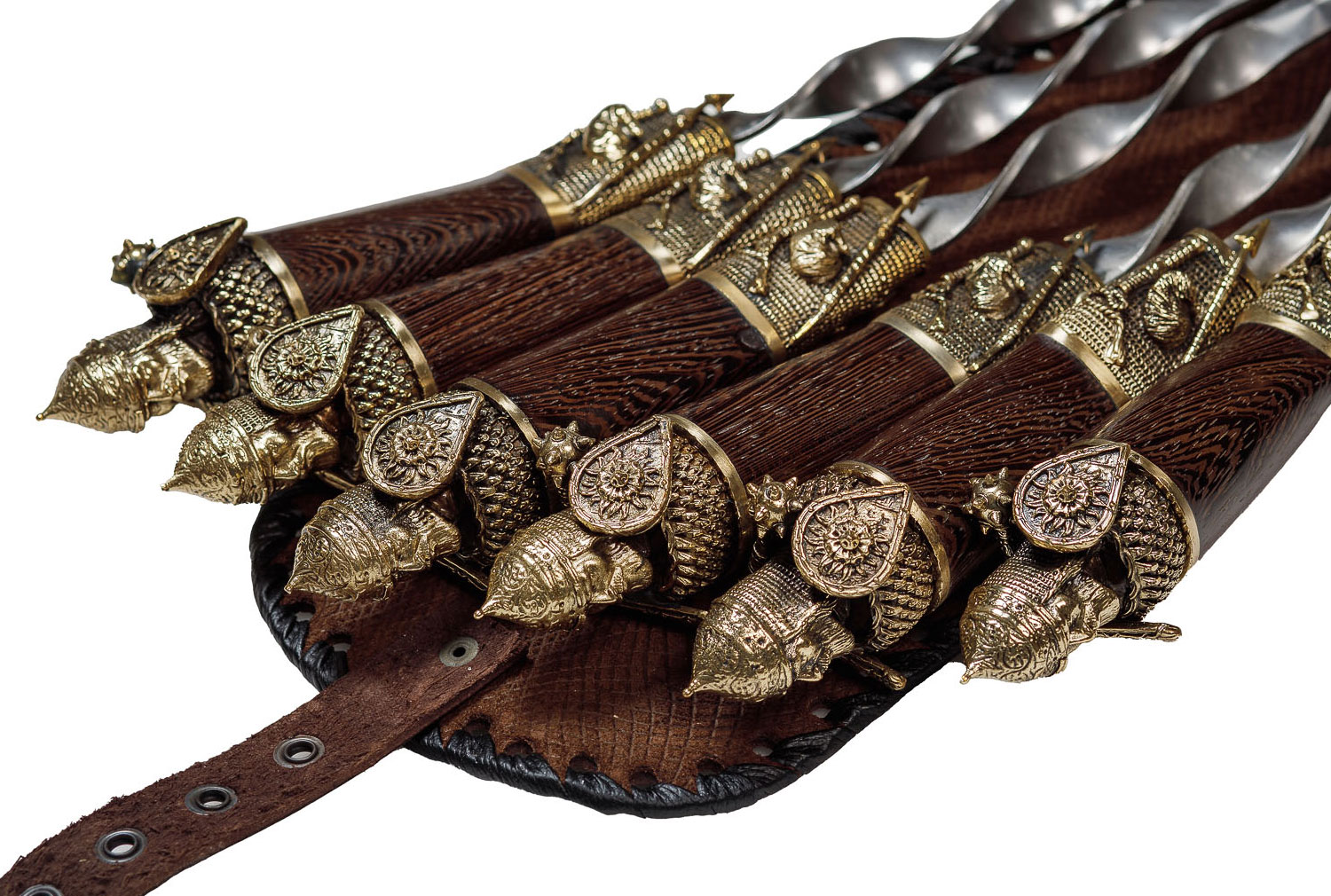 Materials:skewers - stainless steel; handle - wenge wood, bronze; quiver - genuine leather, bronze.